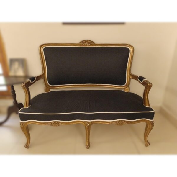 Material Solid Sheesham wood frame with jute fabric upholstery Condition Good Overall— Antique Gold Paint required in some places (pics attached). Filling required in a small area on one chair (pic attached) Dimensions (in inches) Length: Sofa: 47 inches Chair: 24 inches