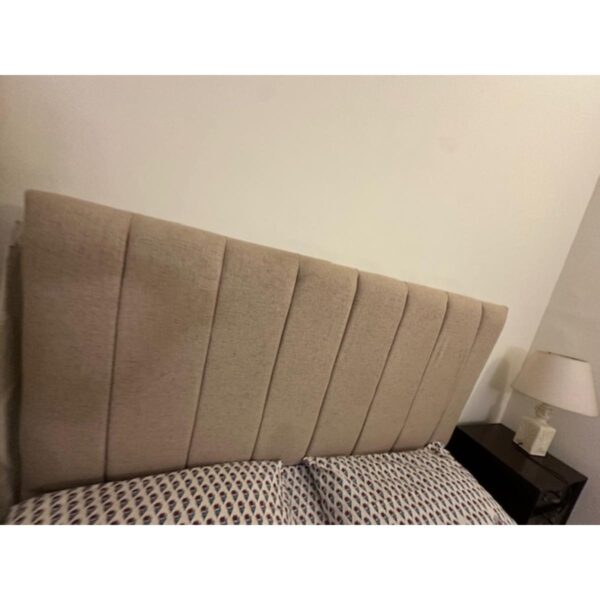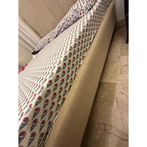 Material Queen bed: Wooden frame upholstered in beige fabric. Dressing table: Wood/engineered wood with laminate wood-grain finish and glass mirror Condition Bed: Upholstery has no tears or stains; bed legs show some wear and would benefit from polishing. Dressing table: Almost new; no marks or stains. Top drawer slips out but can be fixed by tightening the screws; legs can be polished for a like-new look. Dimensions (in inches) Length: Bed length: 82 inches Headboard length: 63 inches. Dressing table: 31.5 inches