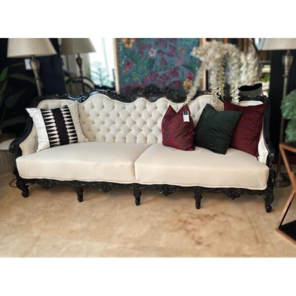 Material Cotton Fabric & wood Condition Gently Used Dimensions (in inches) Length: 3 Seater Length (arm to arm): 76” | 2 Seater Length (arm to arm): 55”