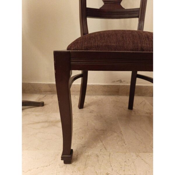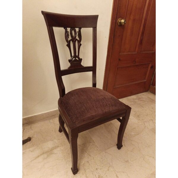 Material Sheesham wood & glass tabletop Condition Pre-owned; all chair fabrics need replacing and a light hand polish is recommended. Structurally solid based on inspection. Dimensions (in inches) Length: Chair: 18 in Table: 56 in