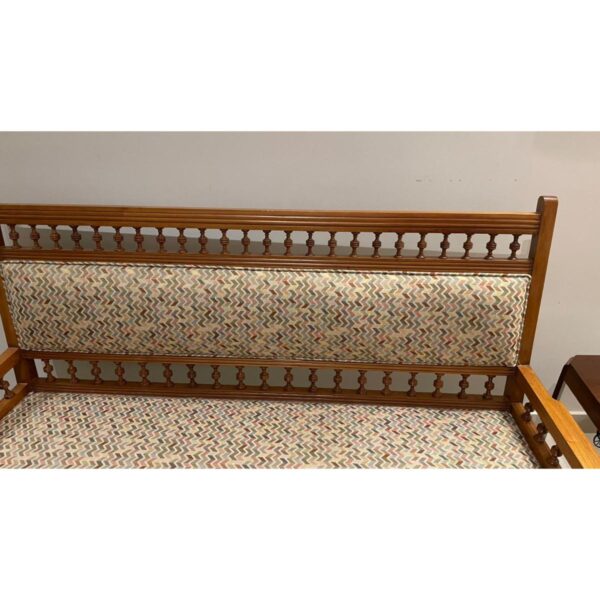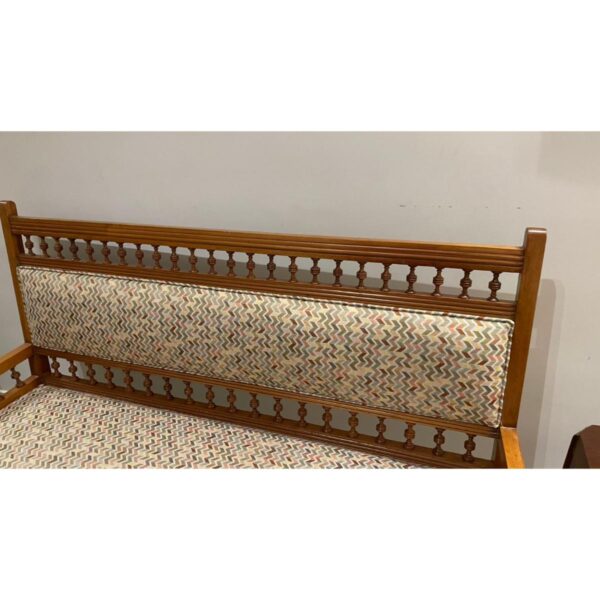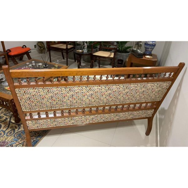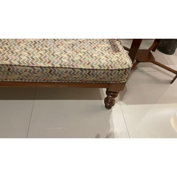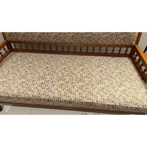 Neatly crafted 3-seater sofa with a wide seating area, elegant rolled arms, and intricate dark wood carving along the base. Upholstered in a soft beige fabric, it comes with decorative floral-patterned cushions that add a touch of luxury and warmth to any living space.