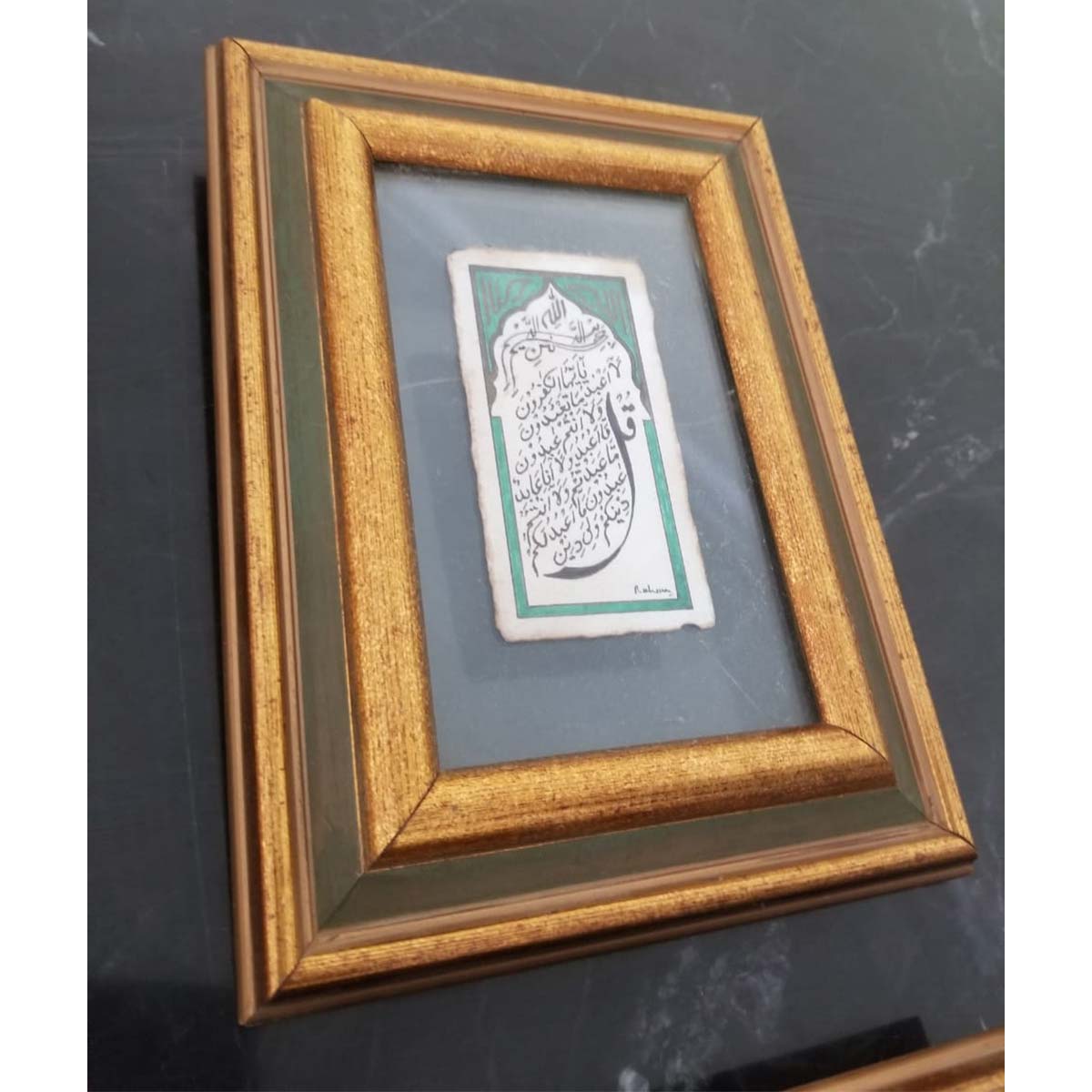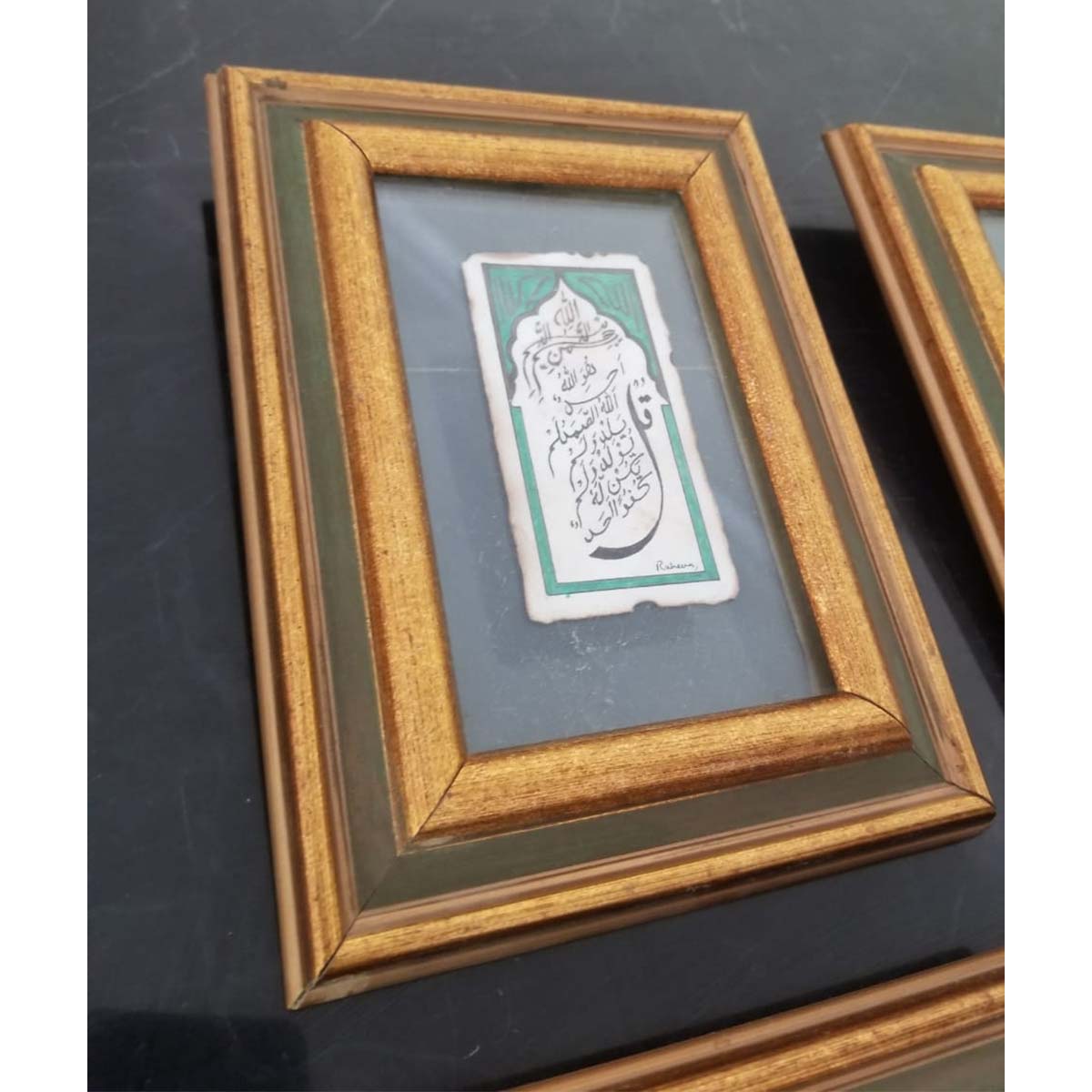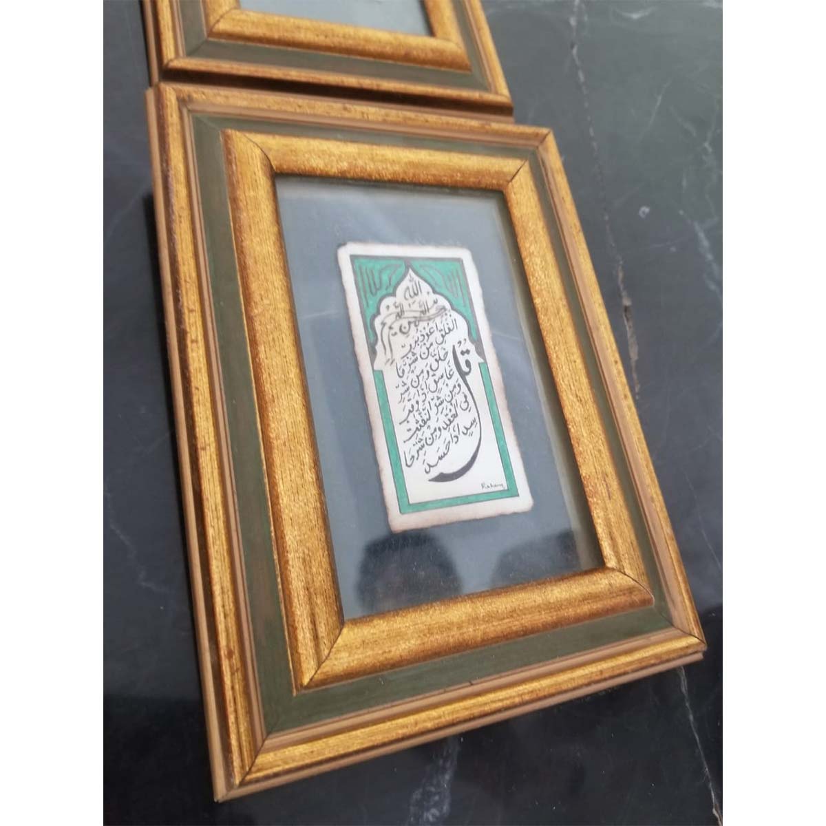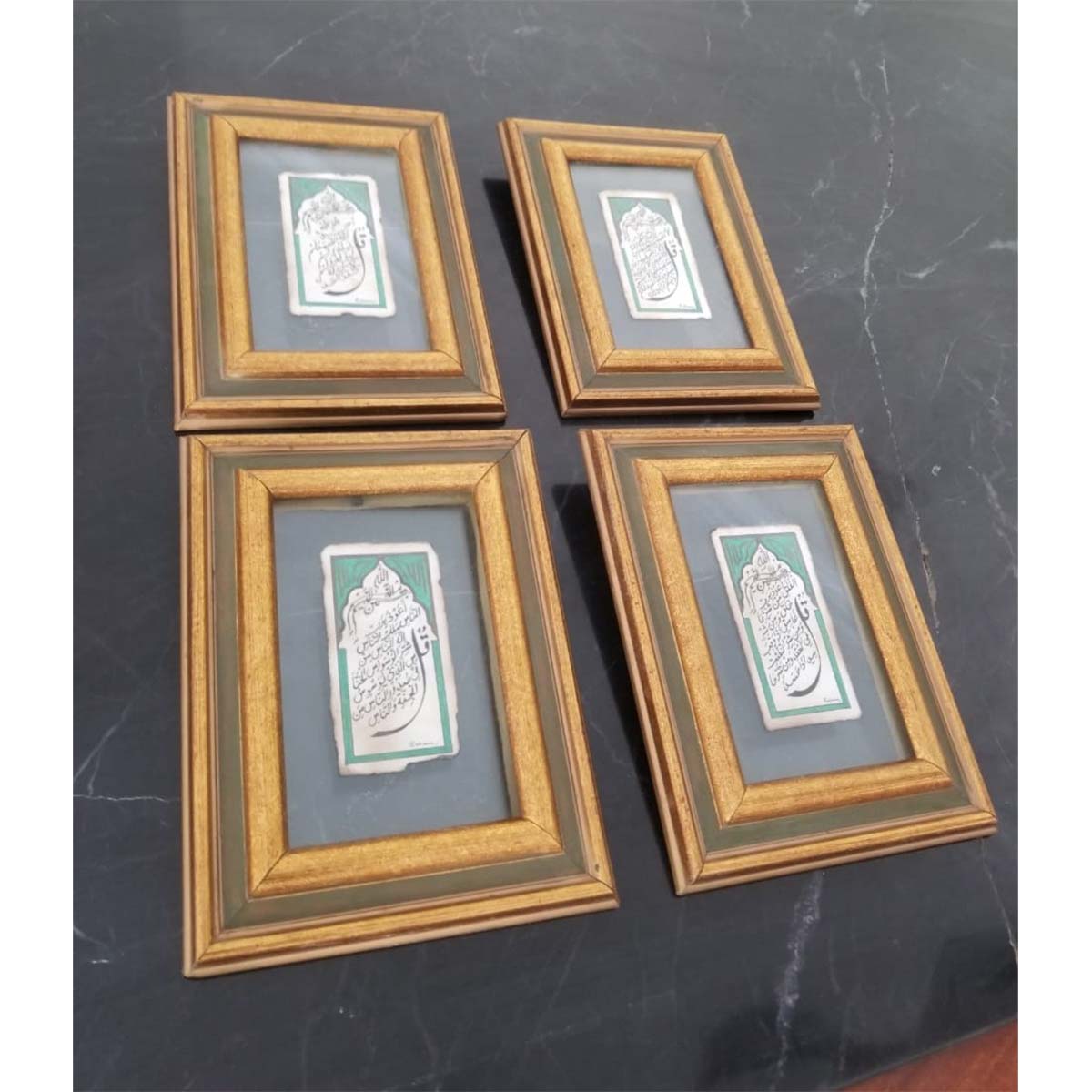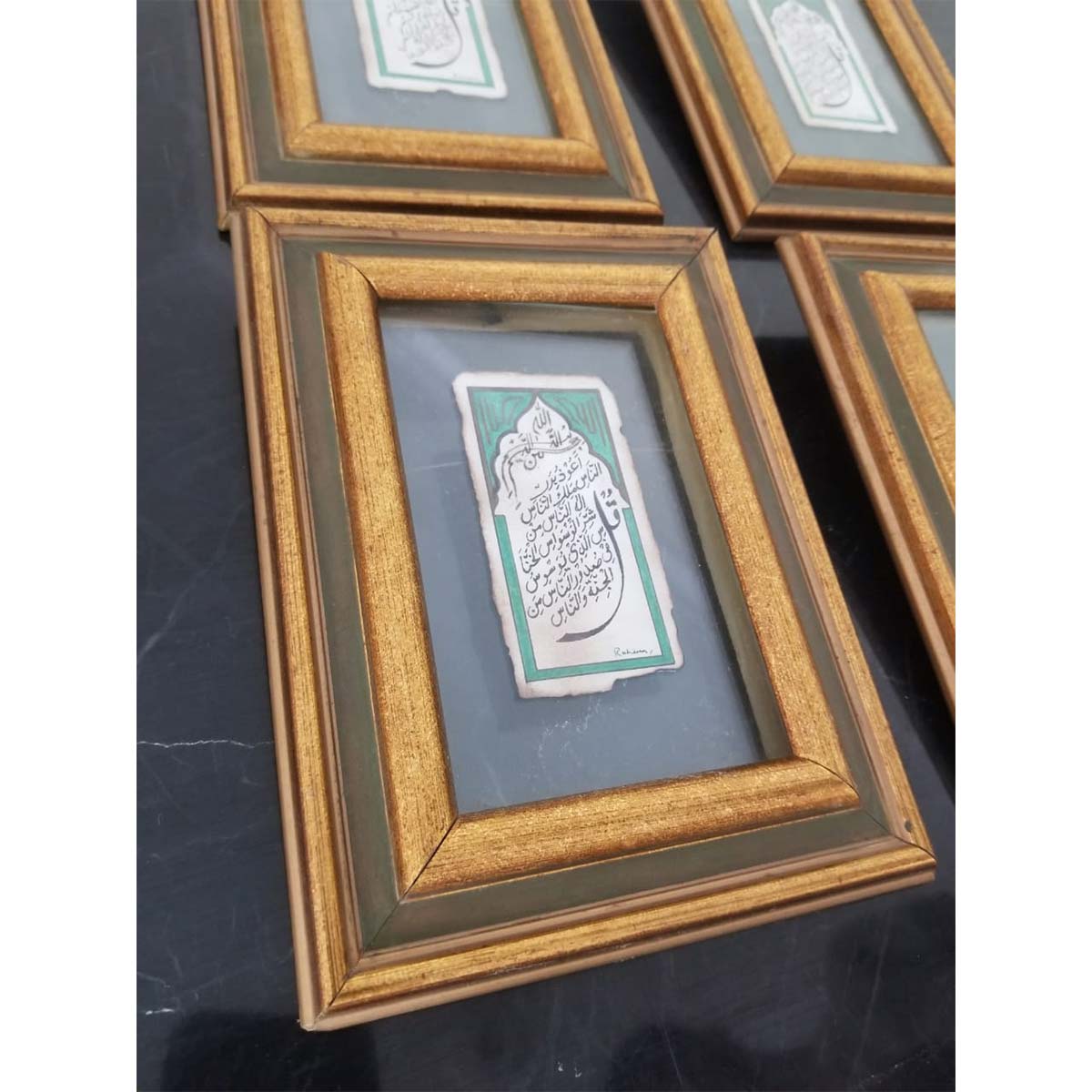 Set of 4 Quls calligraphy paintings on a vintage paper pressed in a glass frame by artist Raheem.
