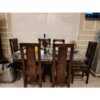 A sturdy and elegant 6-seater dining table set crafted from Sheesham wood, featuring a thick glass tabletop and matching high-back wooden chairs with cushioned cotton fabric seats. The set offers a timeless design suitable for both formal and family dining spaces.