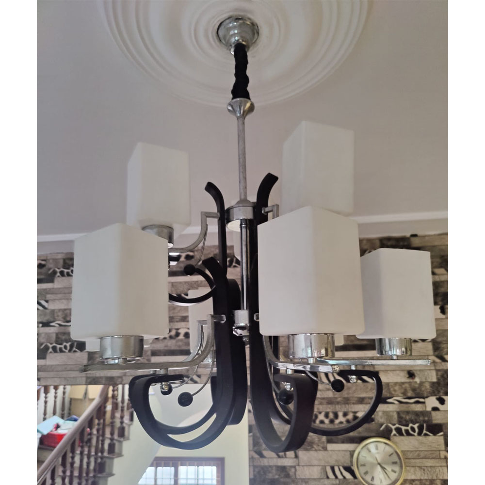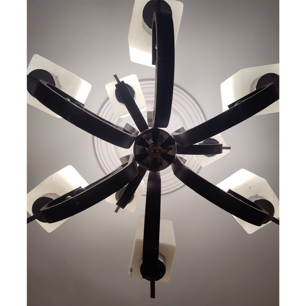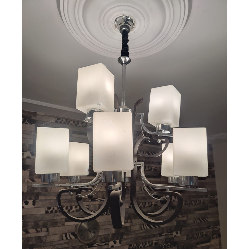 Modern 8 light chandelier with frosted glass shades ideal for a contemporary interior.