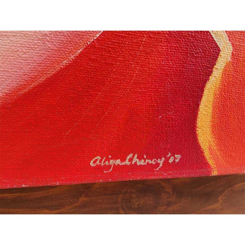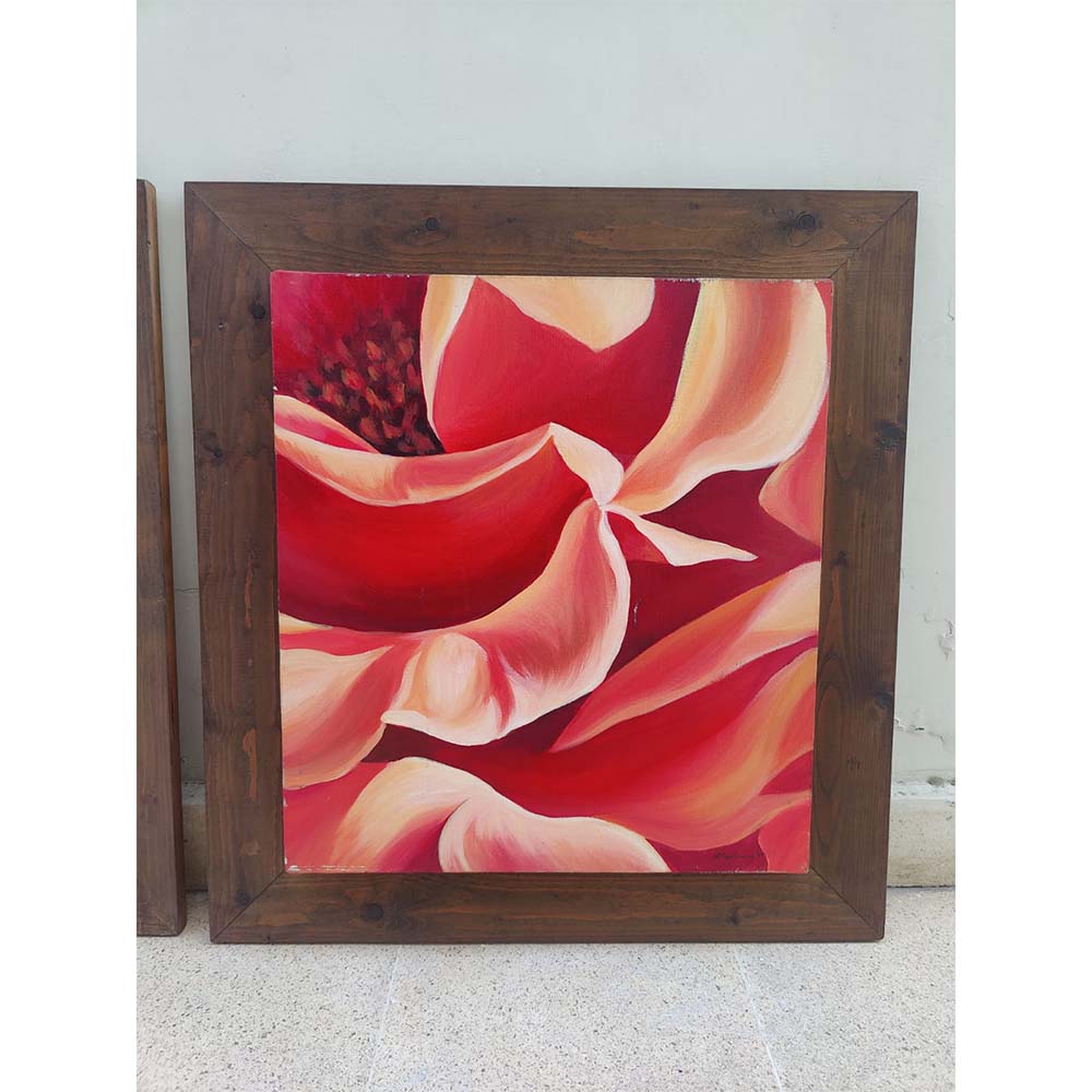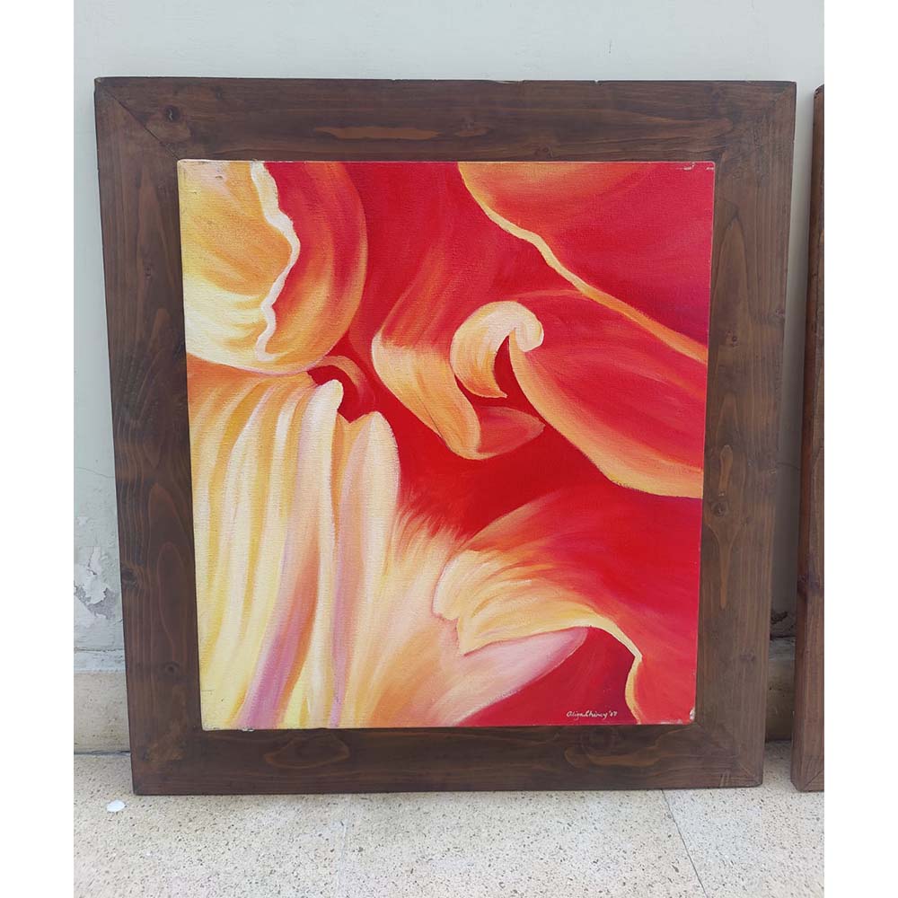 Pair vibrant oil on canvas abstract floral paintings set in solid wood frames by artist Aliya Chinoy signed and dated.
