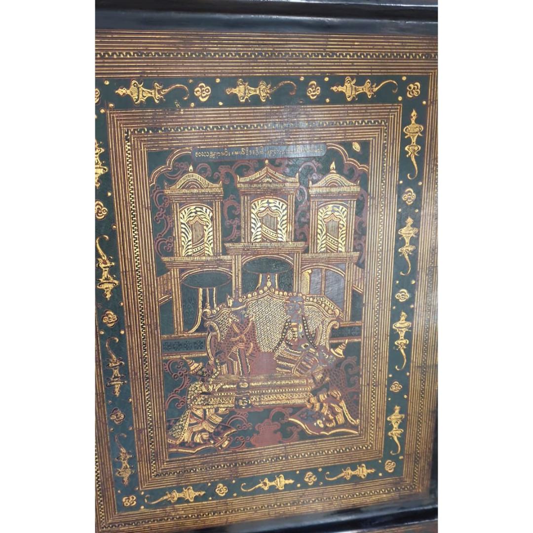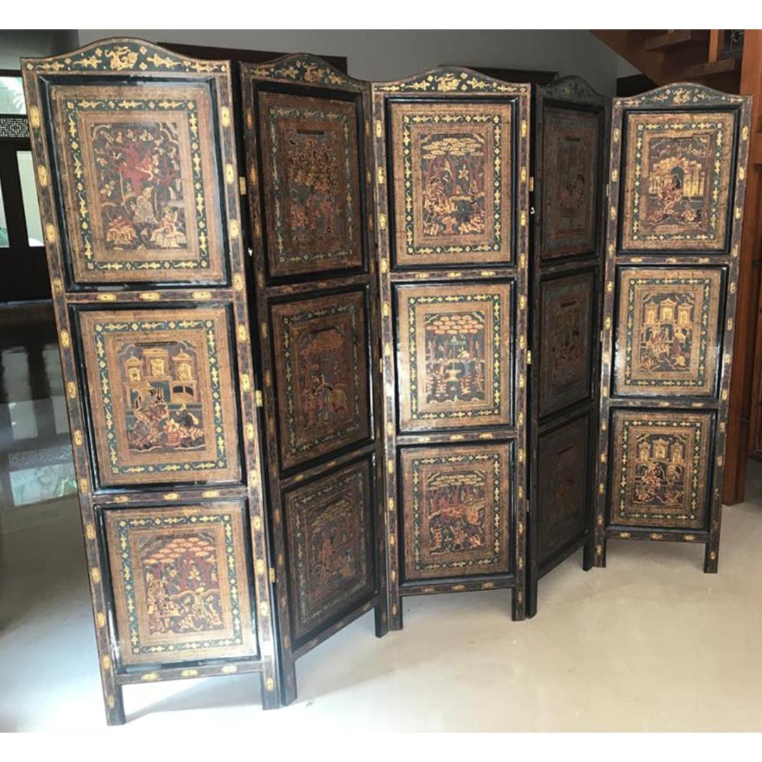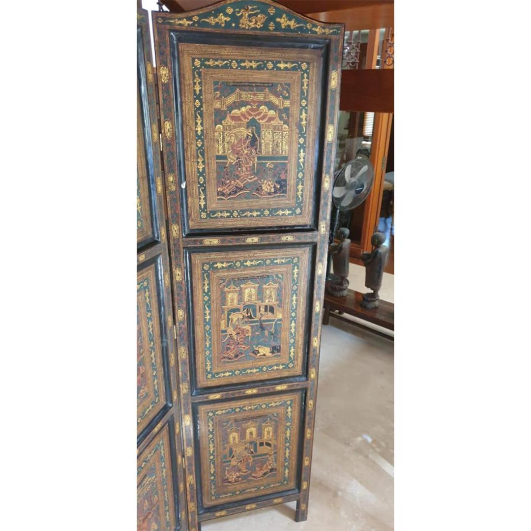 A 1930’s antique hand painted Burmese teak screen. 5 interconnected double sided foldable panels. Each panel depicts 3 intricately painted pieces on both sides. Total of 15 hand painted stories finished in gold leaf and lacquer. Originally bought in Burma from an antique dealer. This is rare collectors piece.