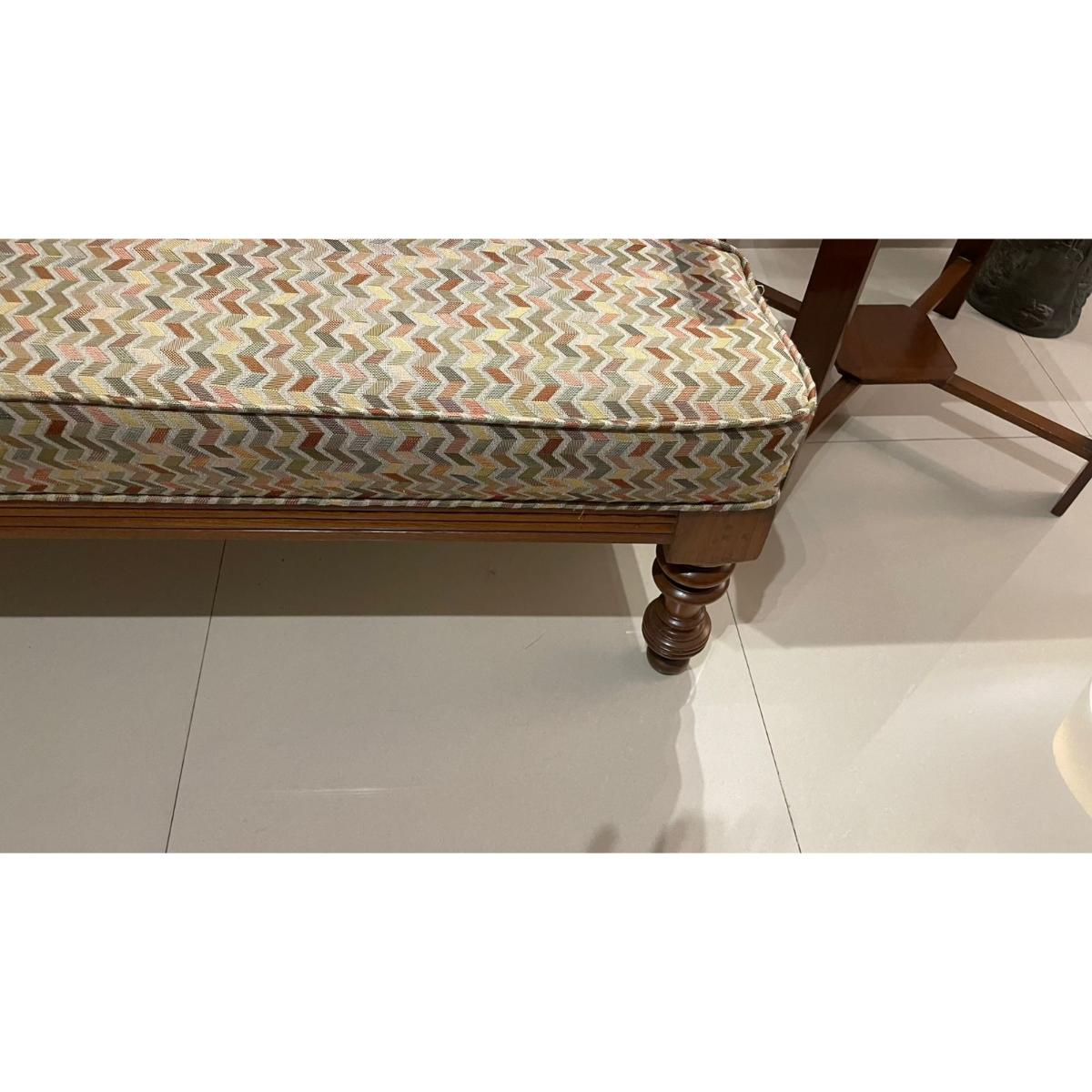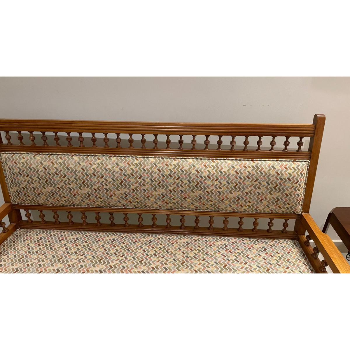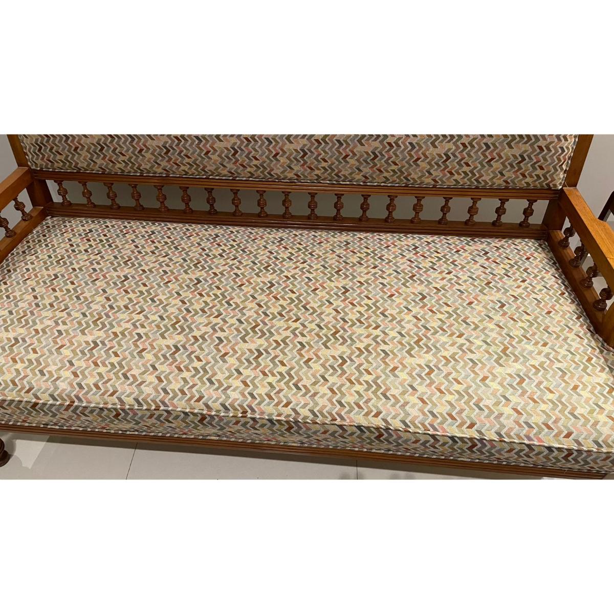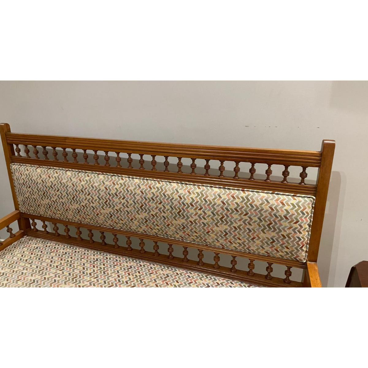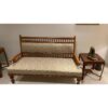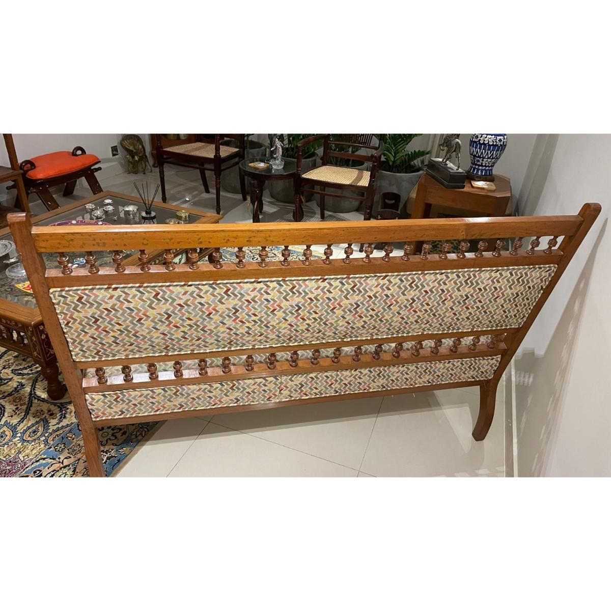 Elegant antique late Victorian-style couch crafted from premium teakwood, featuring intricate spindle detailing and a comfortable cushioned seat with patterned upholstery. A timeless accent piece that adds vintage charm and sophistication to any living space.
