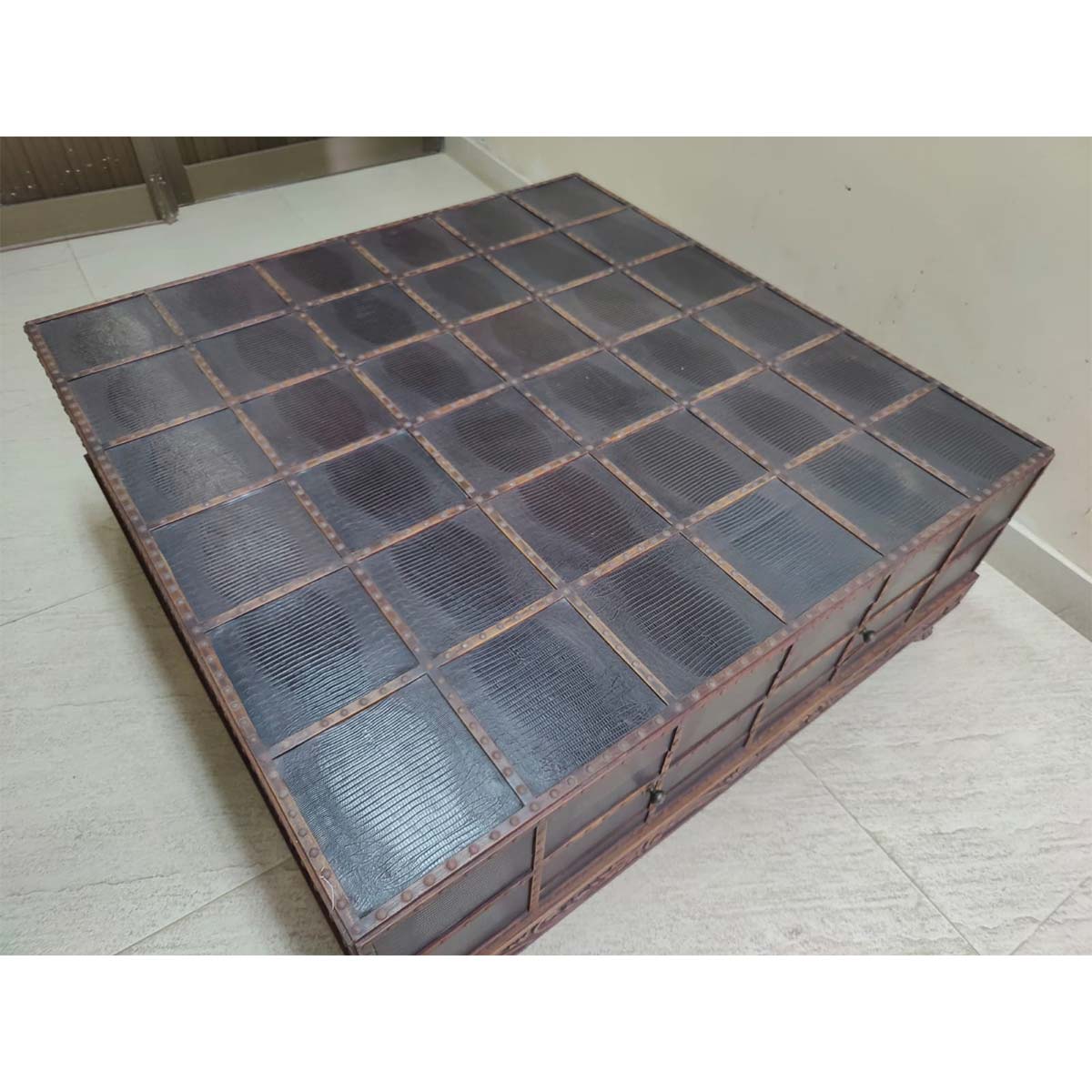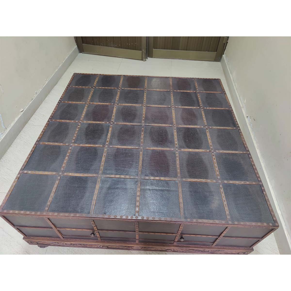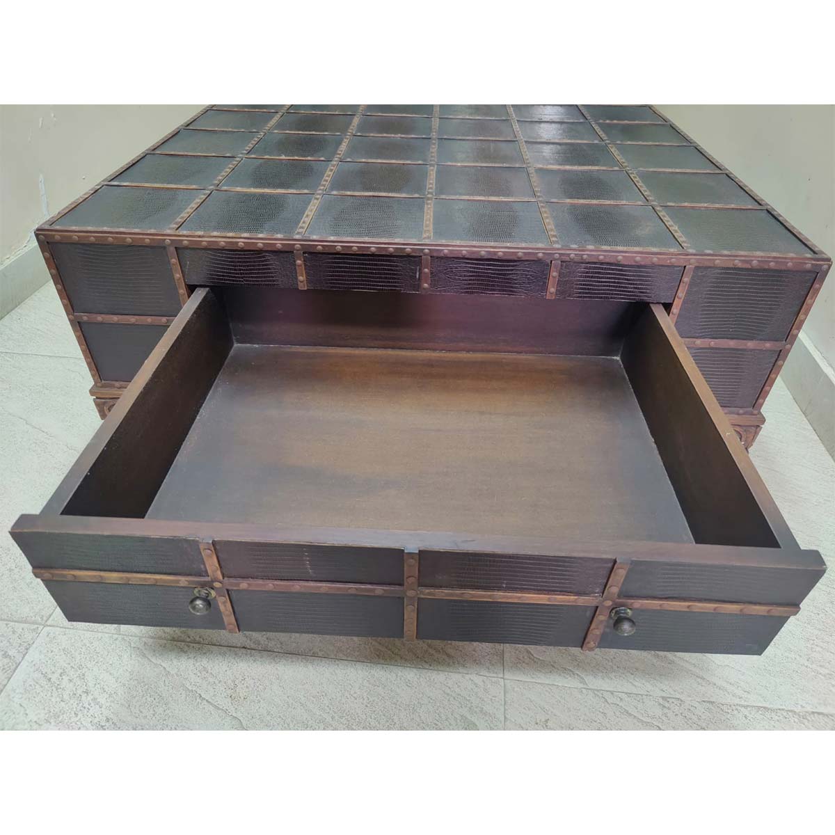 Wood carved coffee table covered in textured leather with metal studs checkered border, has 2 drawers on either side. Originally purchased from interior design & furniture brand Baroque.