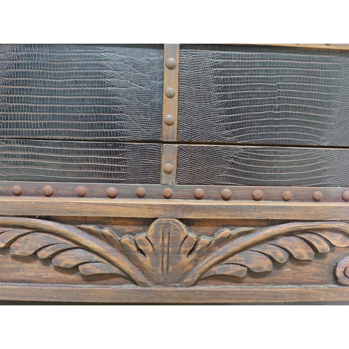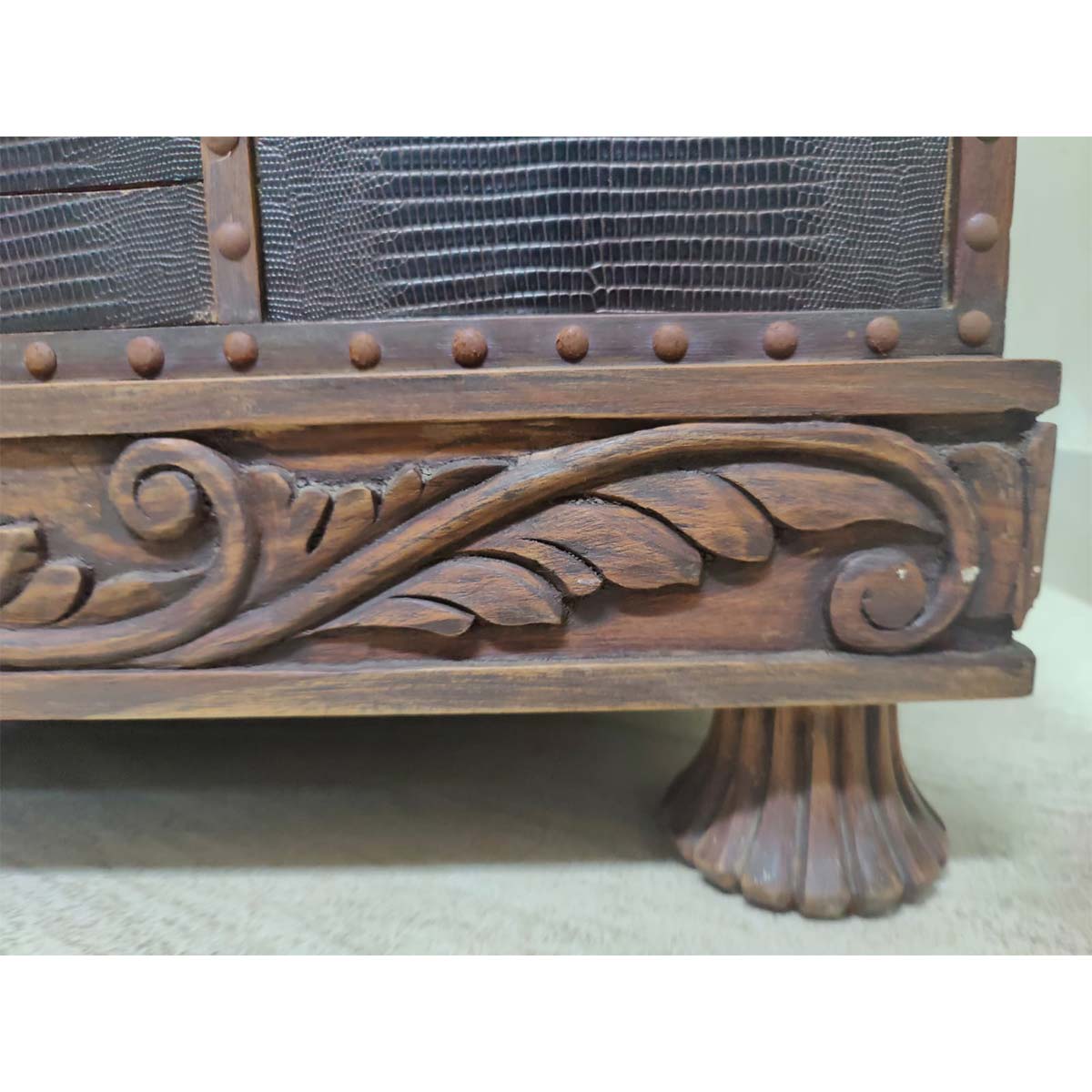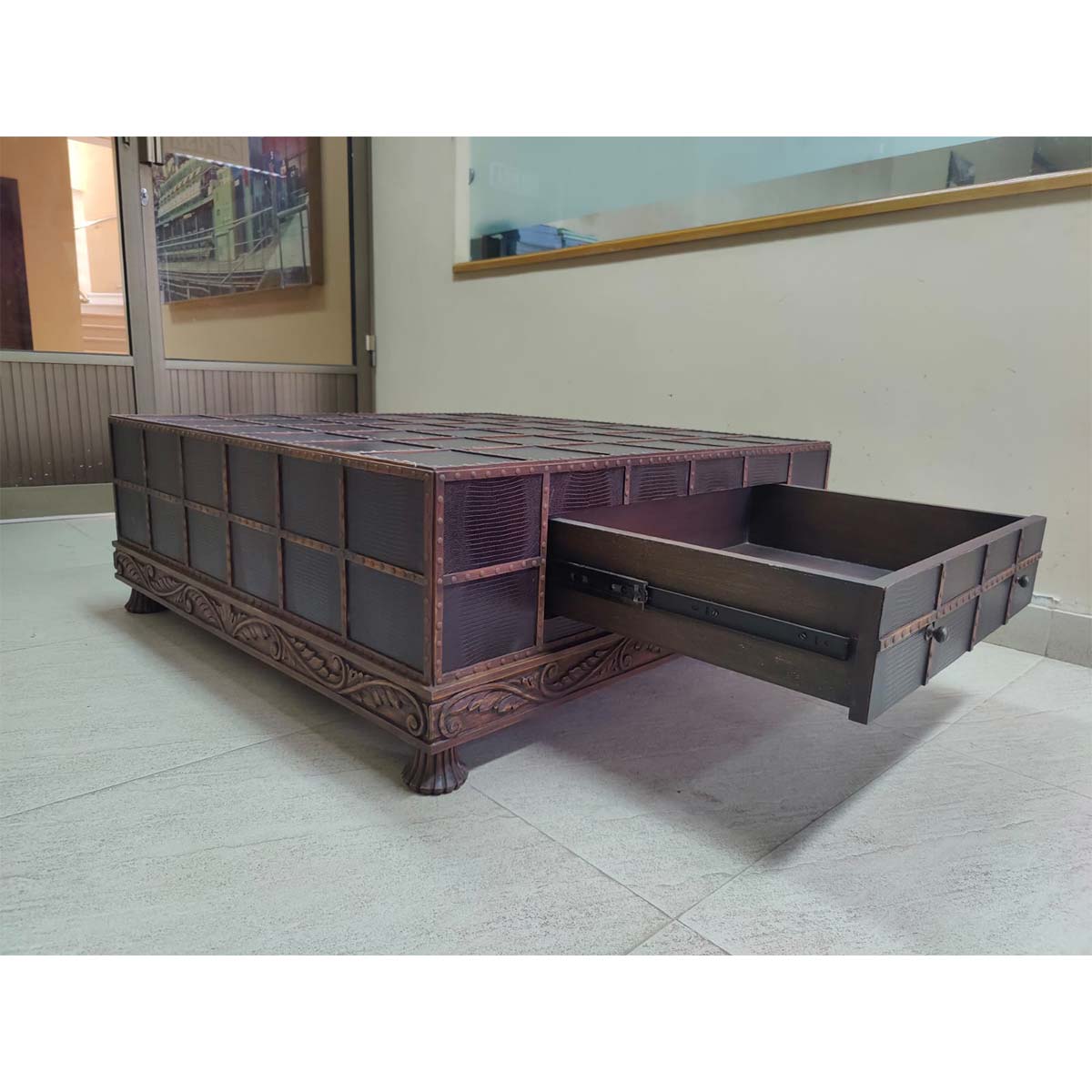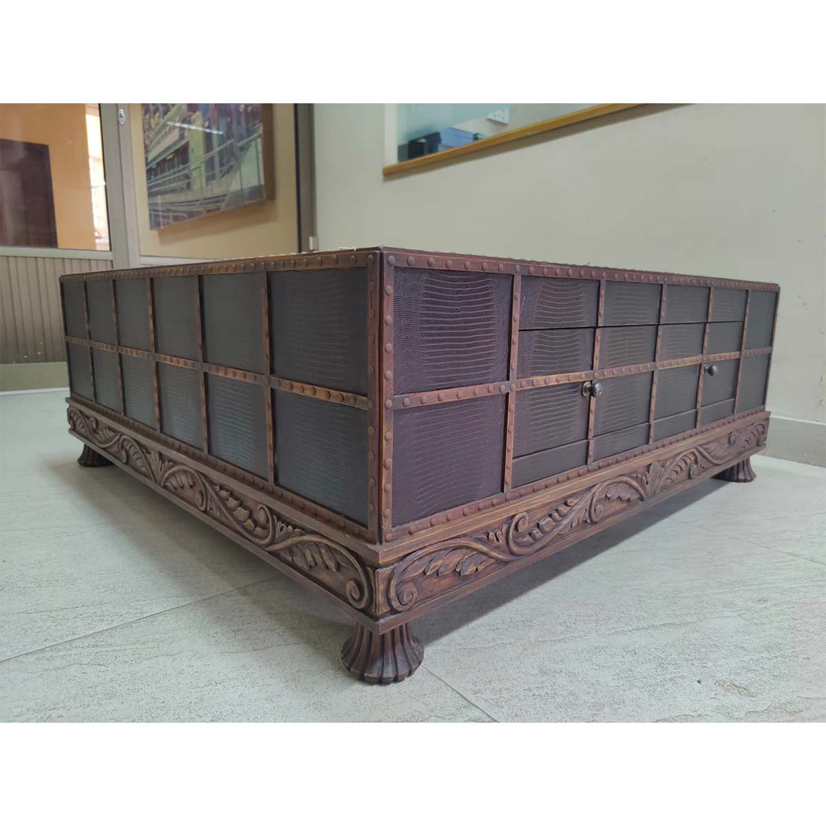 Wood carved coffee table covered in textured leather with metal studs checkered border, has 2 drawers on either side. Originally purchased from interior design & furniture brand Baroque.