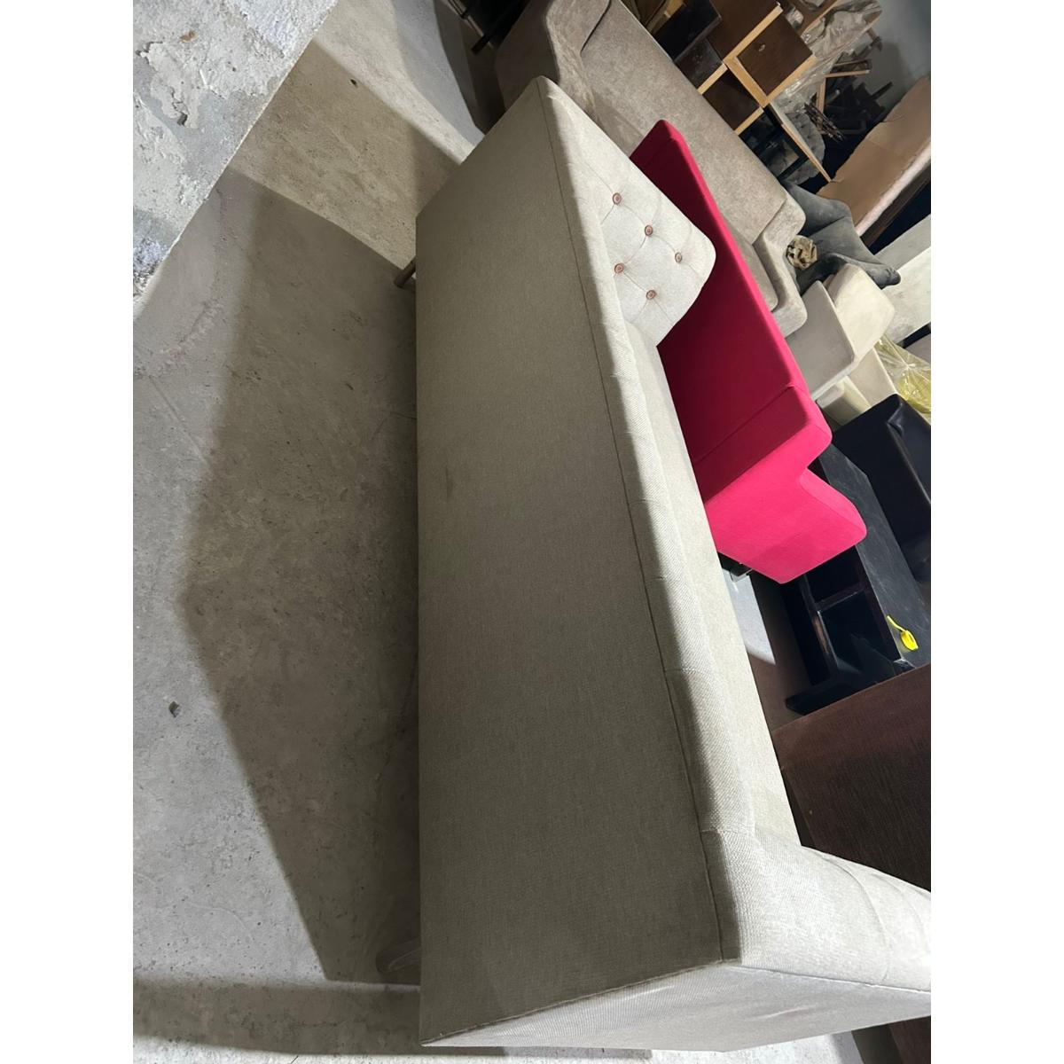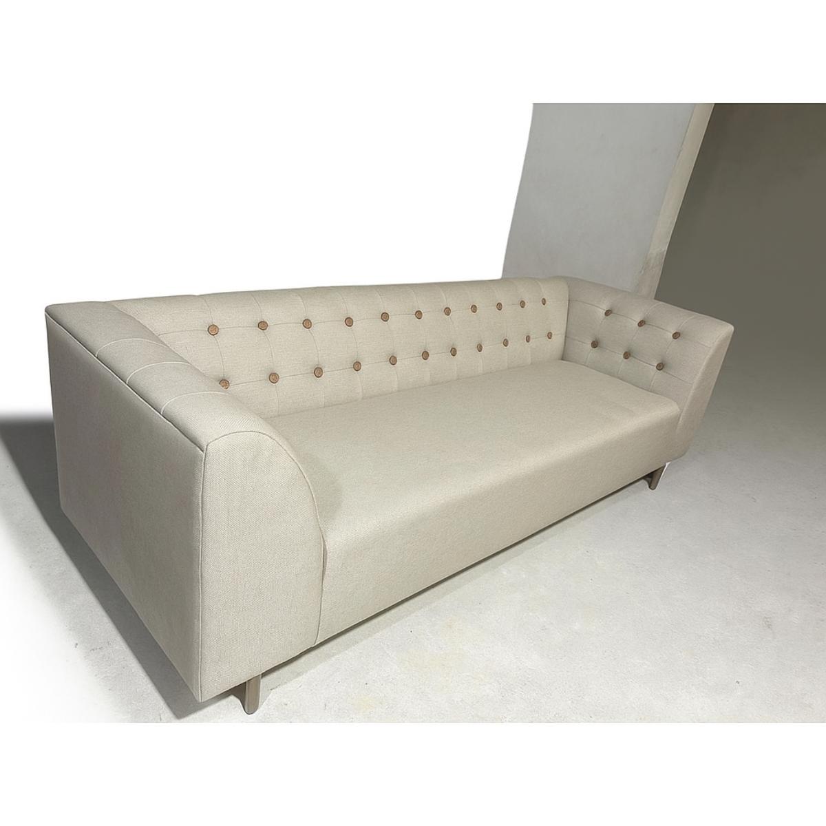 Classic elegance meets modern comfort in this beige 3-seater sofa, featuring a beautifully tufted backrest with button accents and a clean, boxy silhouette. Upholstered in durable jute fabric and supported by a solid wood and metal frame, this piece adds refined charm to living rooms, offices, or lobbies.