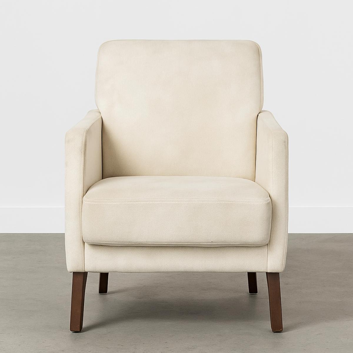 This elegant light beige velvet armchair brings a soft, neutral charm to any interior space. With clean lines, plush cushioning, and sturdy wooden legs, it’s perfect for both modern and classic settings—ideal for a cozy reading corner, living room, office or a bedroom.