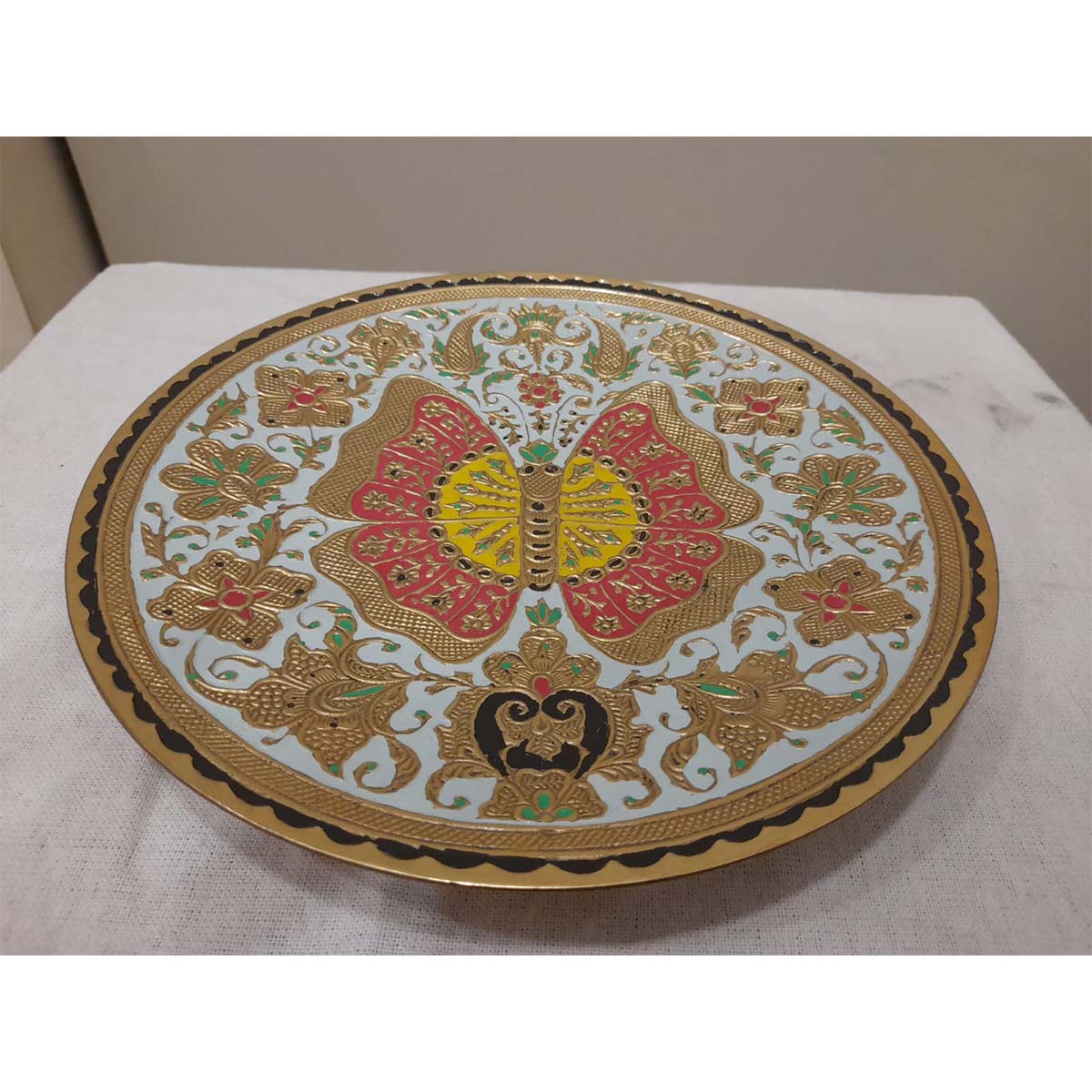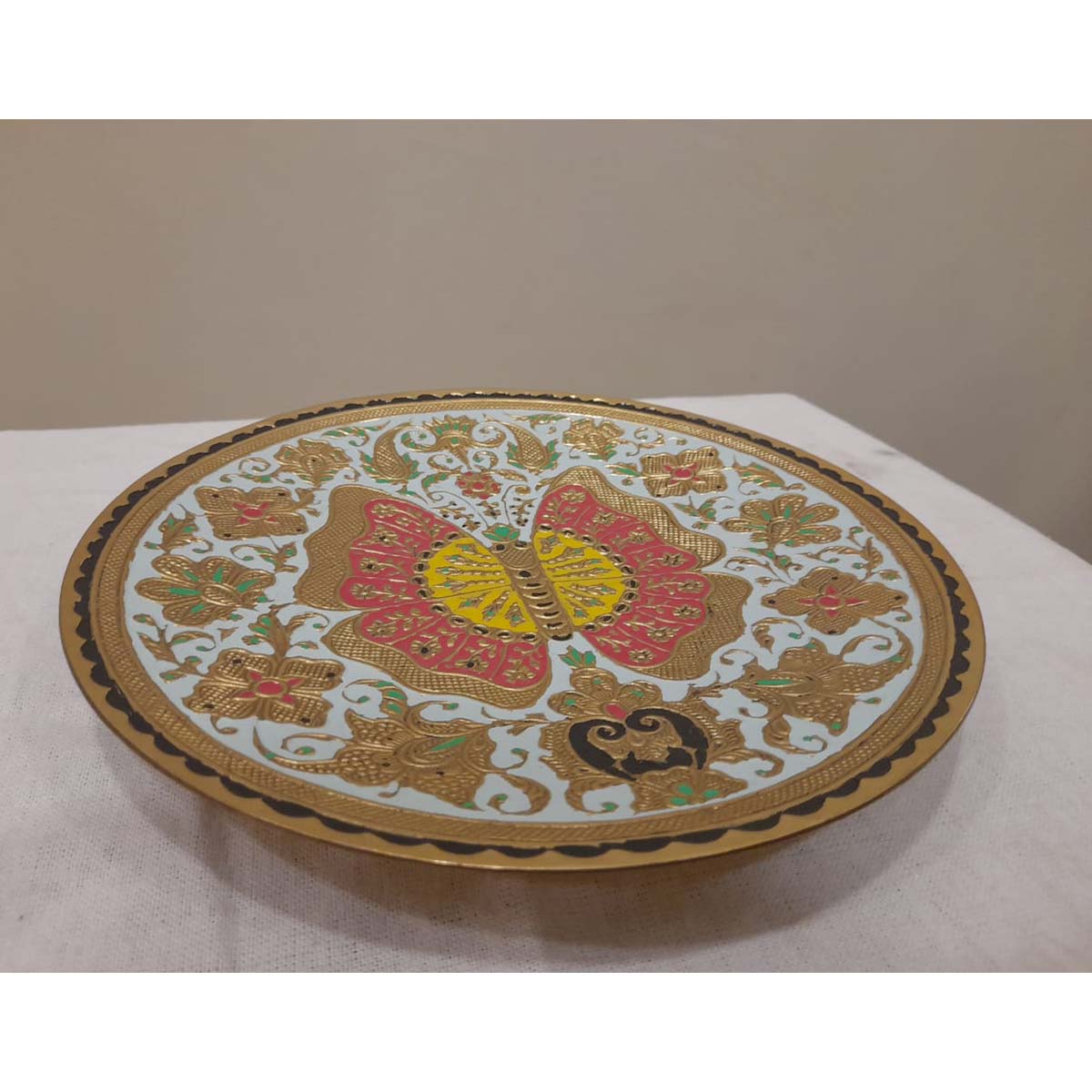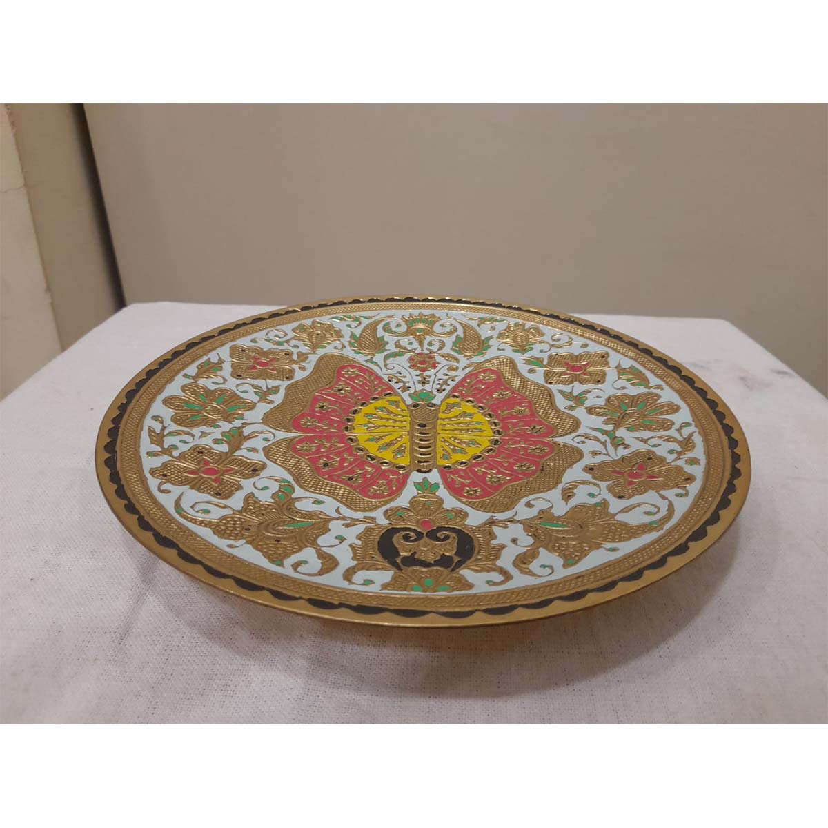 Brass plate from Muradabad with a centre motif of a butterfly intricately worked in Meena.