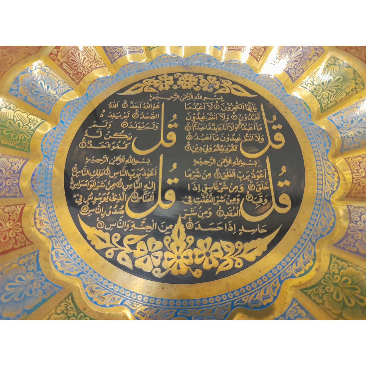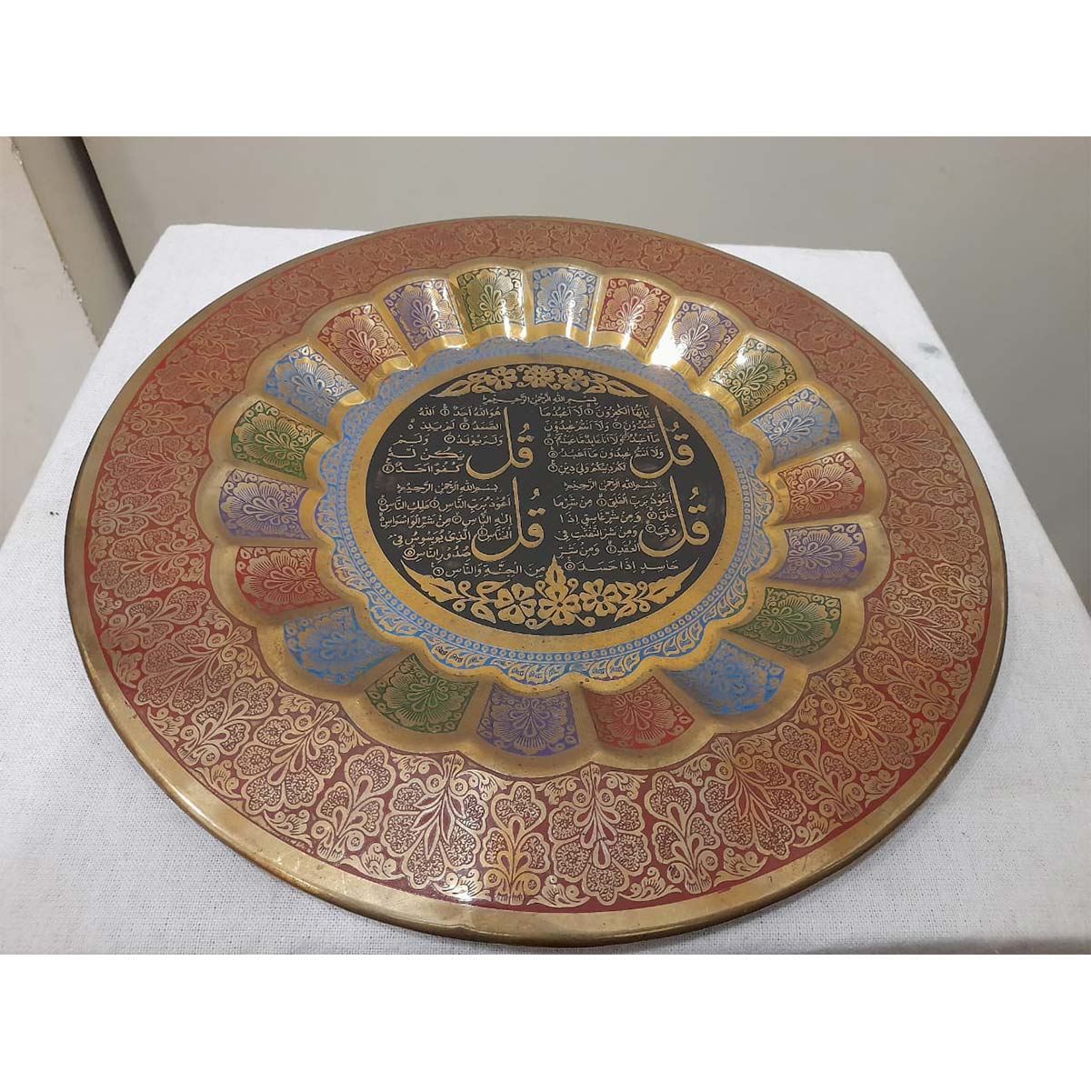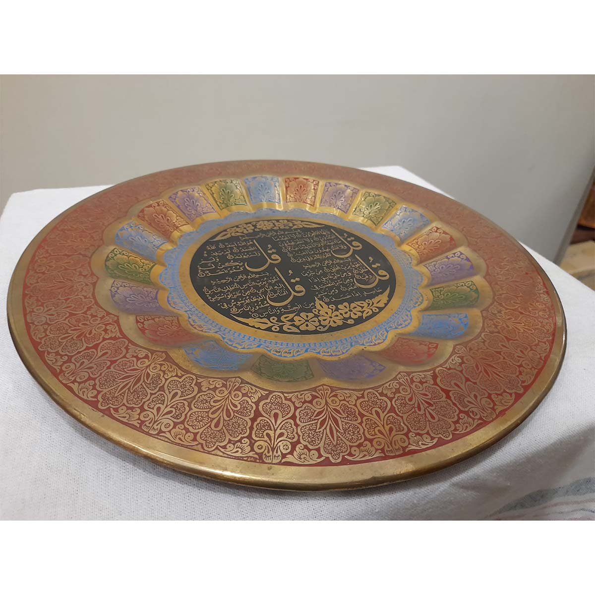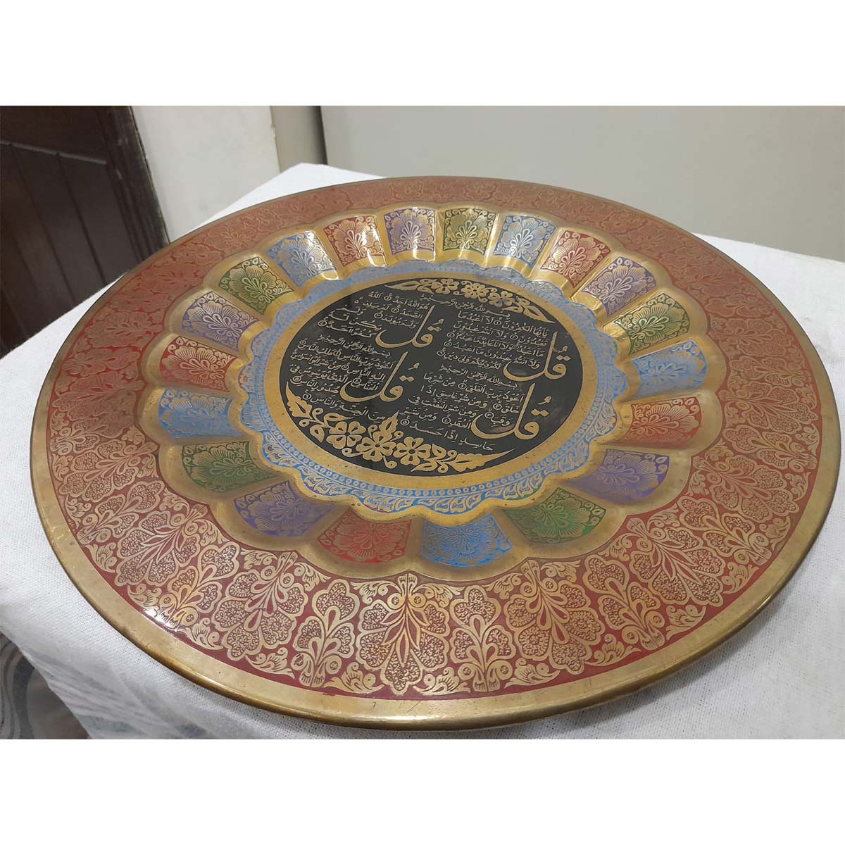 Brass plate from Muradabad with Meena work with a centre of 4 Quranic verses of Quls.