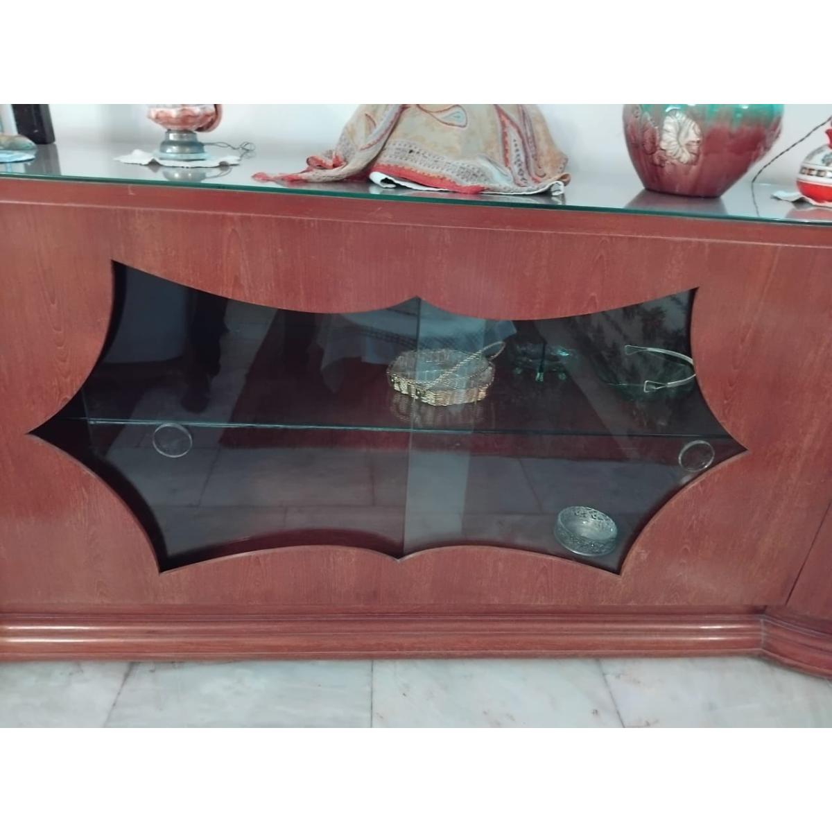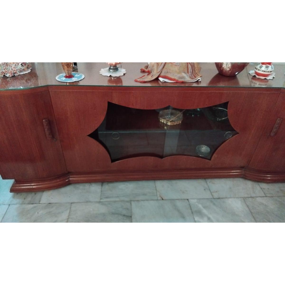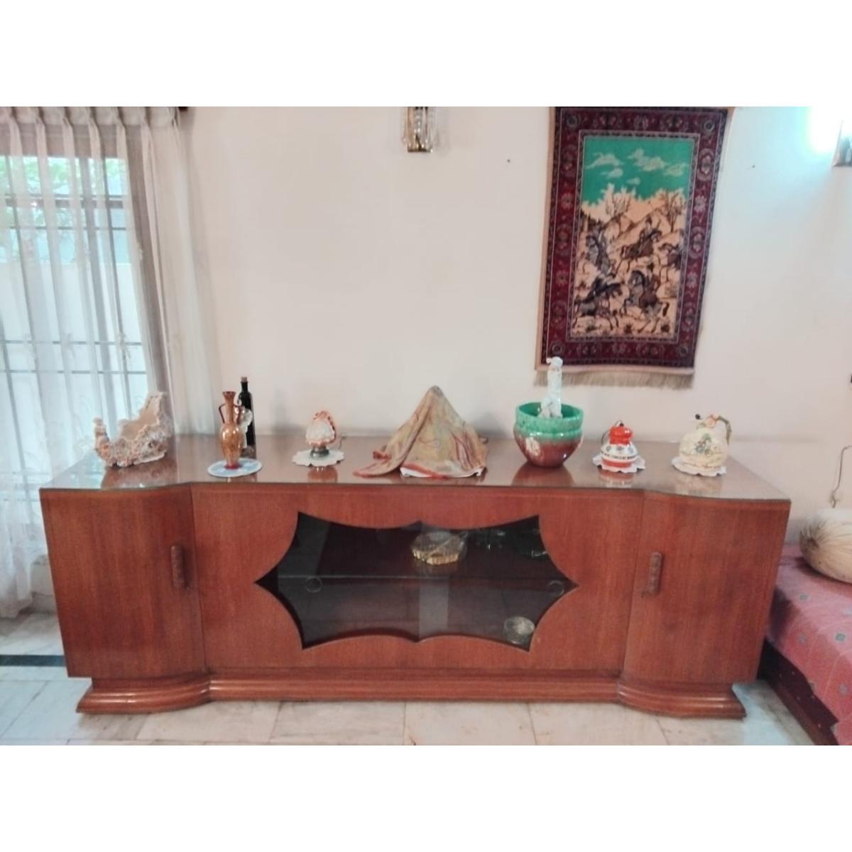 Make a bold style statement with this magnificent 8-foot-long vintage sideboard, crafted from premium Burma teak and finished with a sleek glass top. The centerpiece features a beautifully contoured glass-front display section perfect for showcasing fine décor, crockery, or collectibles. A timeless piece ideal for formal living rooms, dining areas, or grand entrances.