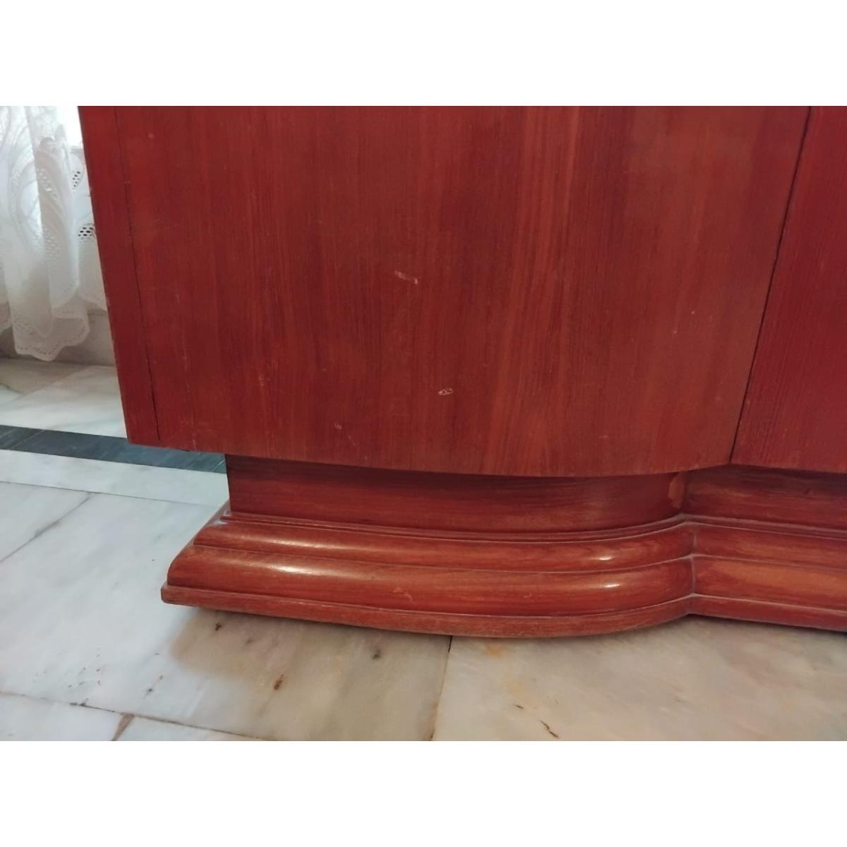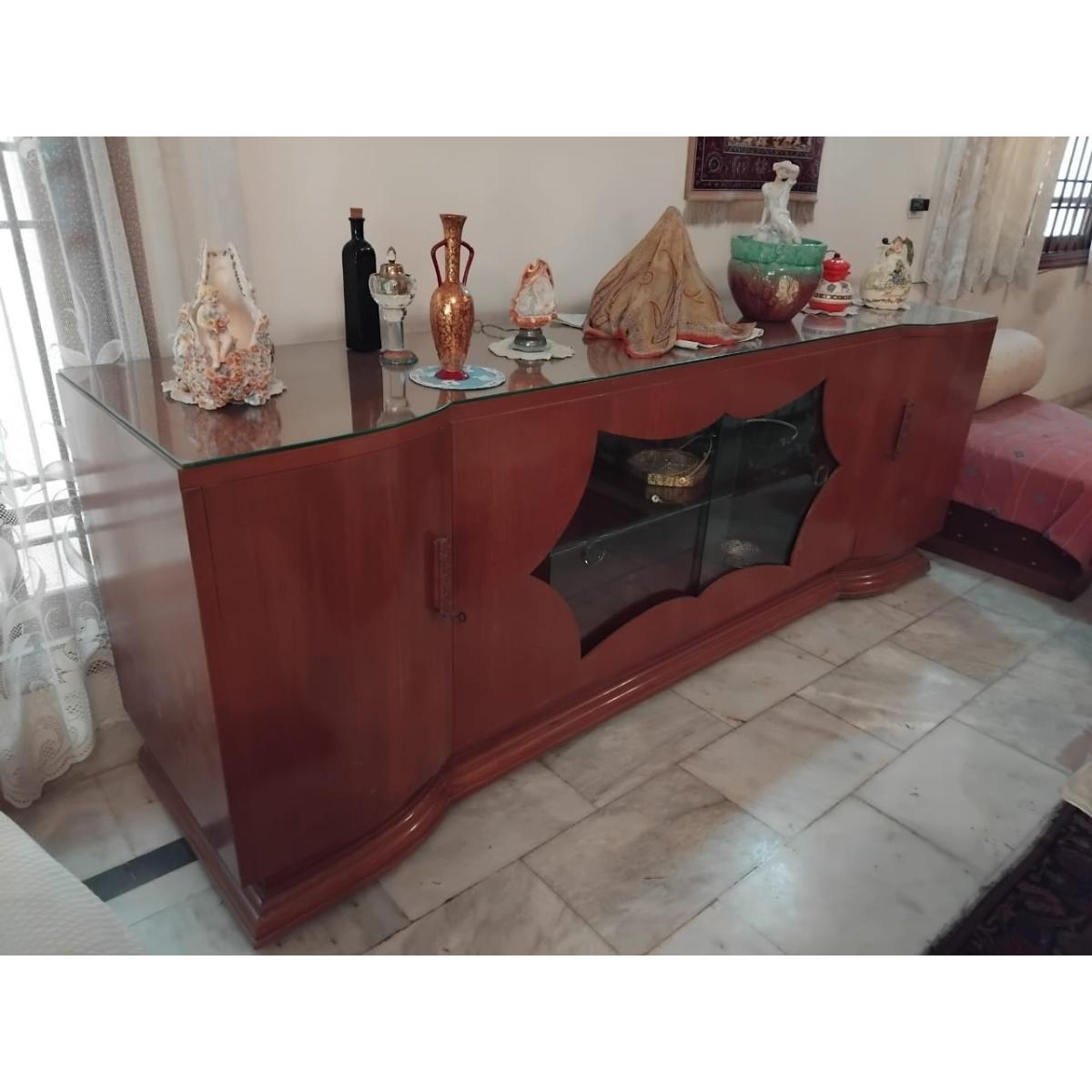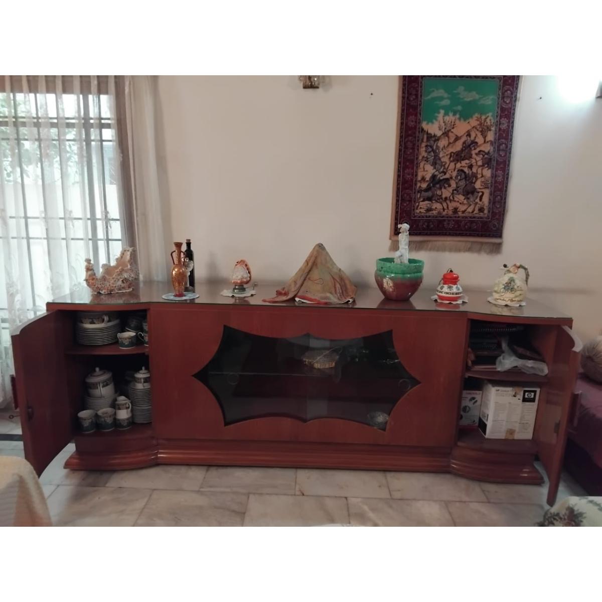 Make a bold style statement with this magnificent 8-foot-long vintage sideboard, crafted from premium Burma teak and finished with a sleek glass top. The centerpiece features a beautifully contoured glass-front display section perfect for showcasing fine décor, crockery, or collectibles. A timeless piece ideal for formal living rooms, dining areas, or grand entrances.