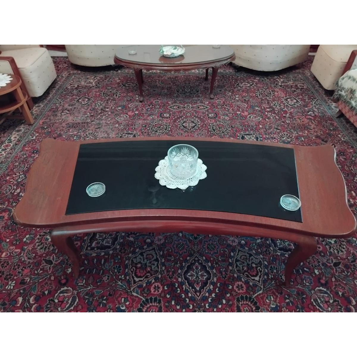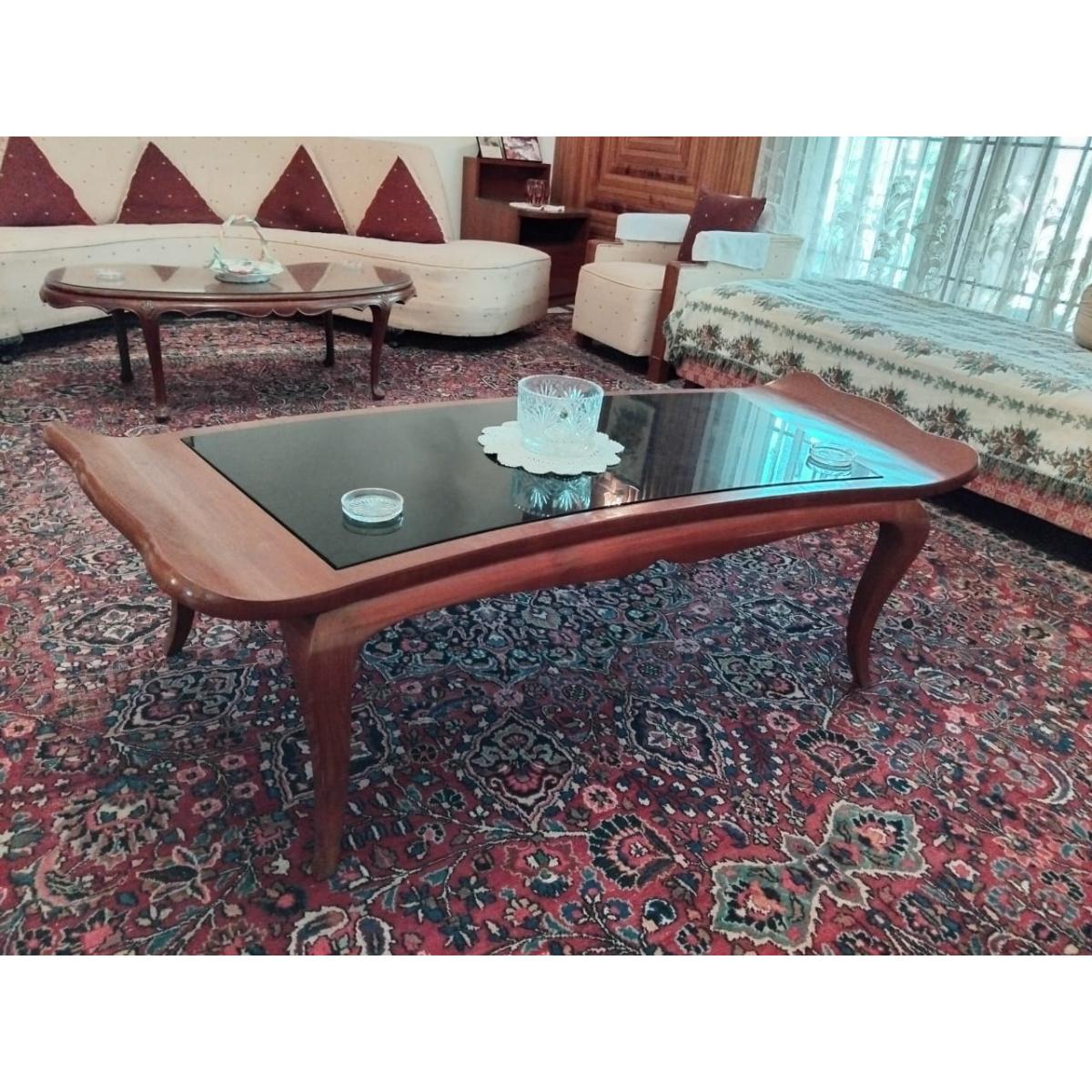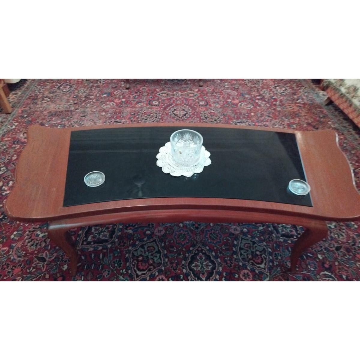 Sleek shaped Burma teak coffee table is a timeless piece for any refined living space. The gently curved legs and carved edges add a vintage flair, while the glossy black glass inlay at the center offers a bold contrast against the warm teak finish.