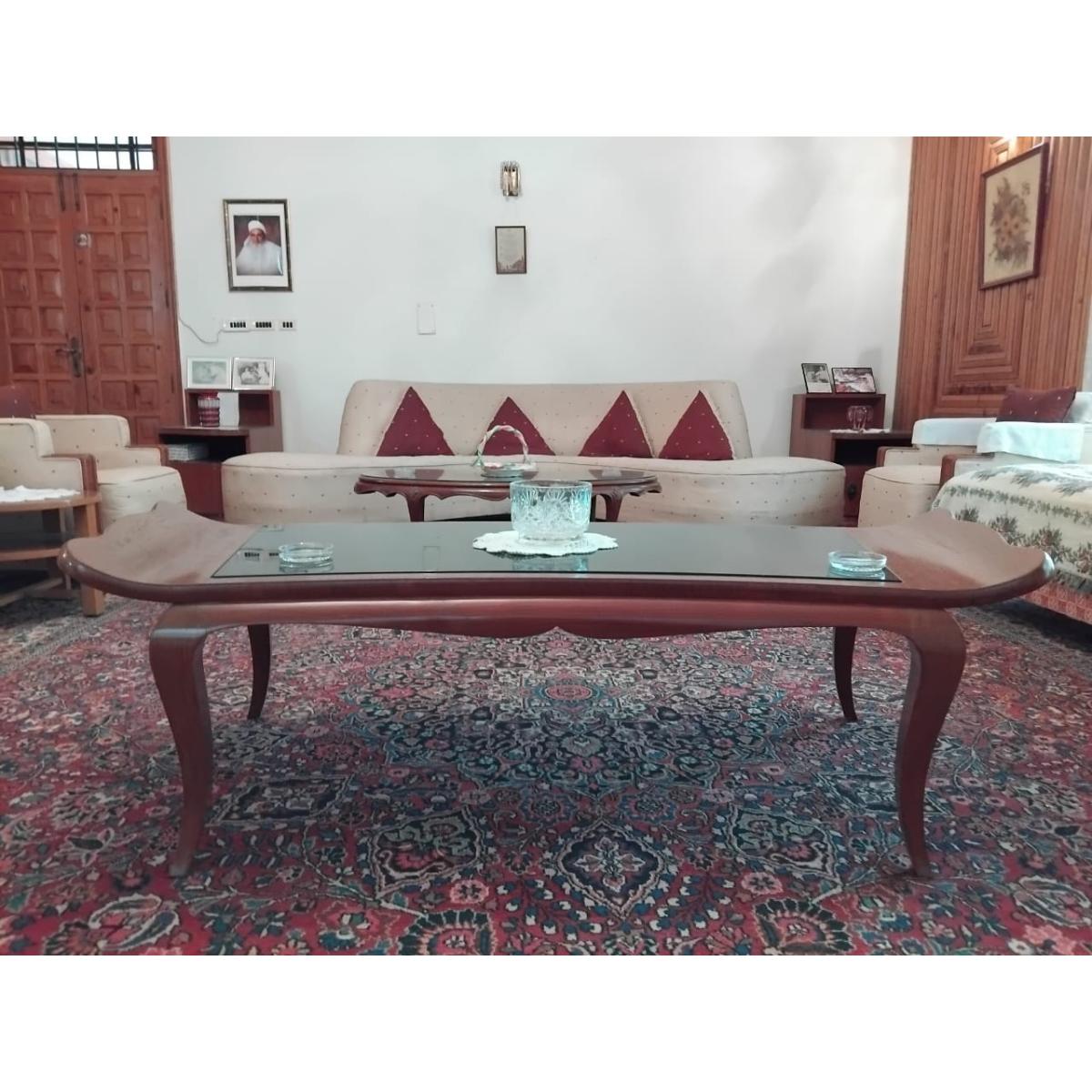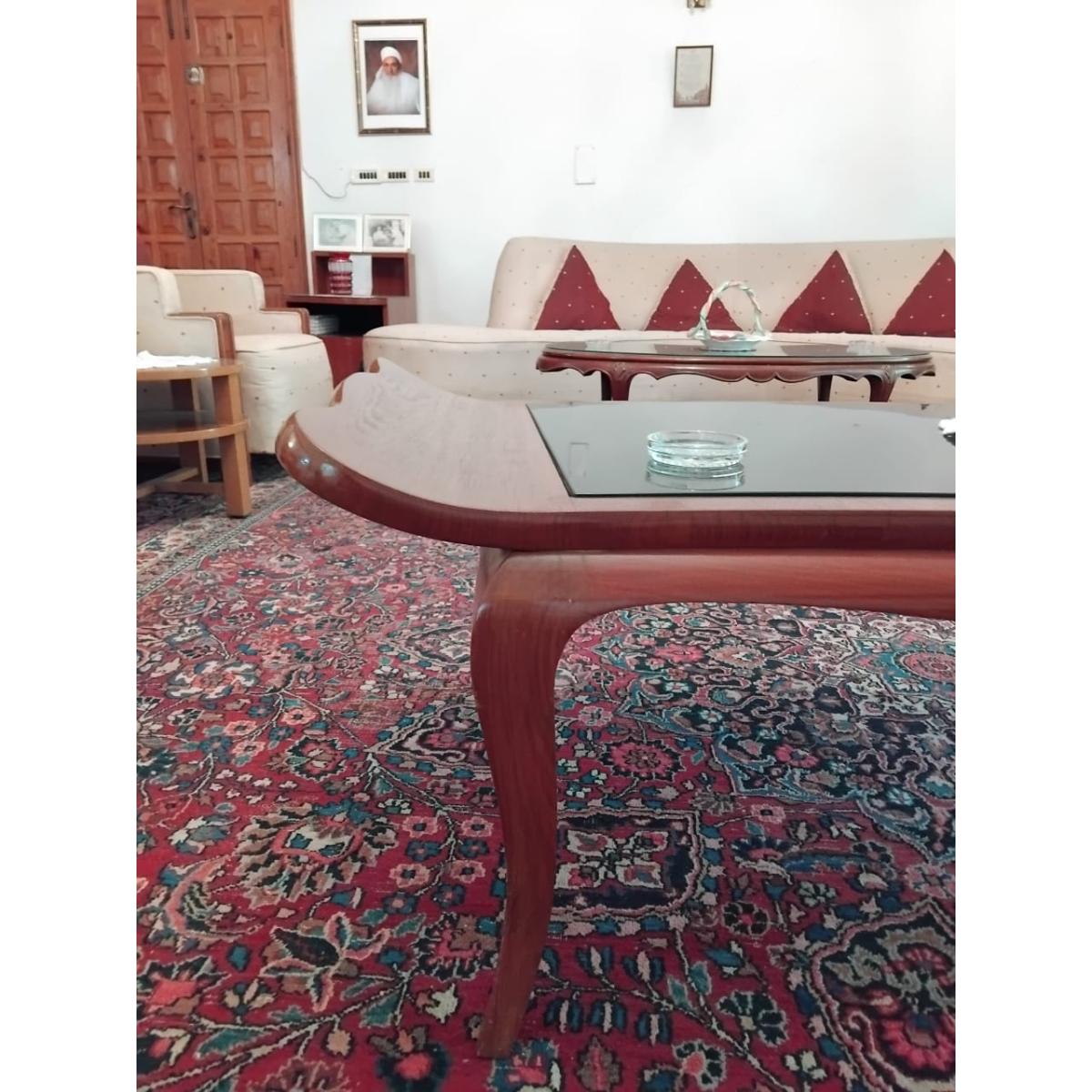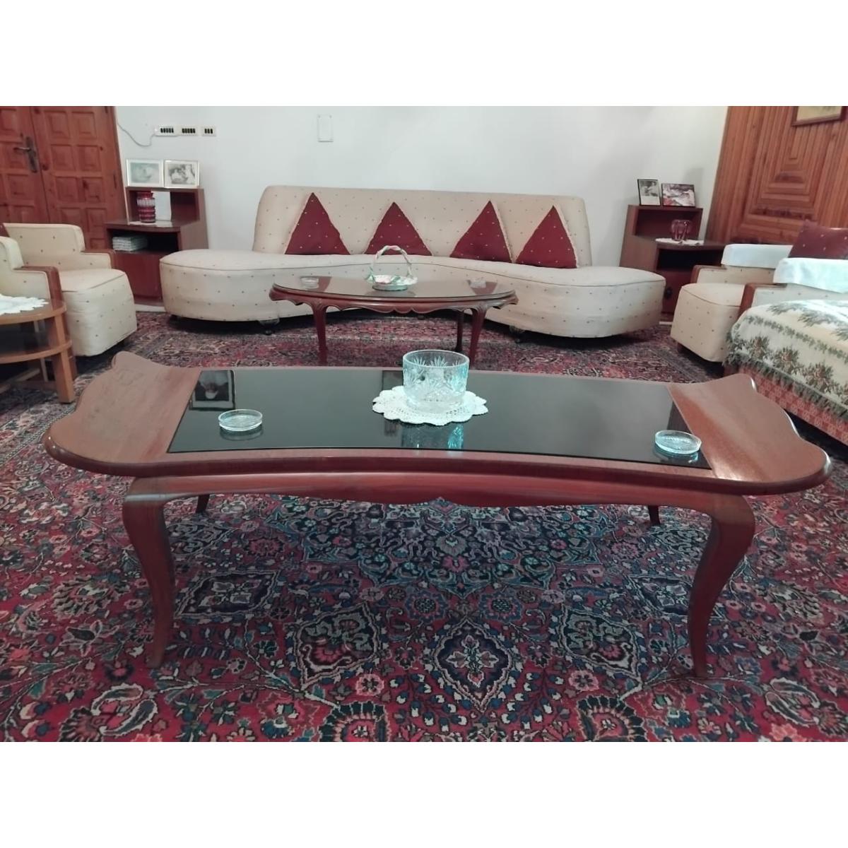 Sleek shaped Burma teak coffee table is a timeless piece for any refined living space. The gently curved legs and carved edges add a vintage flair, while the glossy black glass inlay at the center offers a bold contrast against the warm teak finish.