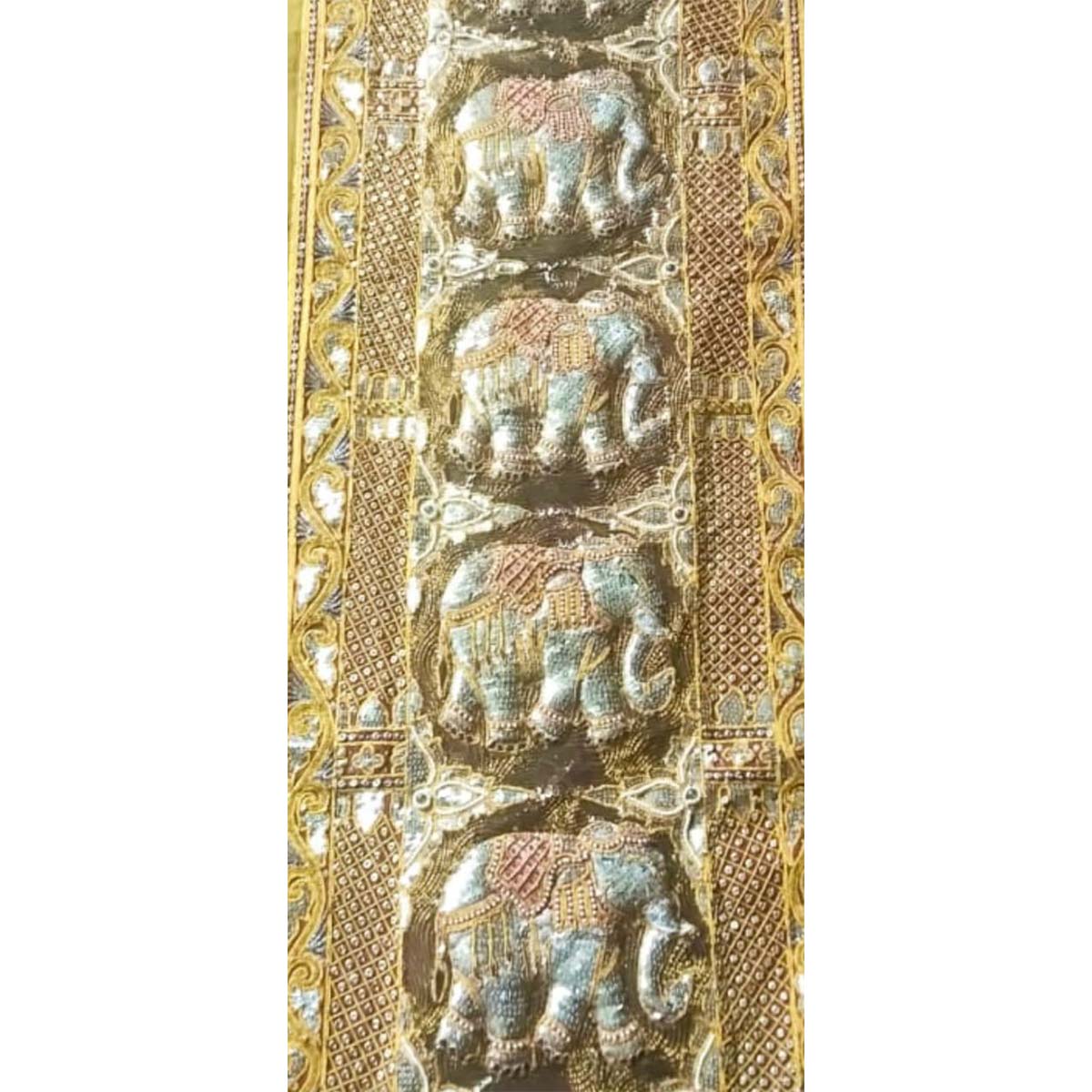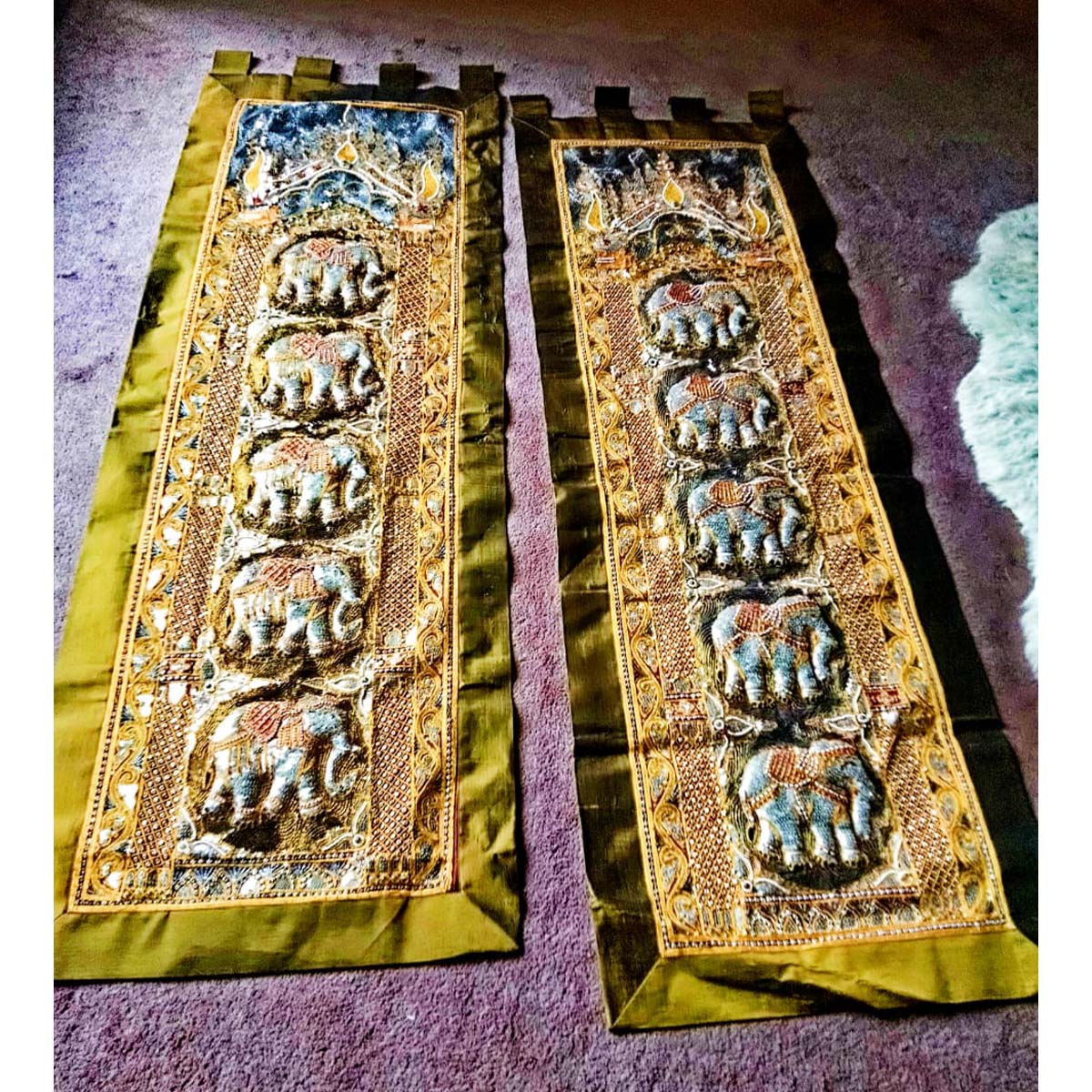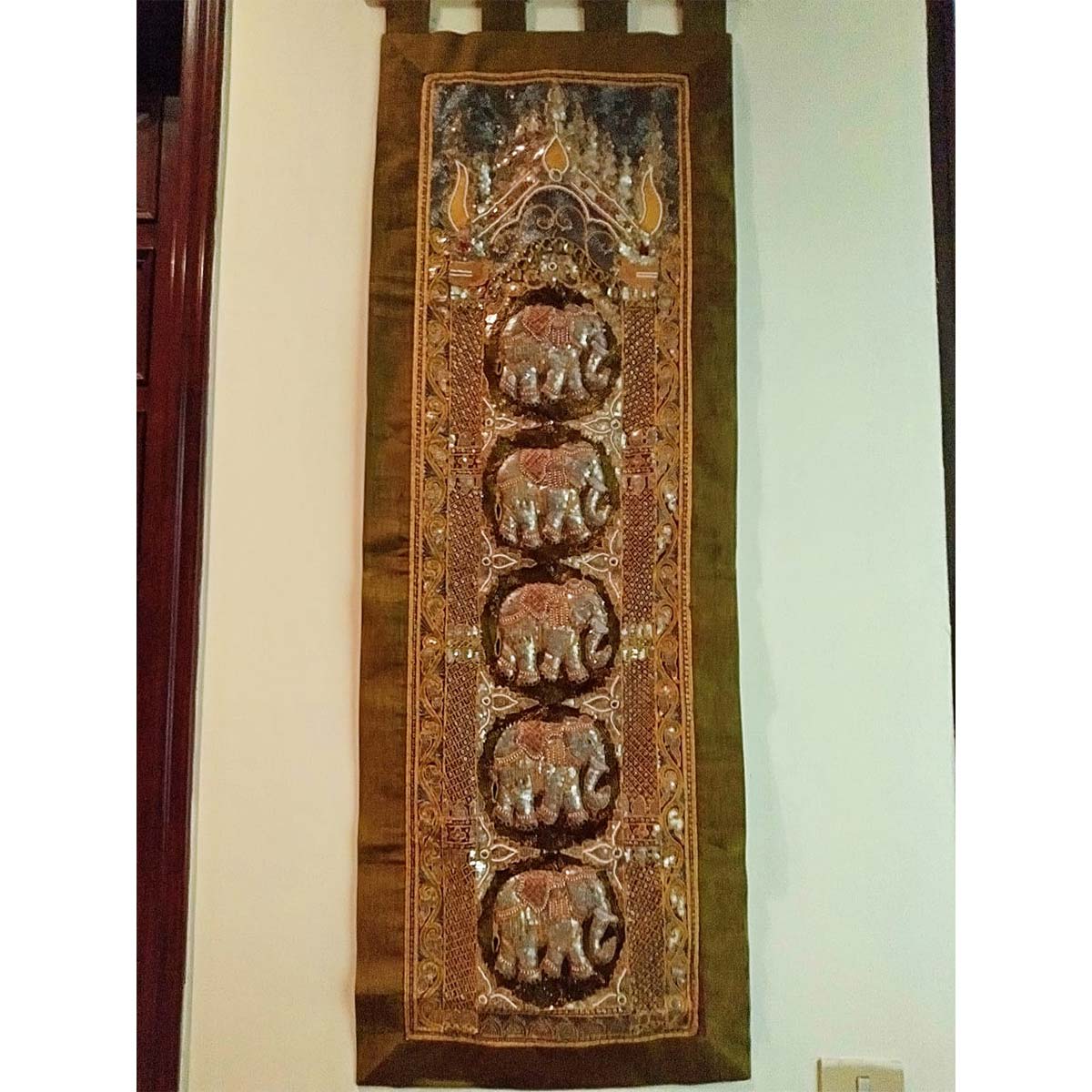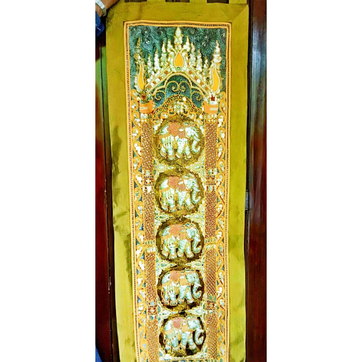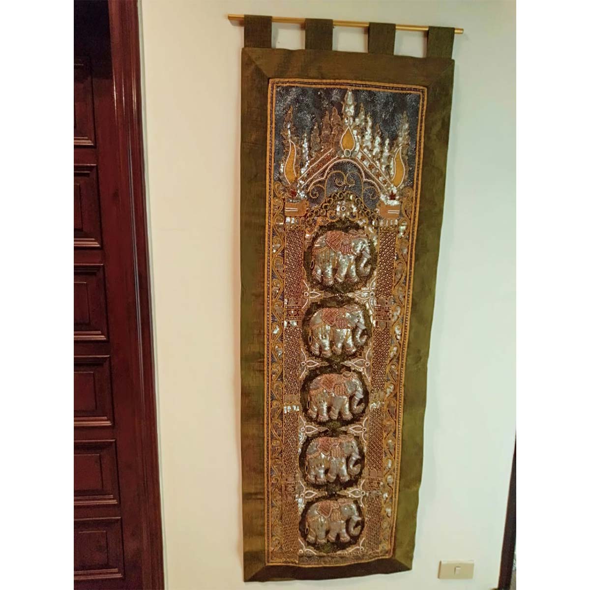 Burmese hand embroidered with glass beads and glitter elephant motif on Thai silk tapestry for wall hanging.