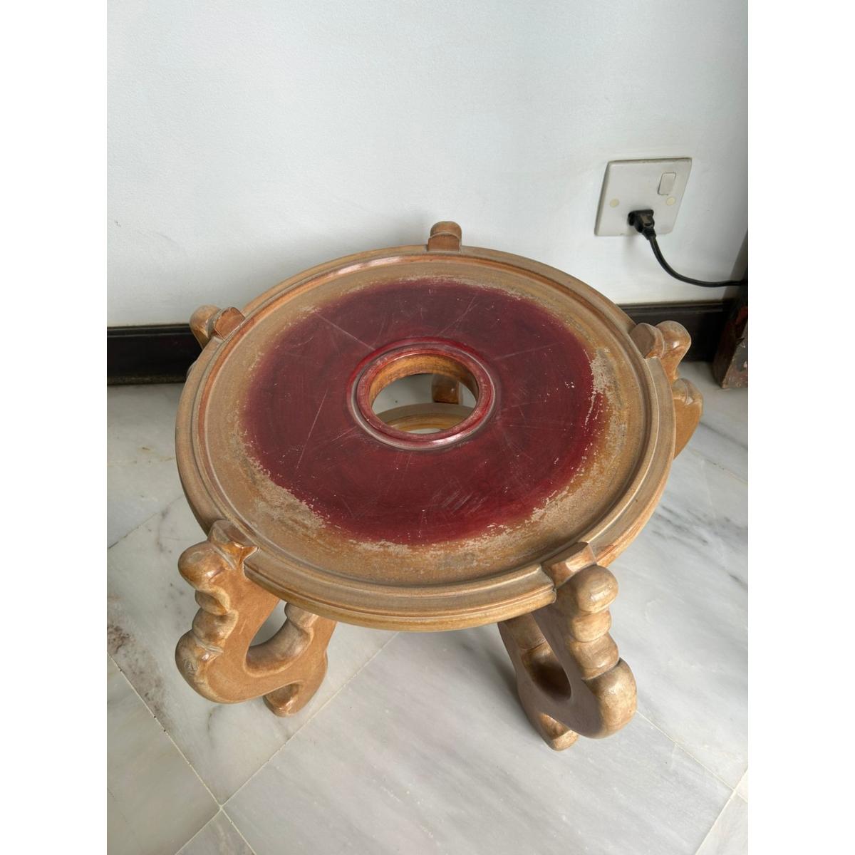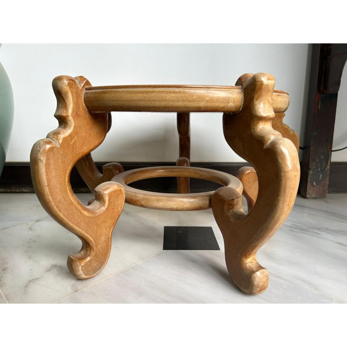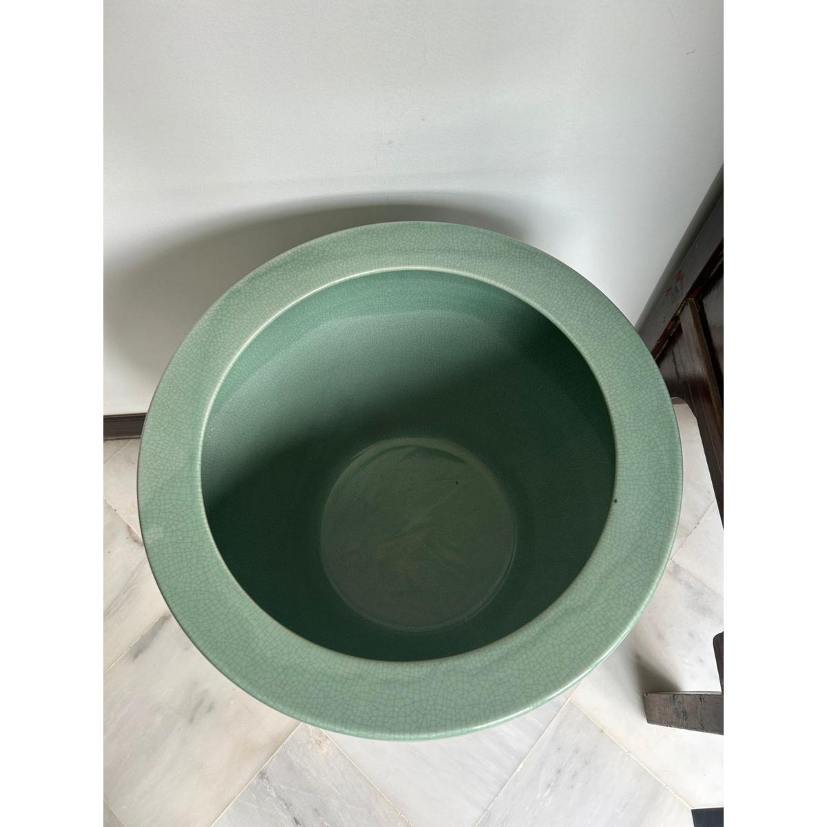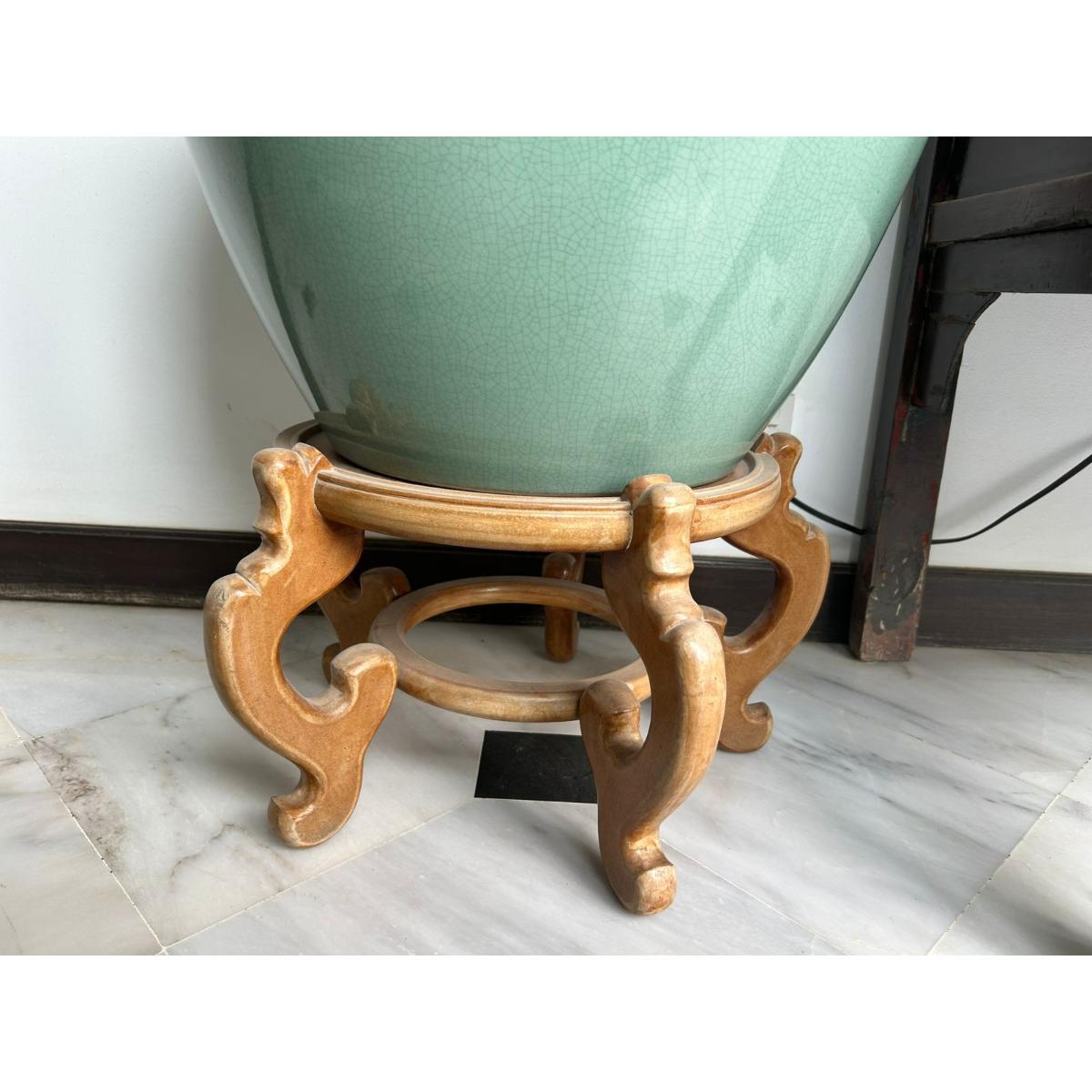 Imported celadon green ceramic planter on carved wooden stand. Exquisite crackle glaze finish, adding depth and character to its serene green hue. Ideal for indoor plants or as a striking decorative piece. The ornate wooden stand complements the pot perfectly, elevating its presence and adding a touch of traditional Asian-inspired artistry to any space.
