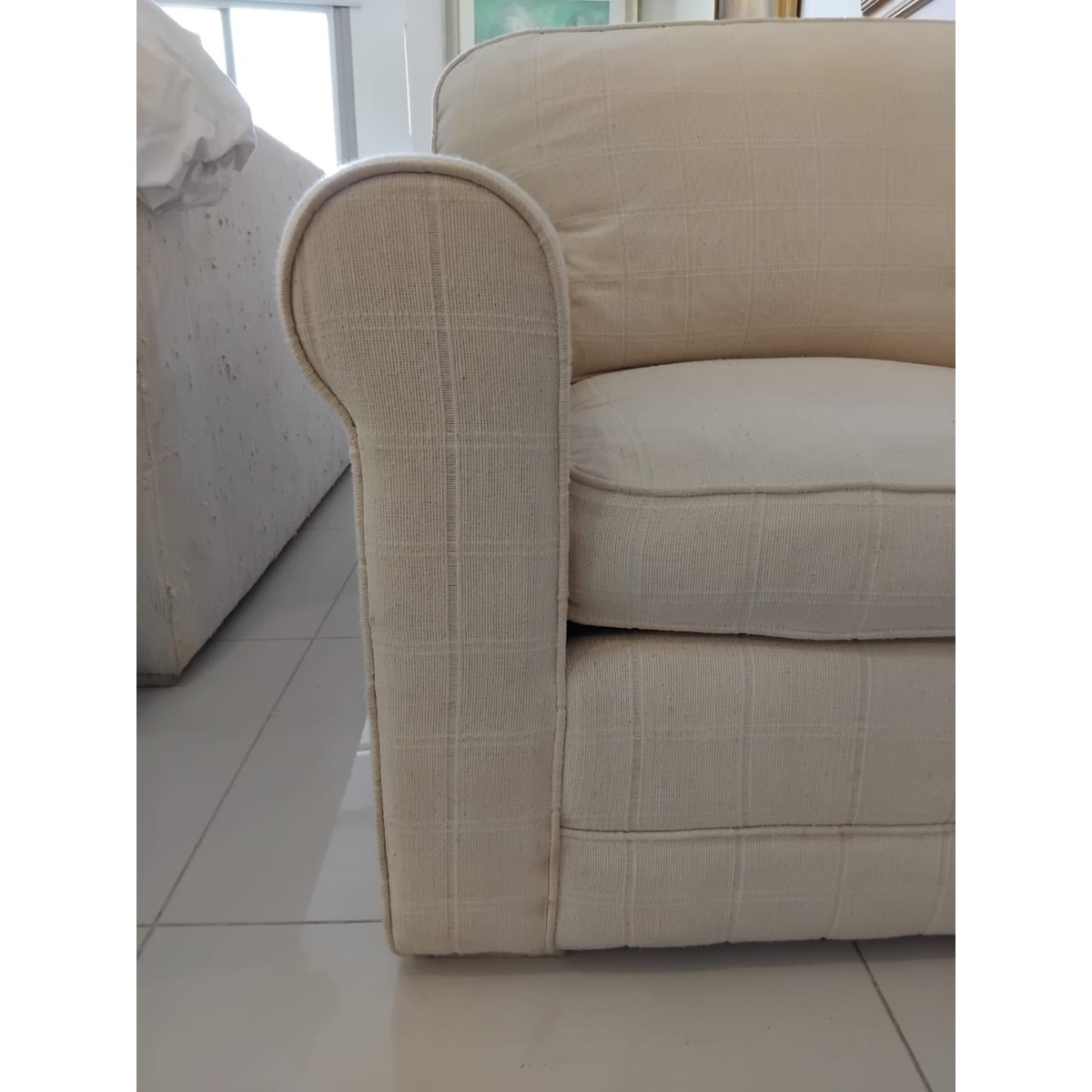 Elevate your living space with this imported armchair, designed with rolled arms and plush cushions for ultimate comfort. Upholstered in soft beige cotton fabric, these chairs offer a neutral palette that blends beautifully into any interior style.