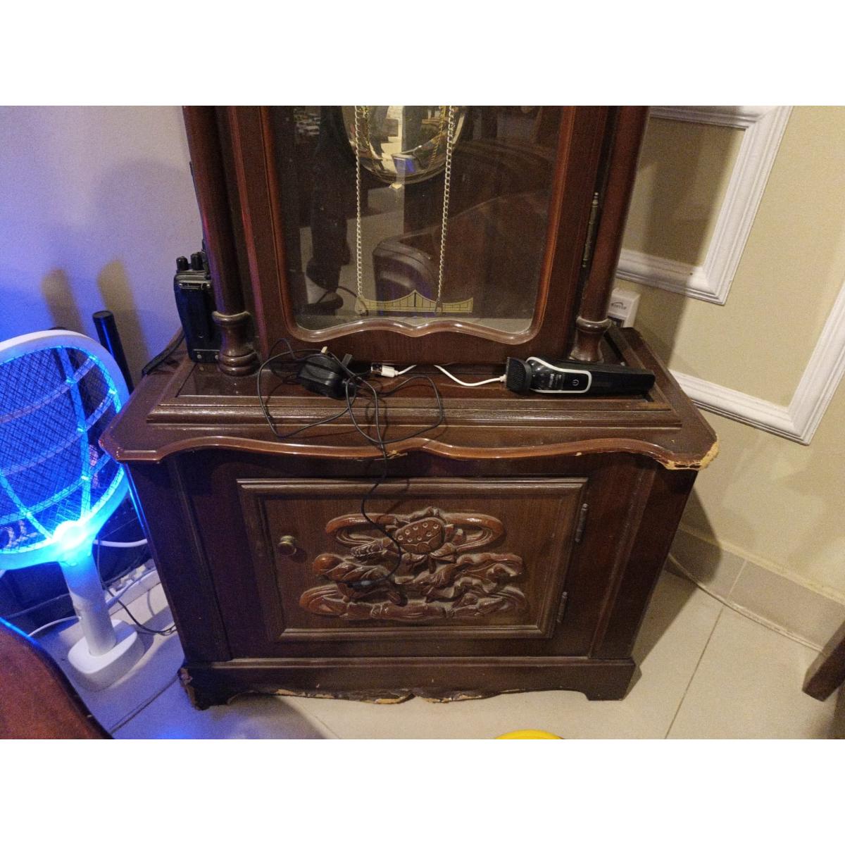 A tall, classic-style grandfather floor clock featuring a wooden cabinet with glass front, decorative dial, hanging metal weights, and pendulum detailing. This piece is ideal as a vintage décor or restoration project and adds a traditional statement to living rooms or hallways.