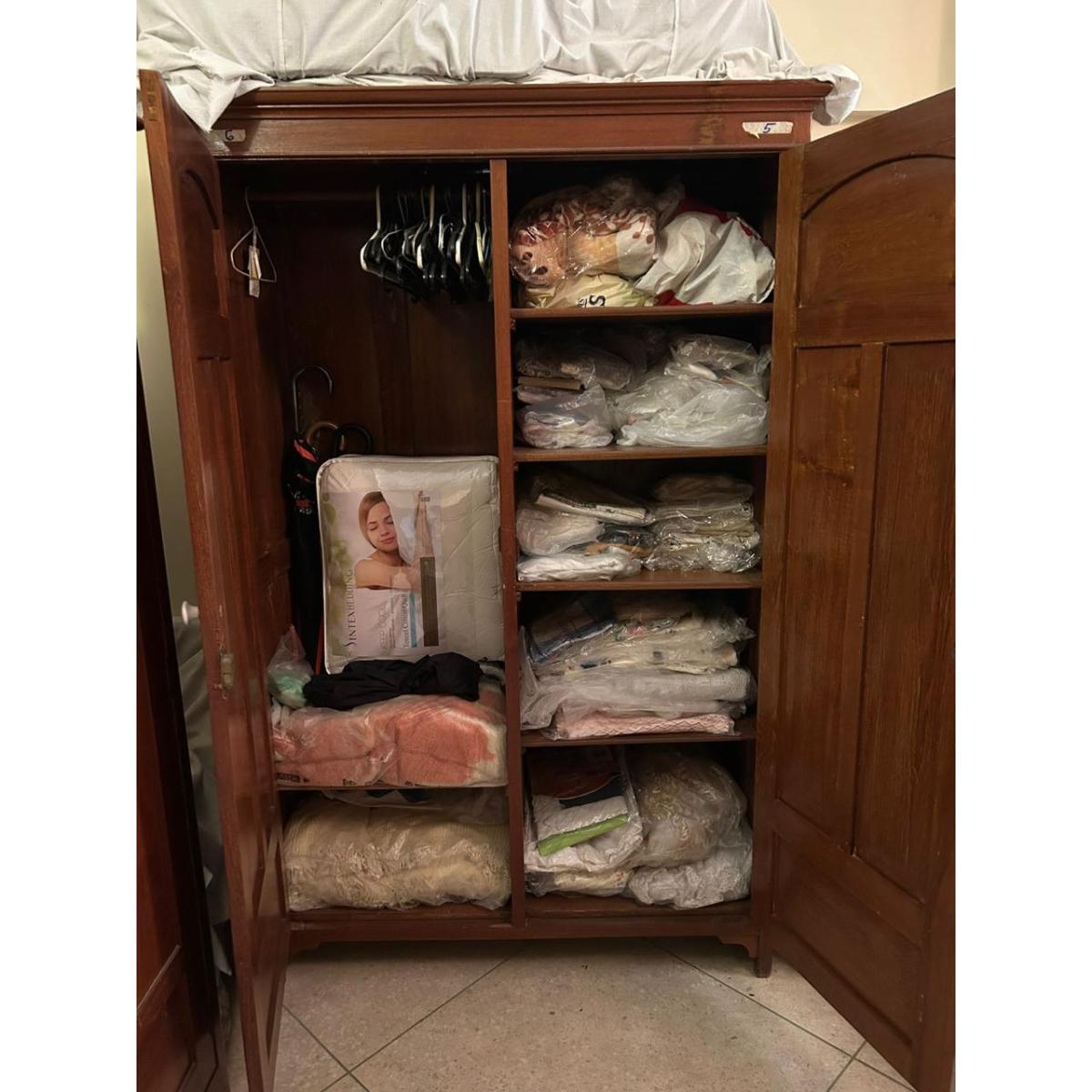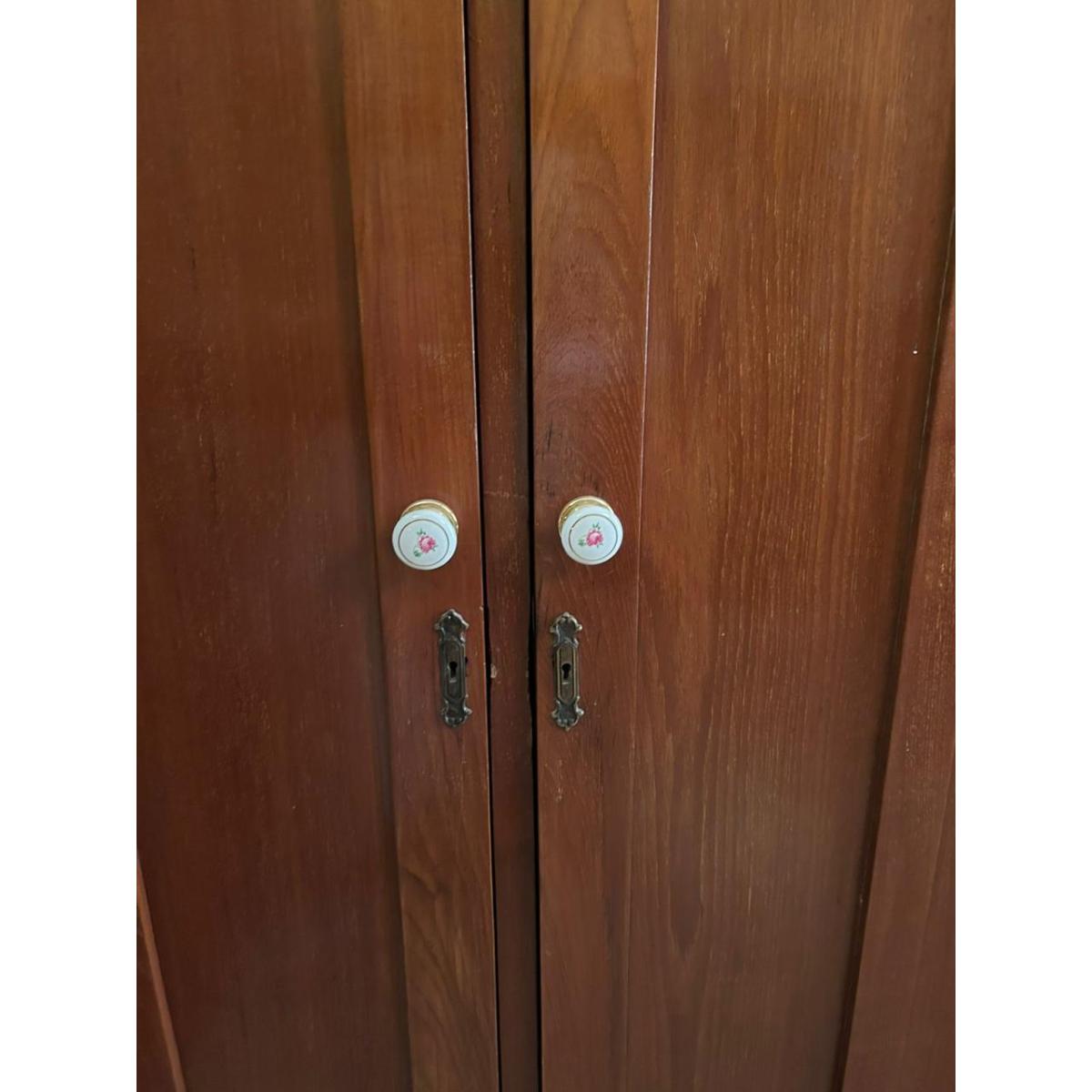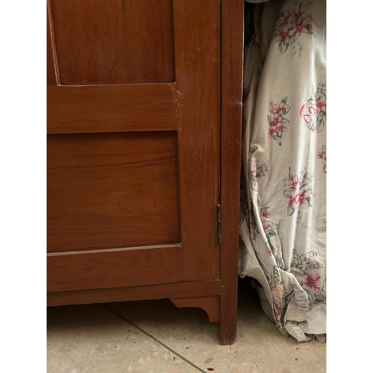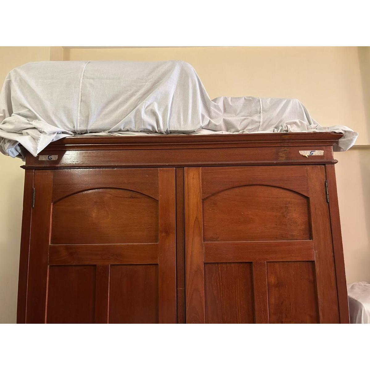 Tall wardrobe made from teak wood, featuring distinctive arched upper panels and vertical woodwork detailing. This stately piece exudes colonial charm and offers generous interior space for storage. Its durable construction and timeless design make it ideal for bedrooms or guest rooms.