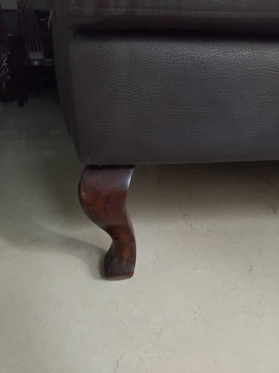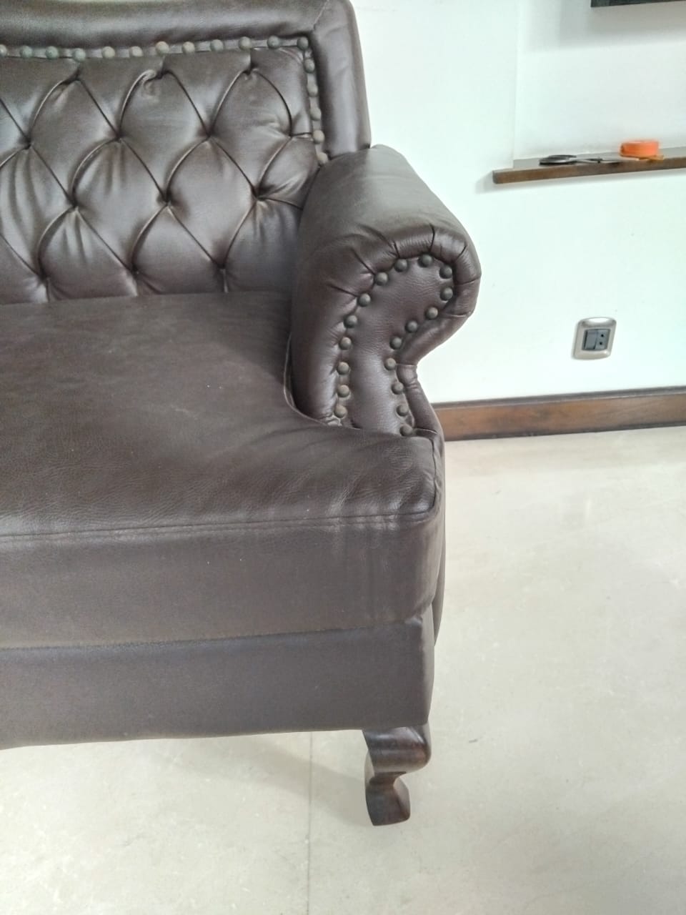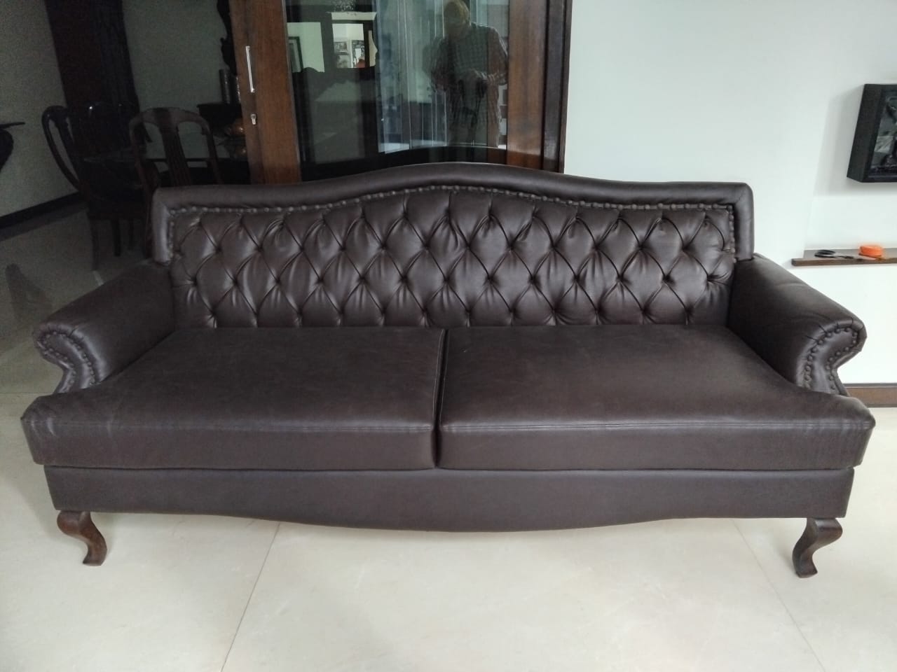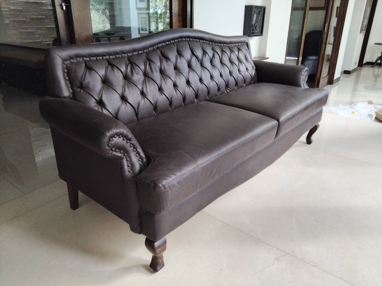 Elevate your living space with this timeless tufted leatherette sofa. Its classic design features deep button tufting, rolled arms, and elegant wooden legs, creating a sophisticated and inviting atmosphere.