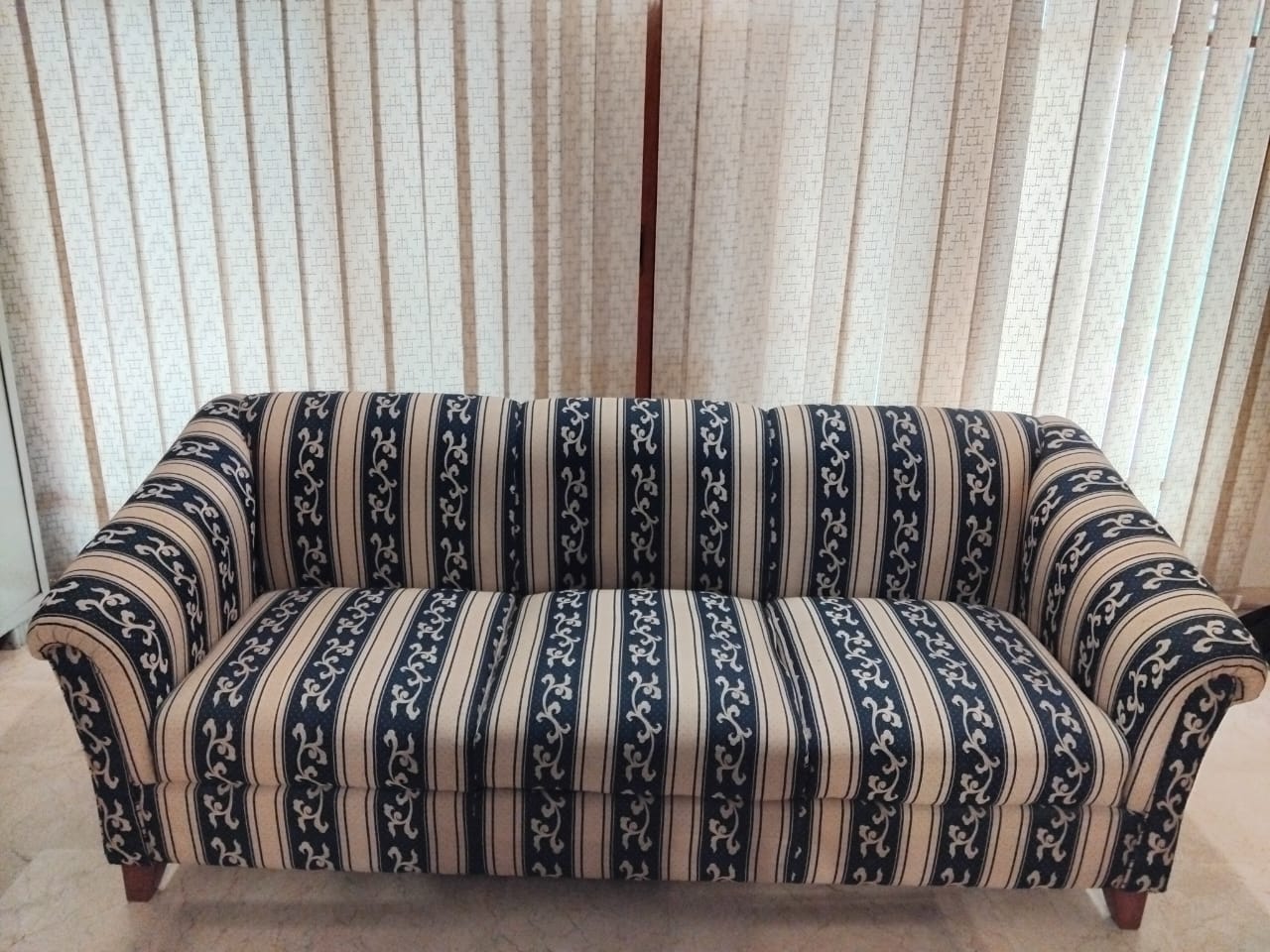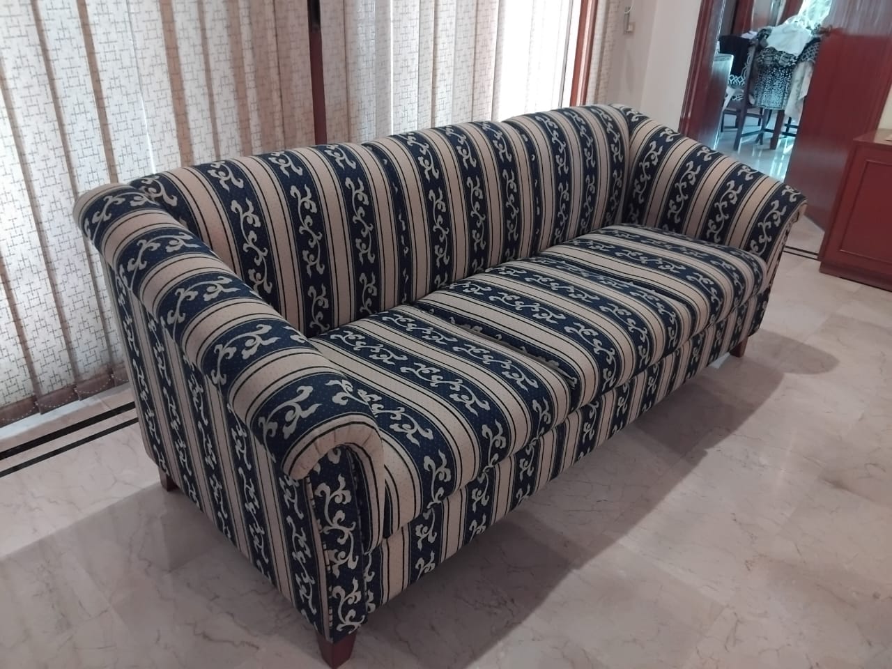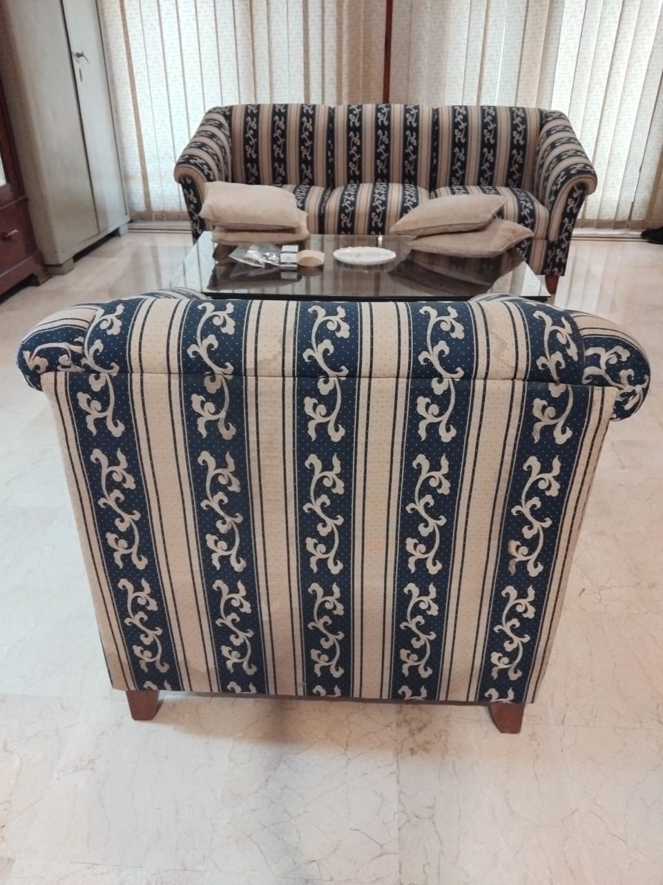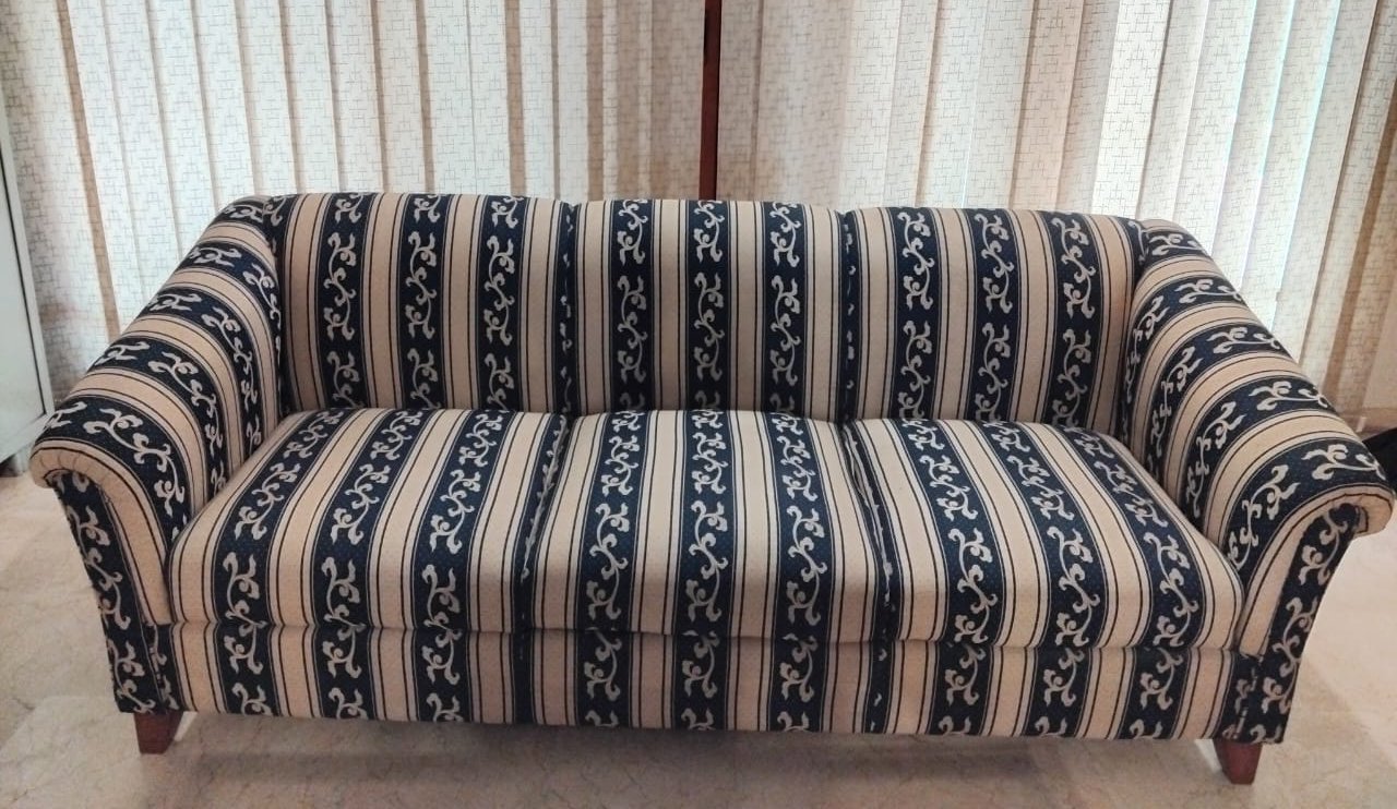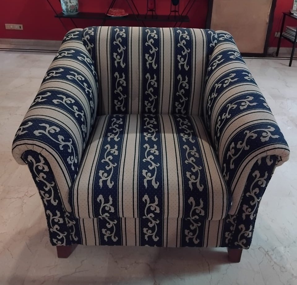 This 4-seater sofa set, comprised of one large 3 seat sofa and a single one seat sofa chair, is ready to enhance your living space. Crafted with a comfortable cotton fabric and supported by solid wooden legs, this set is designed for everyday use.
