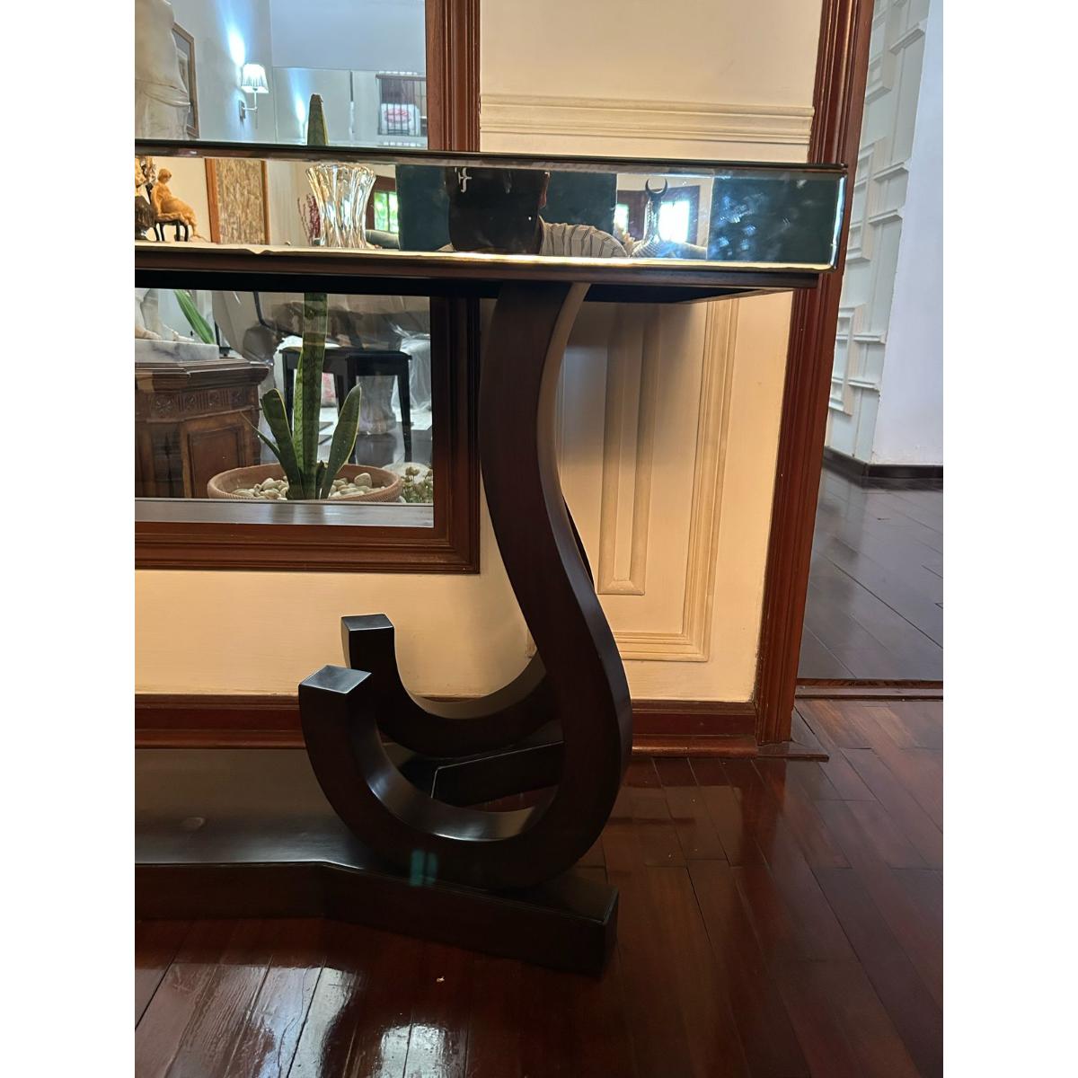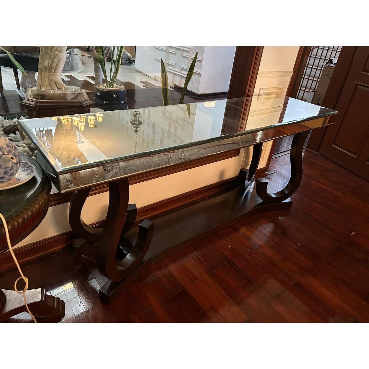 A sleek and elegant addition to any hallway, living room, or entryway, this contemporary console table blends modern design with timeless materials. Featuring a thick tempered glass top and a sculptural wooden base, the piece adds sophistication and function to your decor.