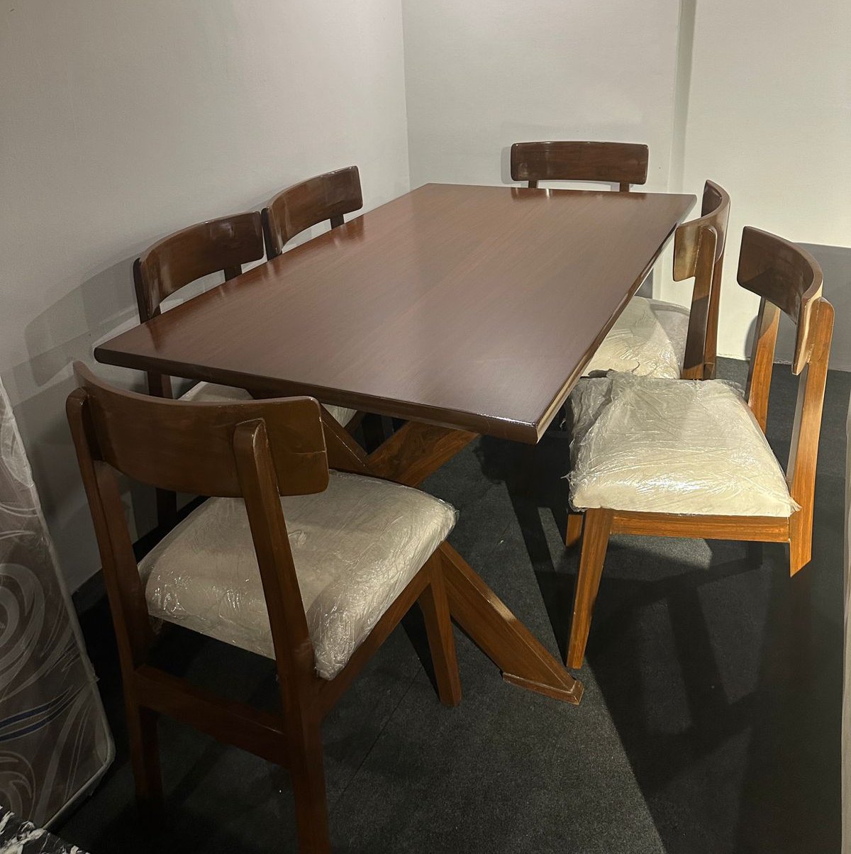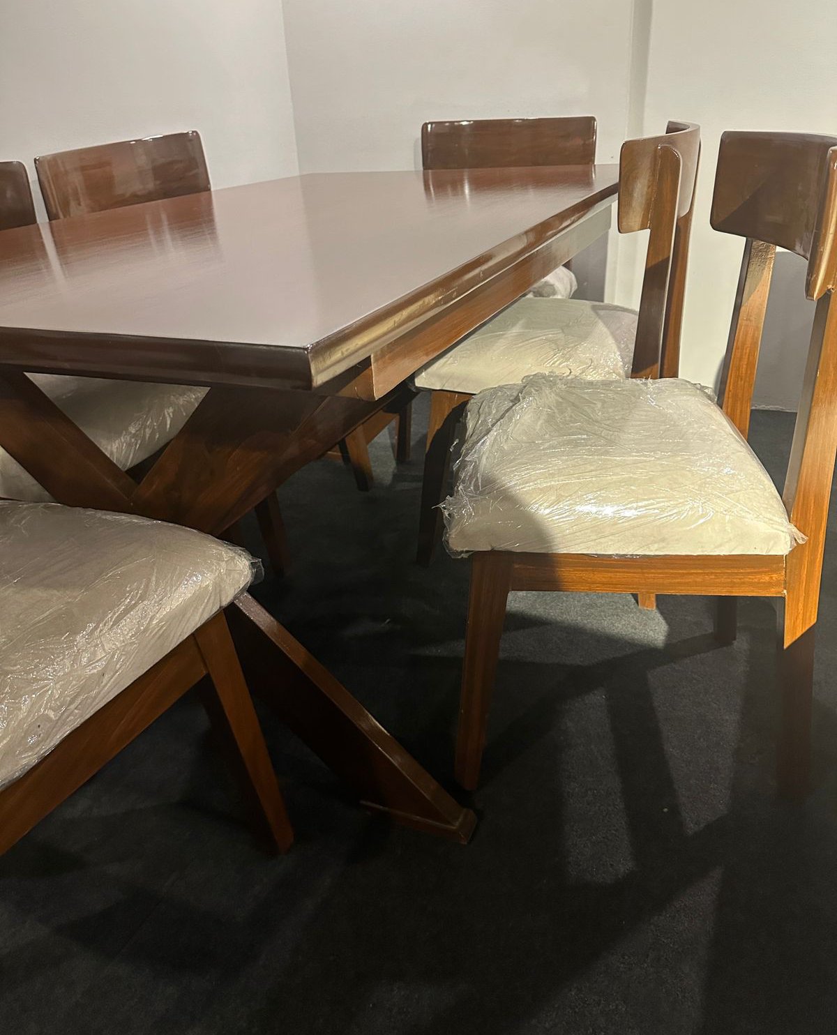 Contemporary design Sheesham wood dining table with oak top and 6 dining chairs upholstered in cream velvet fabric.