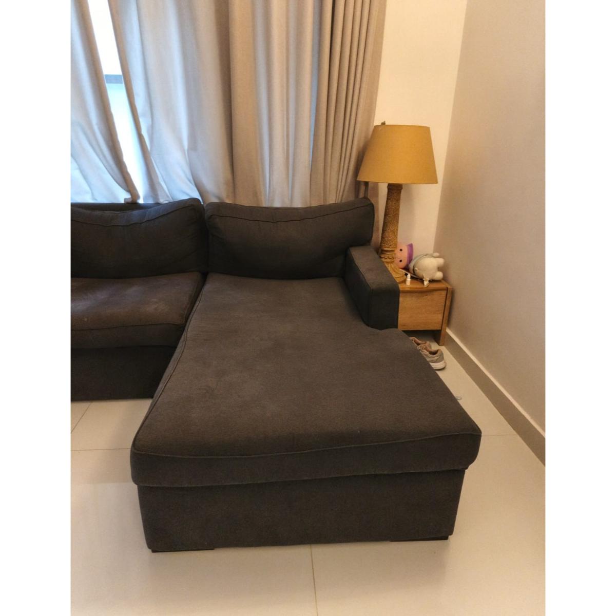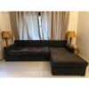 Comfortable L-shaped sectional in dark grey velvet fabric. Low arms, plush cushions, and a modern, minimal profile. Gently used and well-kept—ideal for living rooms or studio spaces.