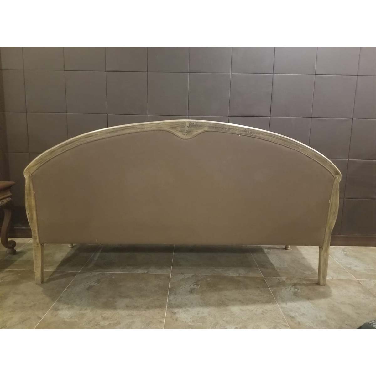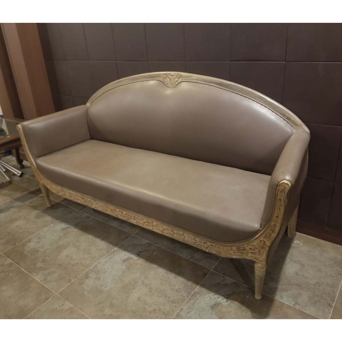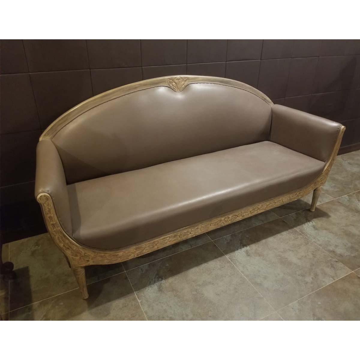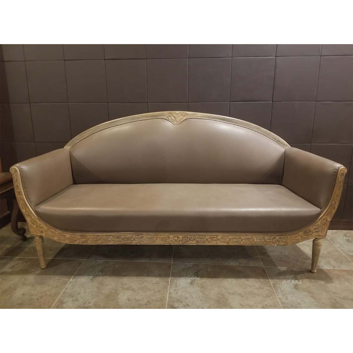 Luxurious and formal 3 seat sofa upholstered in soft gray brown leatherette with carved detailing on the base, arms and back by furniture designer Ainee Shehzad.