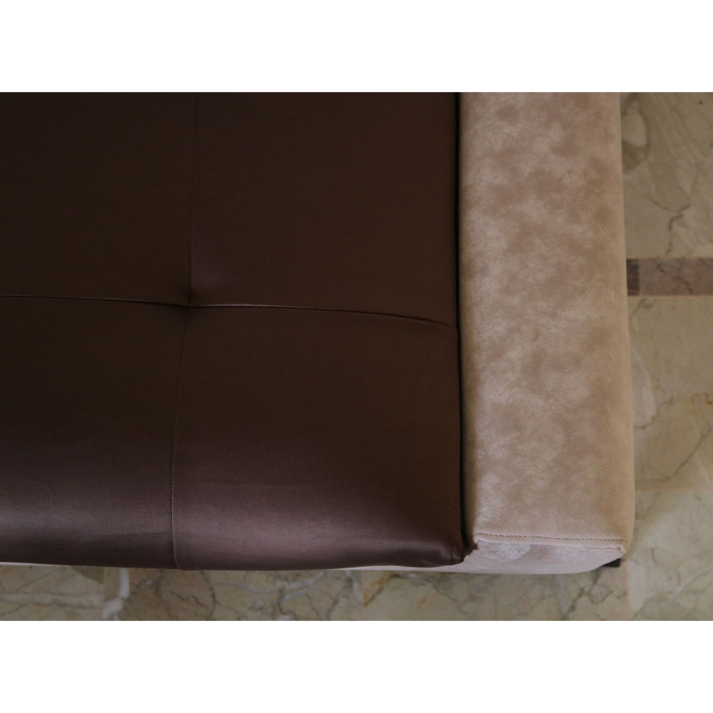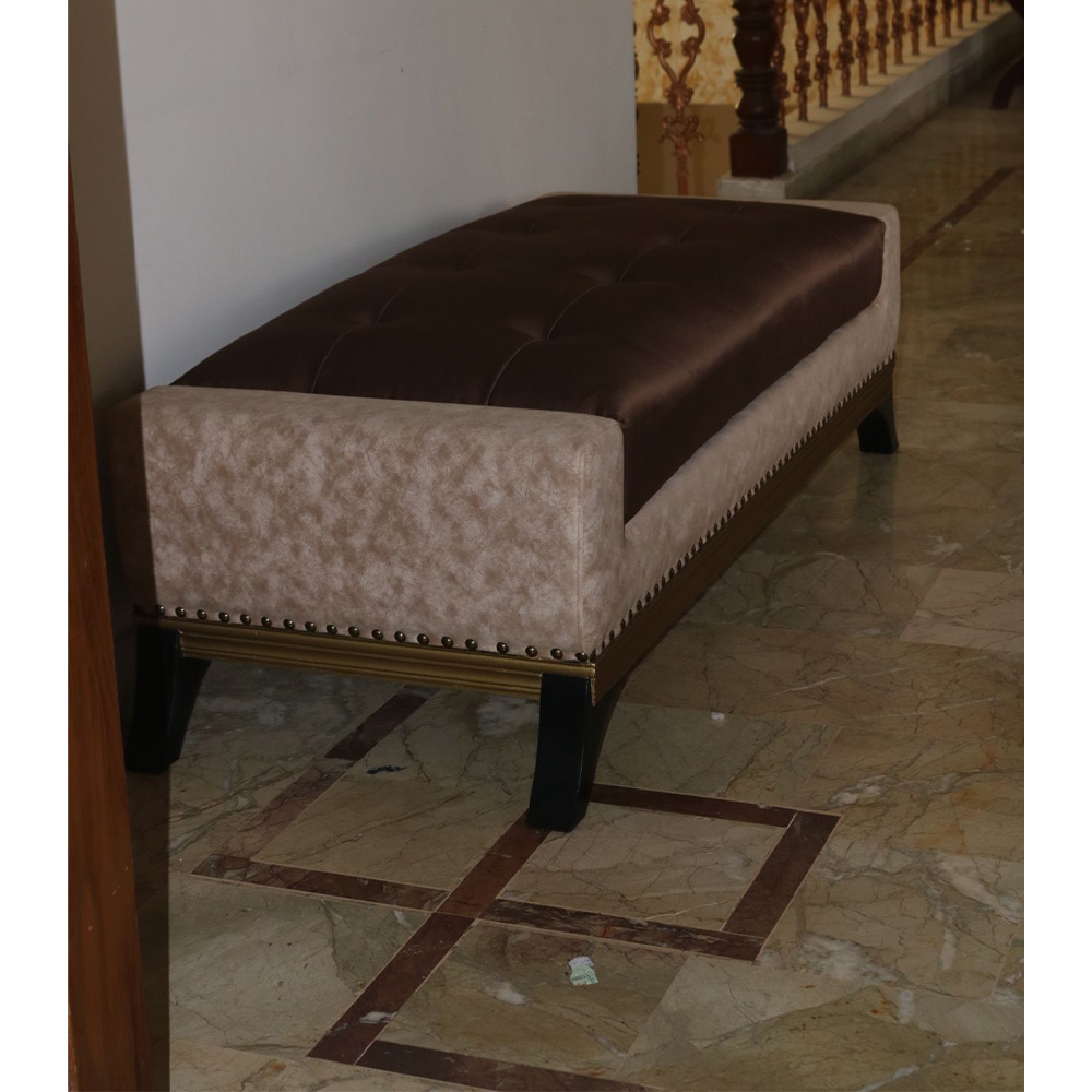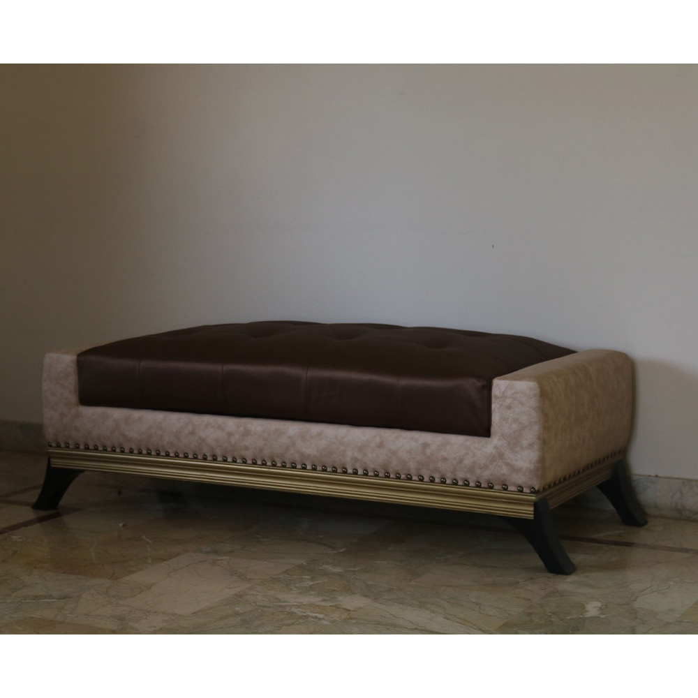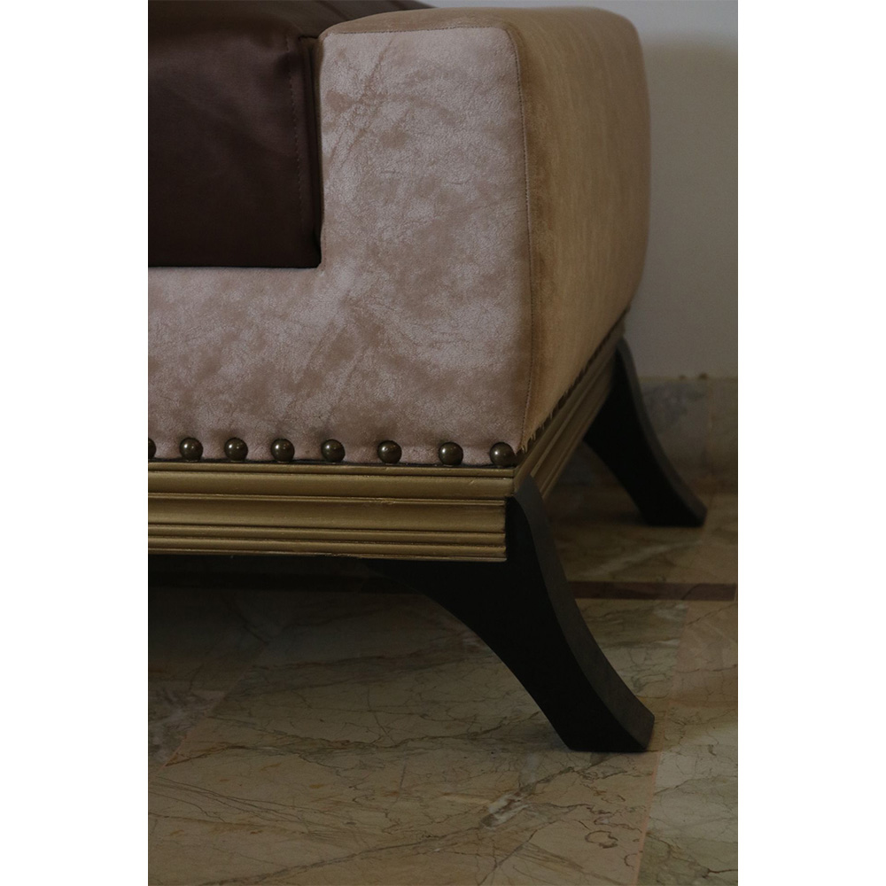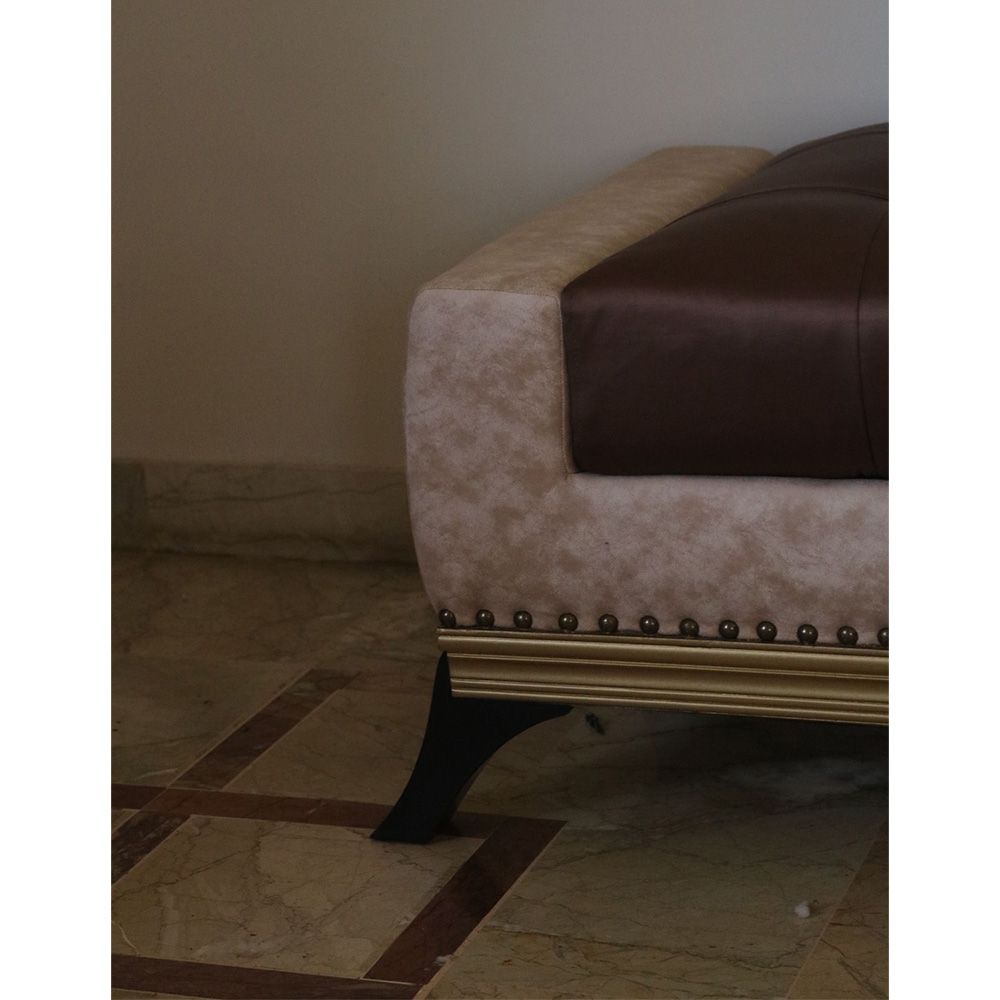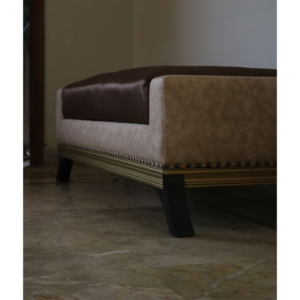 Divan or settee designed by Aysha Zamindar at Design Studio 57 with seat in brown leatherette surrounded by patterned fabric outlined by studs and a dull gold border in wood with solid wooden legs.