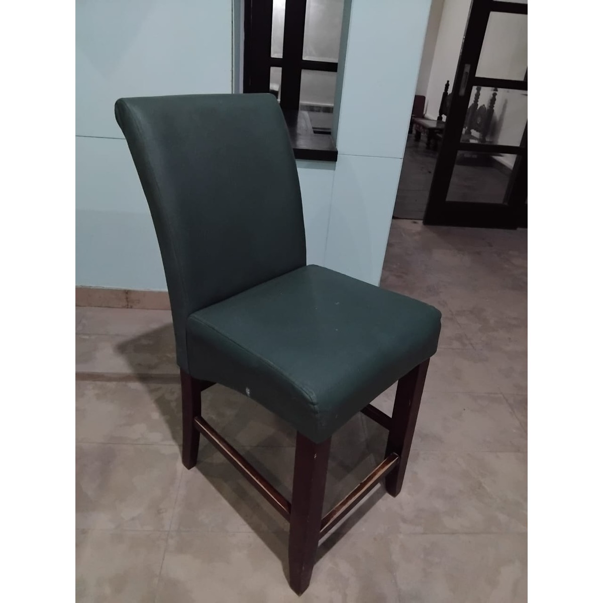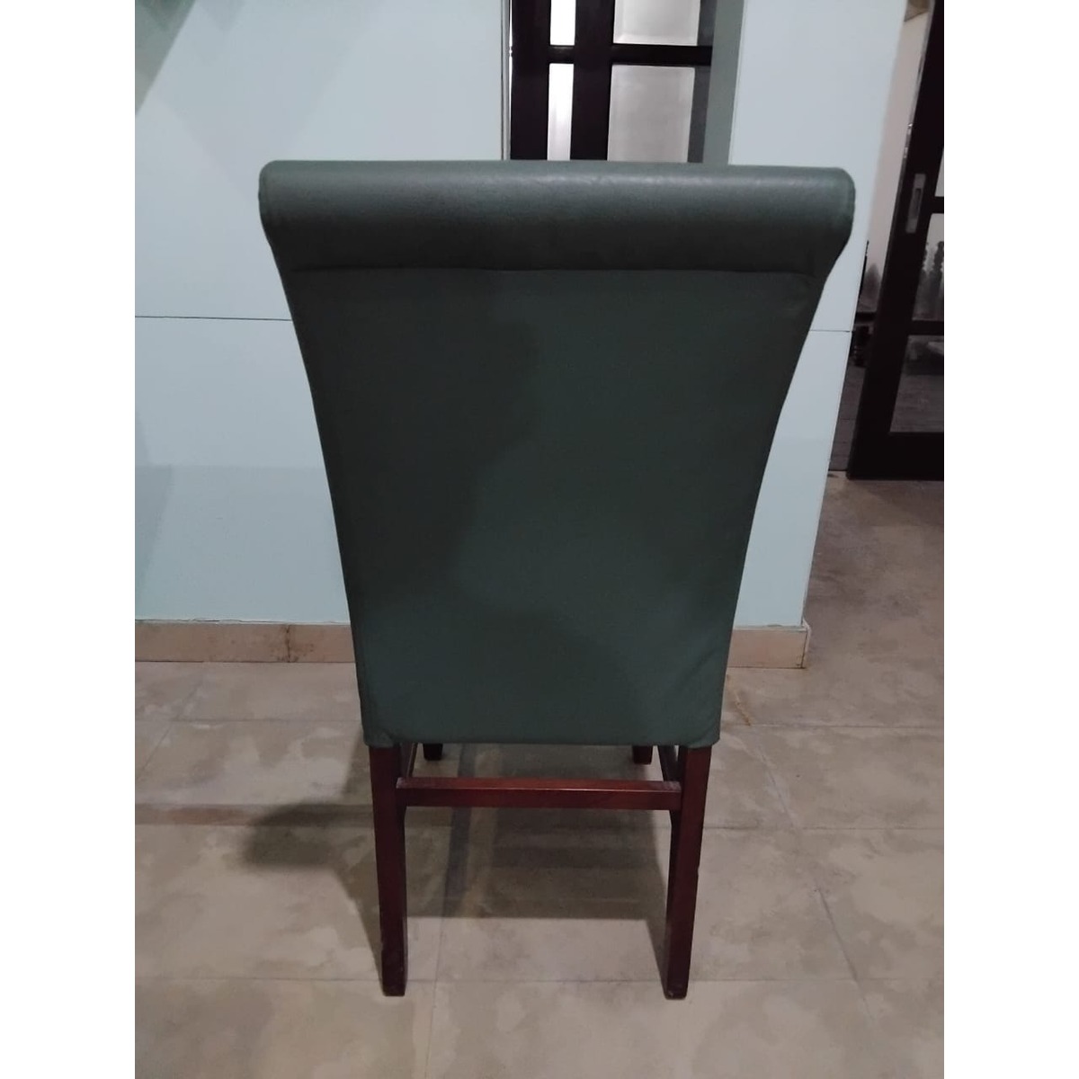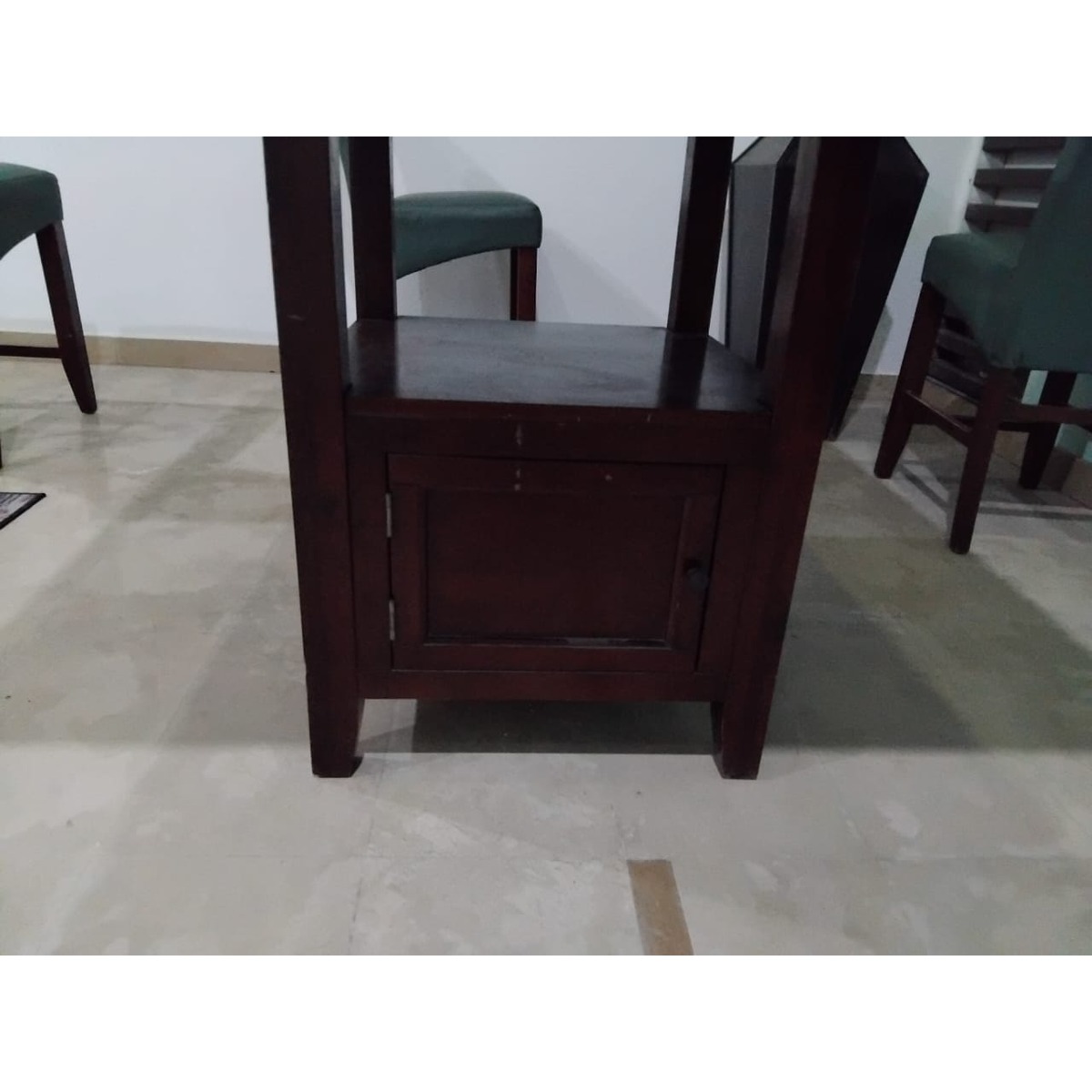 Upgrade your dining area with this elegant and sturdy 4-seater dining set. Crafted from solid wood with a rich finish, the square dining table is paired with four comfortable, high-back chairs upholstered in durable leatherette. Spacious and stylish, this set is perfect for cozy meals or small gatherings. Light polish touch-up is recommended to restore the original shine.