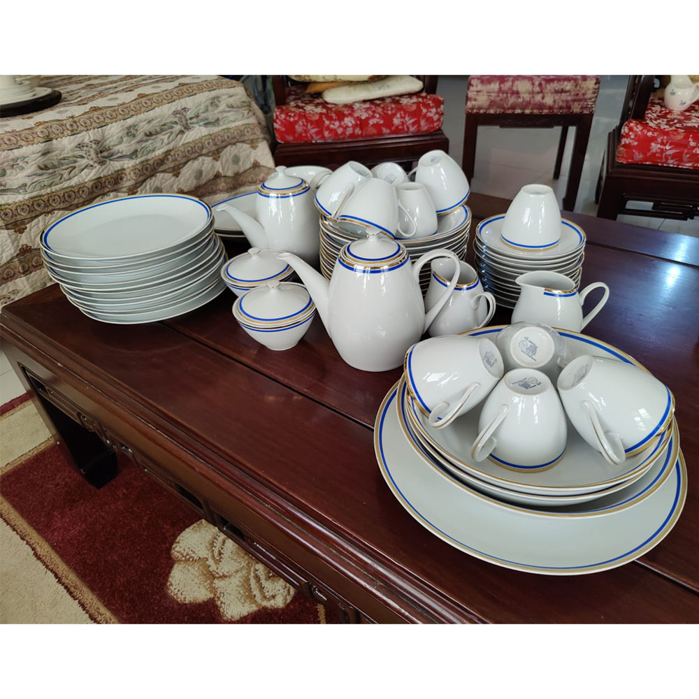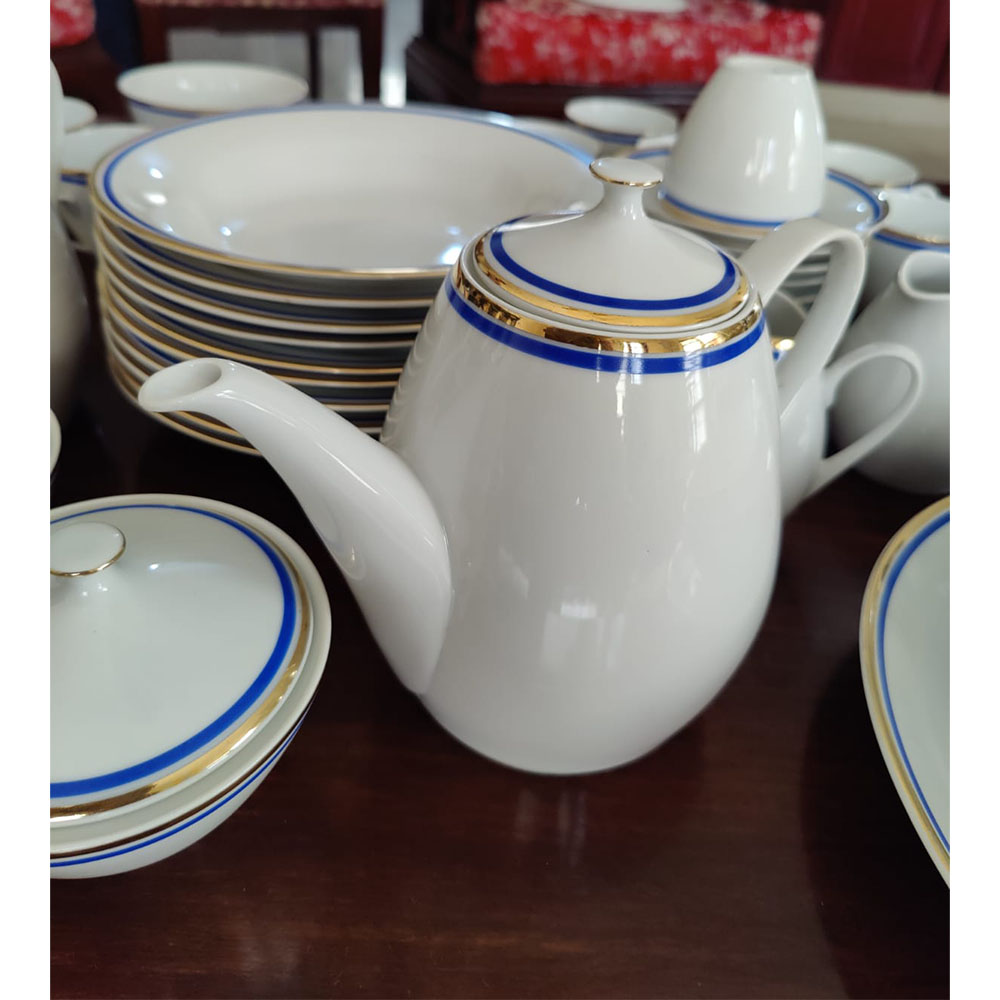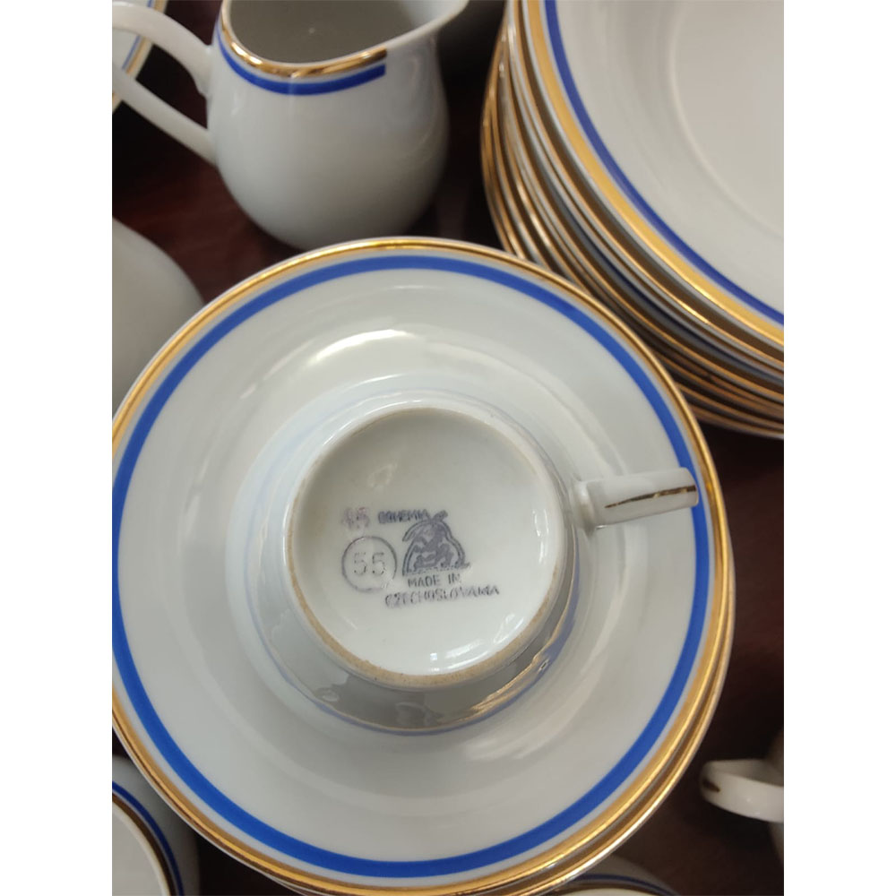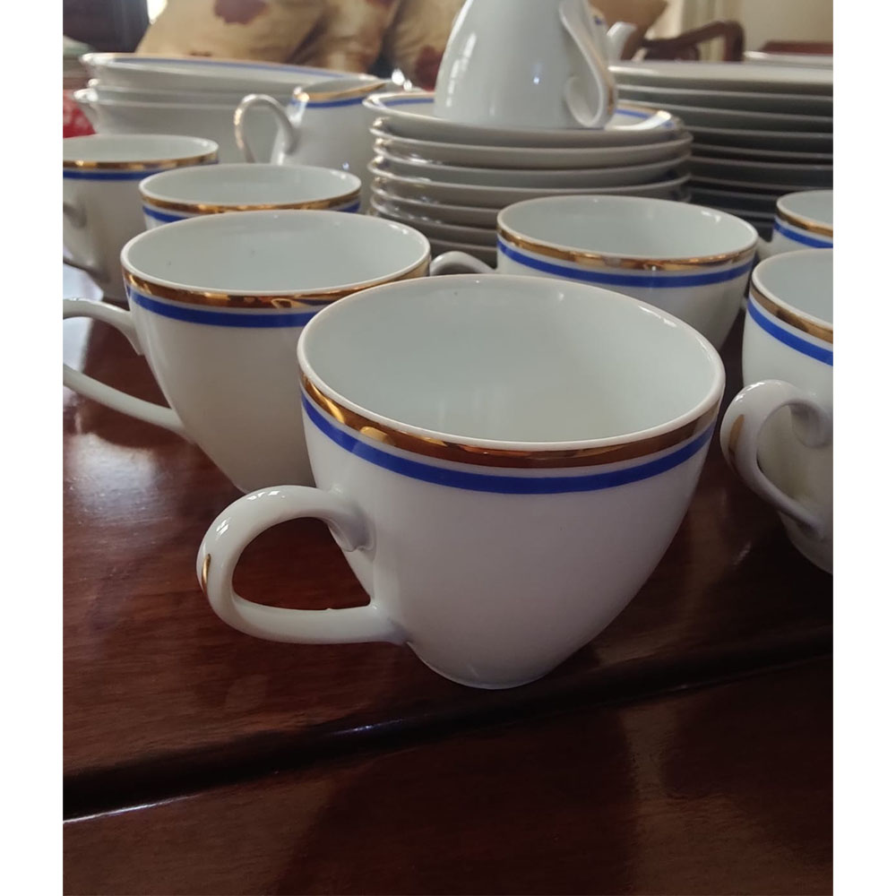 2 teapots, 2 milk pots, 2 sugar pots, 10 cups with saucers.
