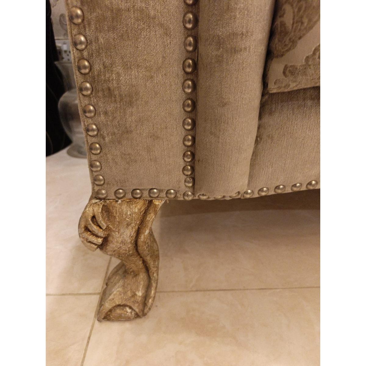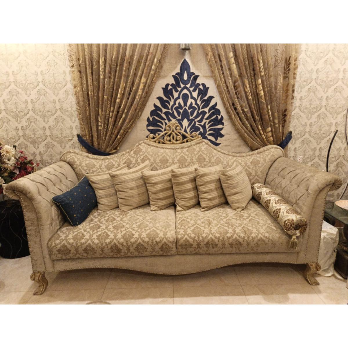 A beautifully crafted 5-seat sofa set (3 seat & 2 seat) featuring a timeless classic design with rolled arms, ornate wooden detailing, and plush jacquard fabric upholstery. Ideal for formal living rooms, this sofa offers both comfort and sophistication with generous seating and supportive cushioning.