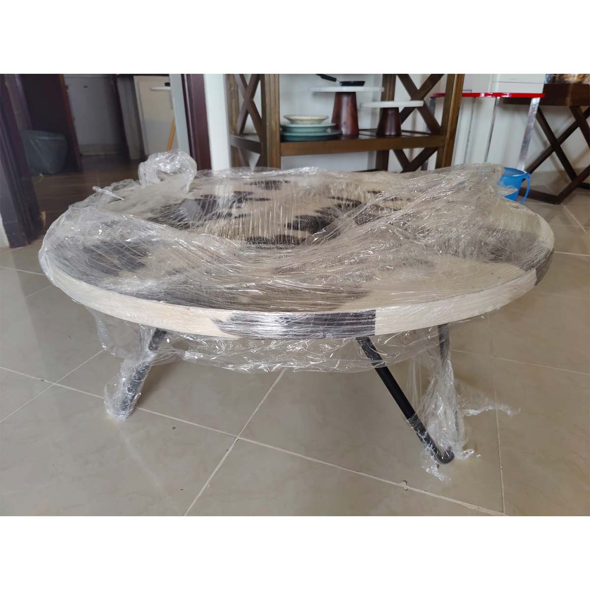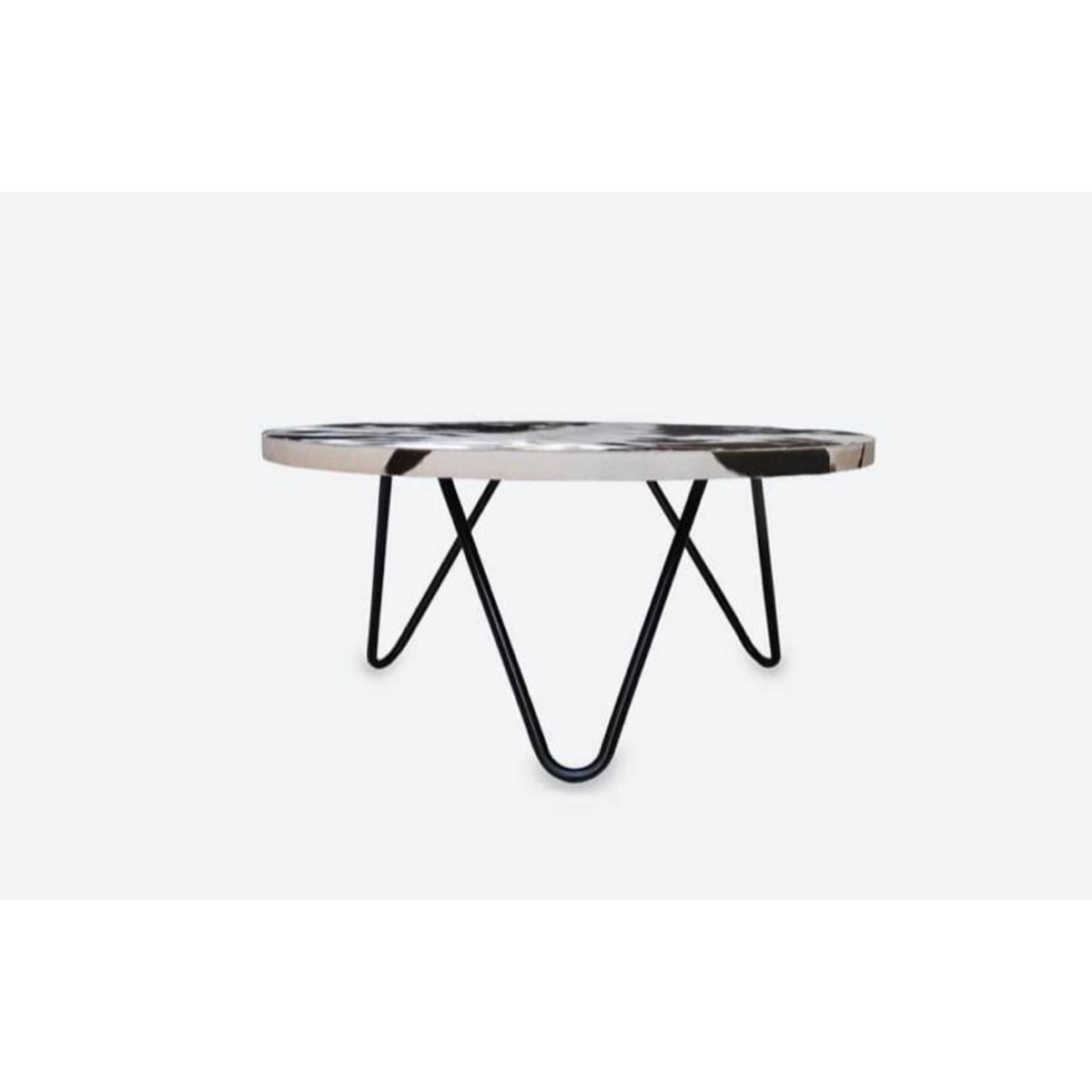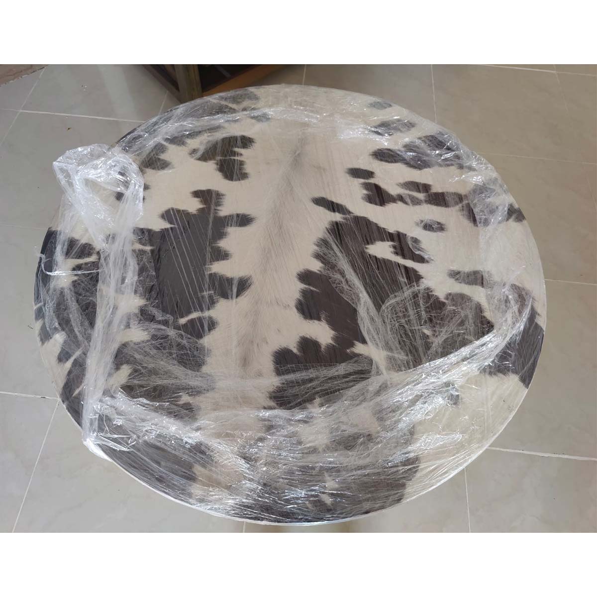 Modern designer round centre table in faux cowhide top and sleek metal base. Ideal for a study, lounge or bedroom.
