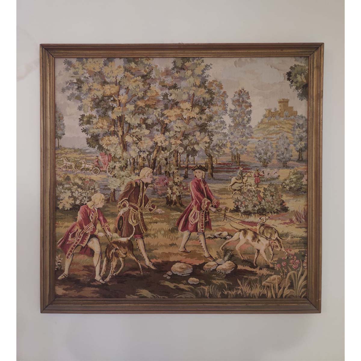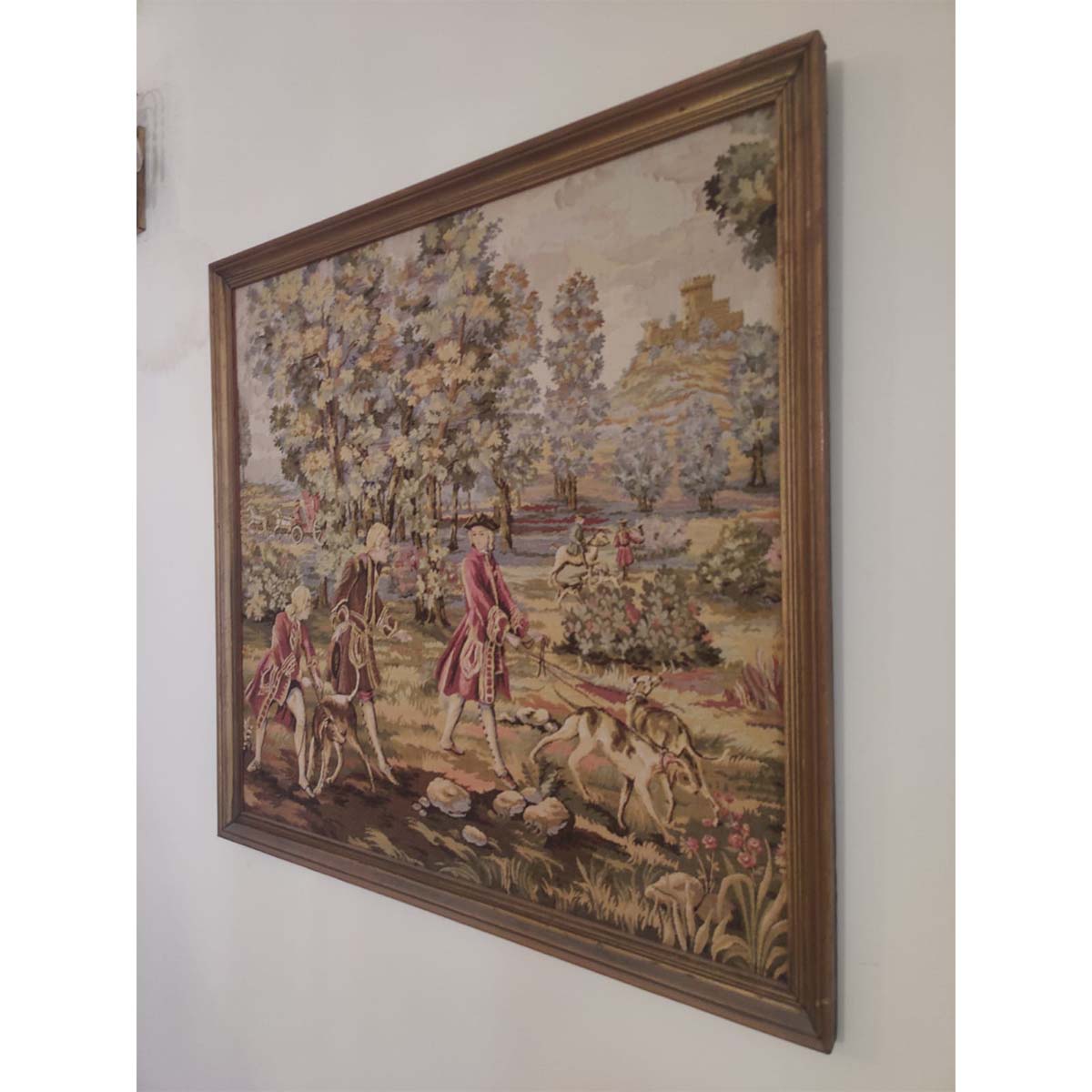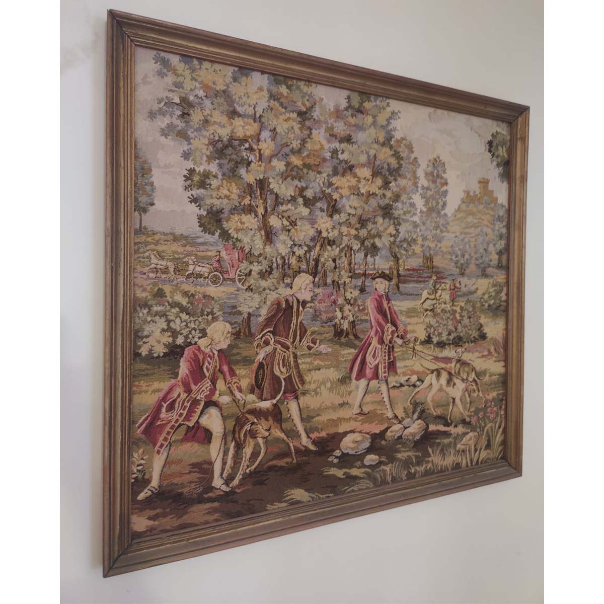 Wall hanging vintage tapestry made on loom and lovingly framed for display on the walls.