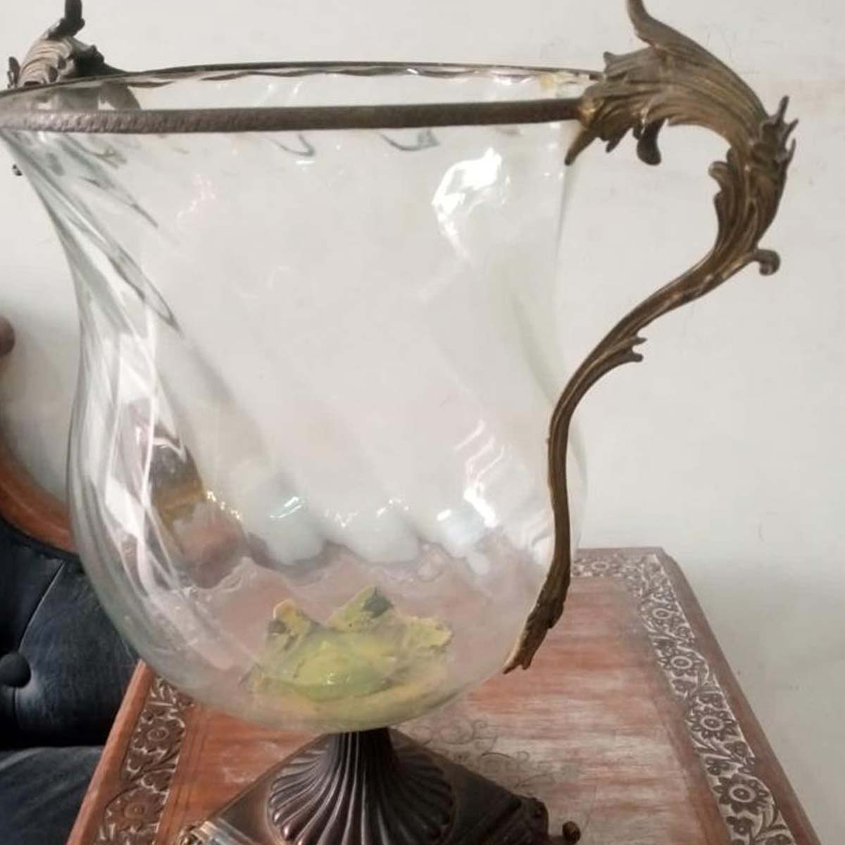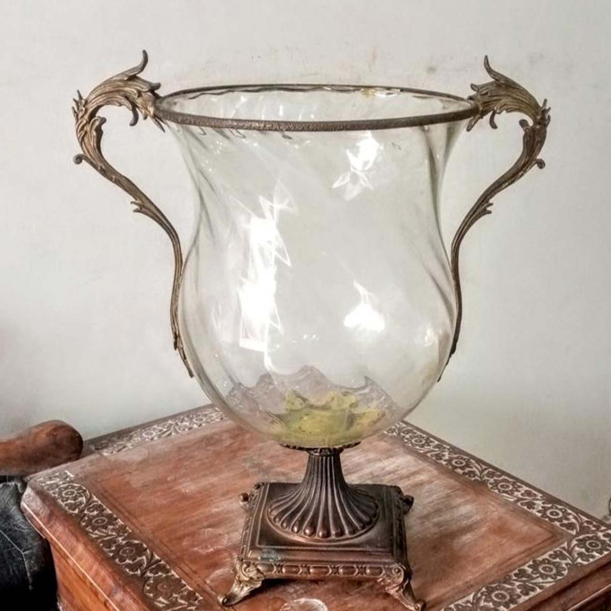 This gorgeous French victorian cut glass vase set in a brass frame is the perfect console decor piece. Use it for flowers or to hold a candle.
