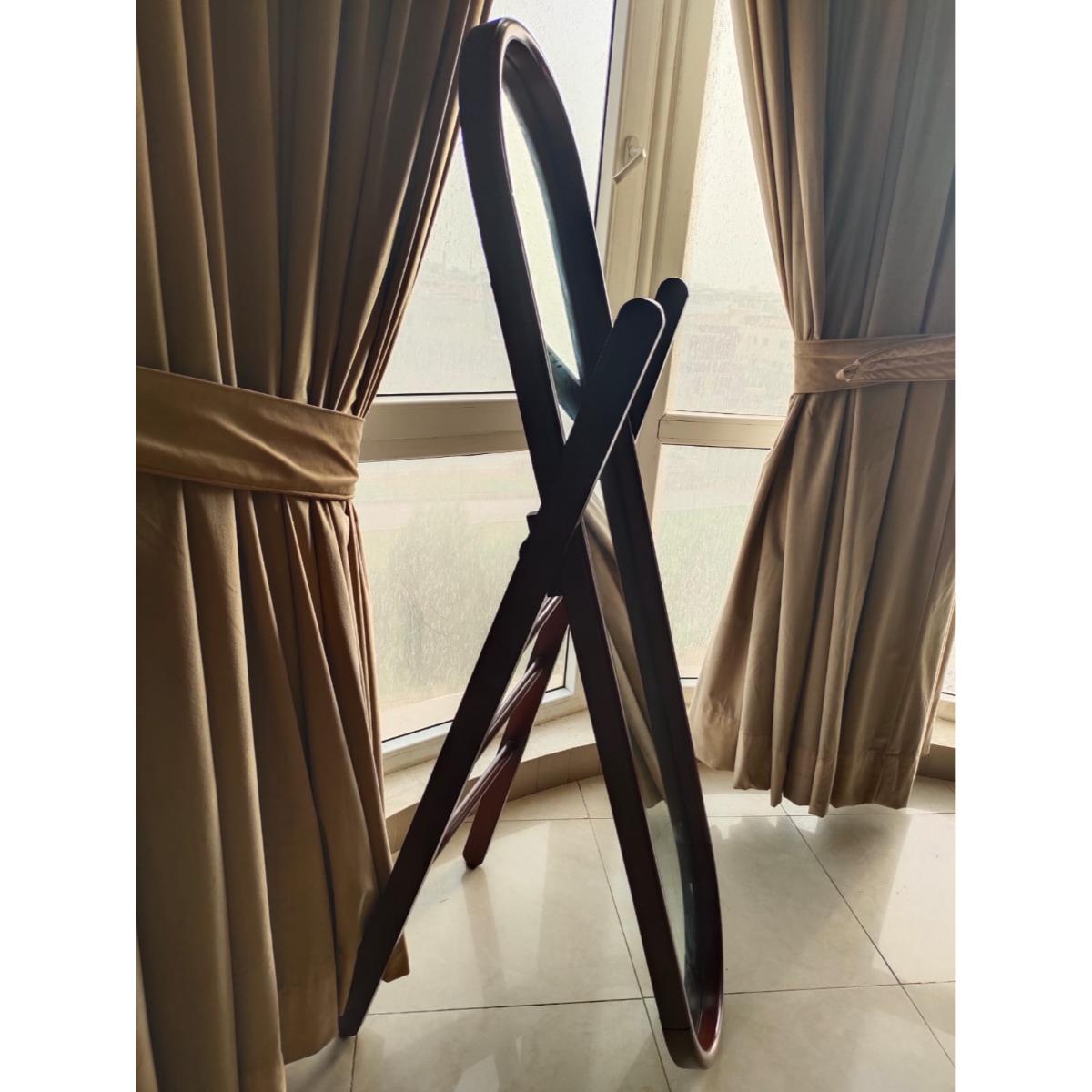 Elegant full-length standing mirror with a rich mahogany wood finish, perfect for bedrooms or dressing areas. Designed with a sleek curved top and sturdy A-frame support for stability and classic style.