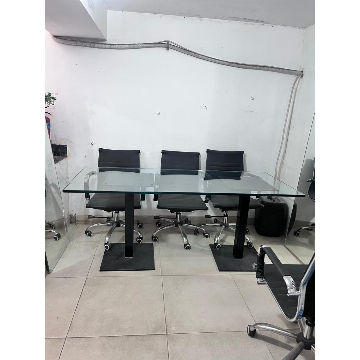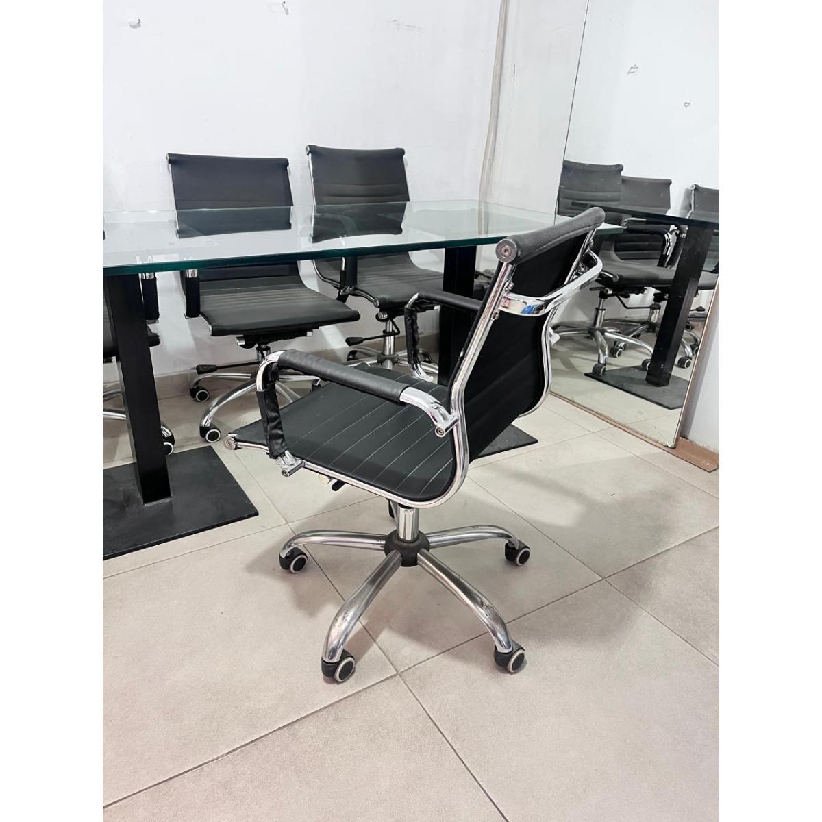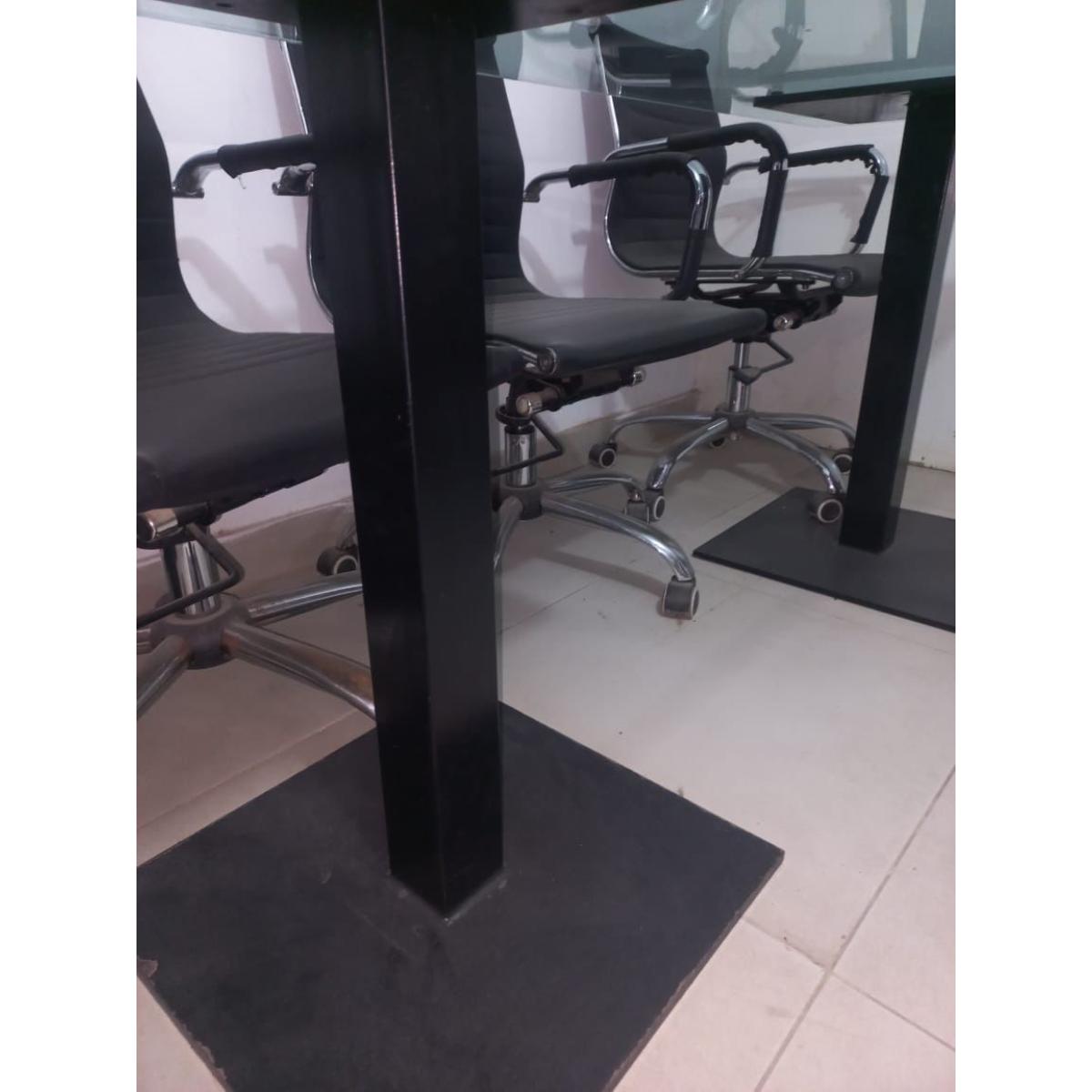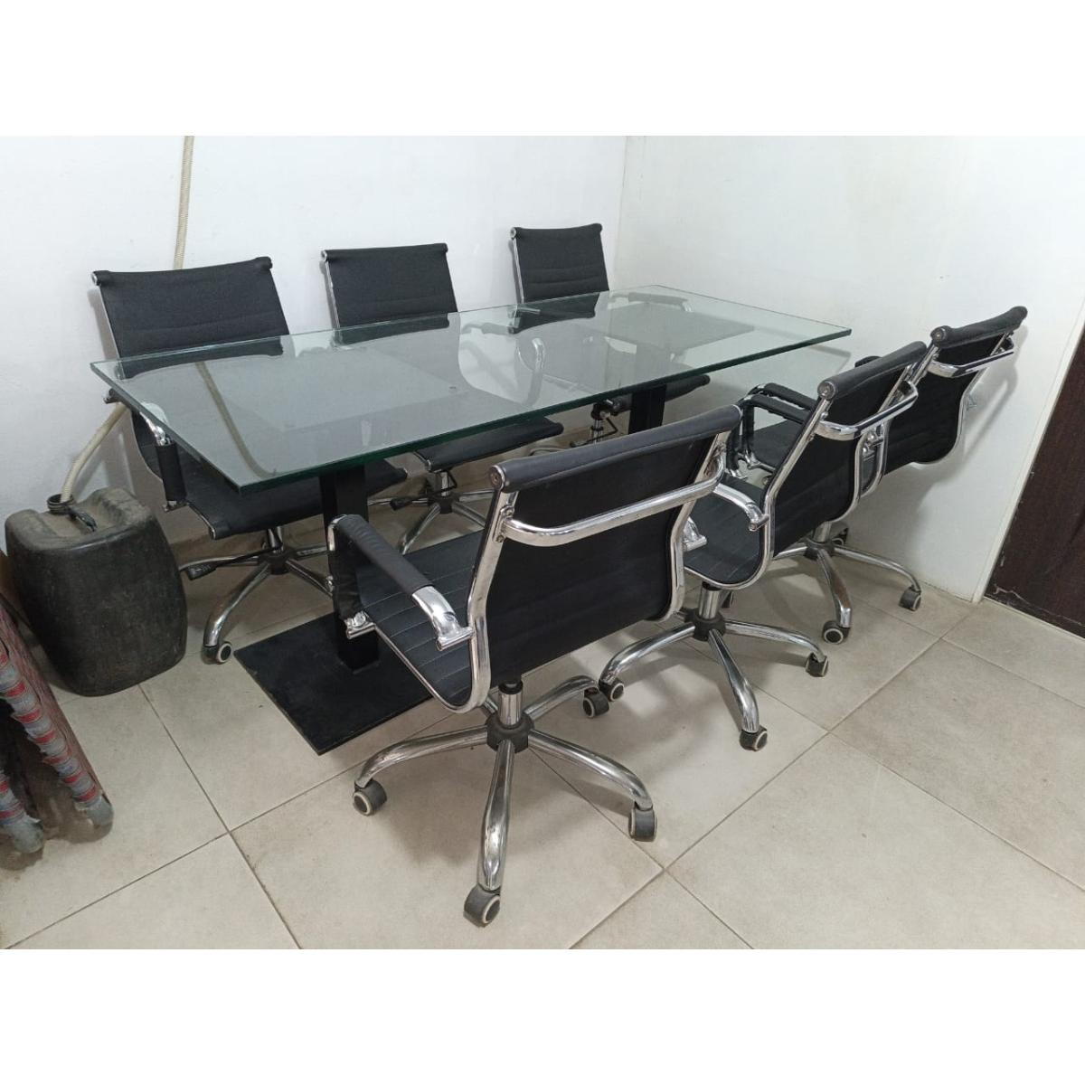 A modern glass-top conference table paired with six sleek black swivel chairs. Perfect for meeting rooms, offices, or workspaces. Strong glass, sturdy metal frame, and comfortable ergonomic chairs.