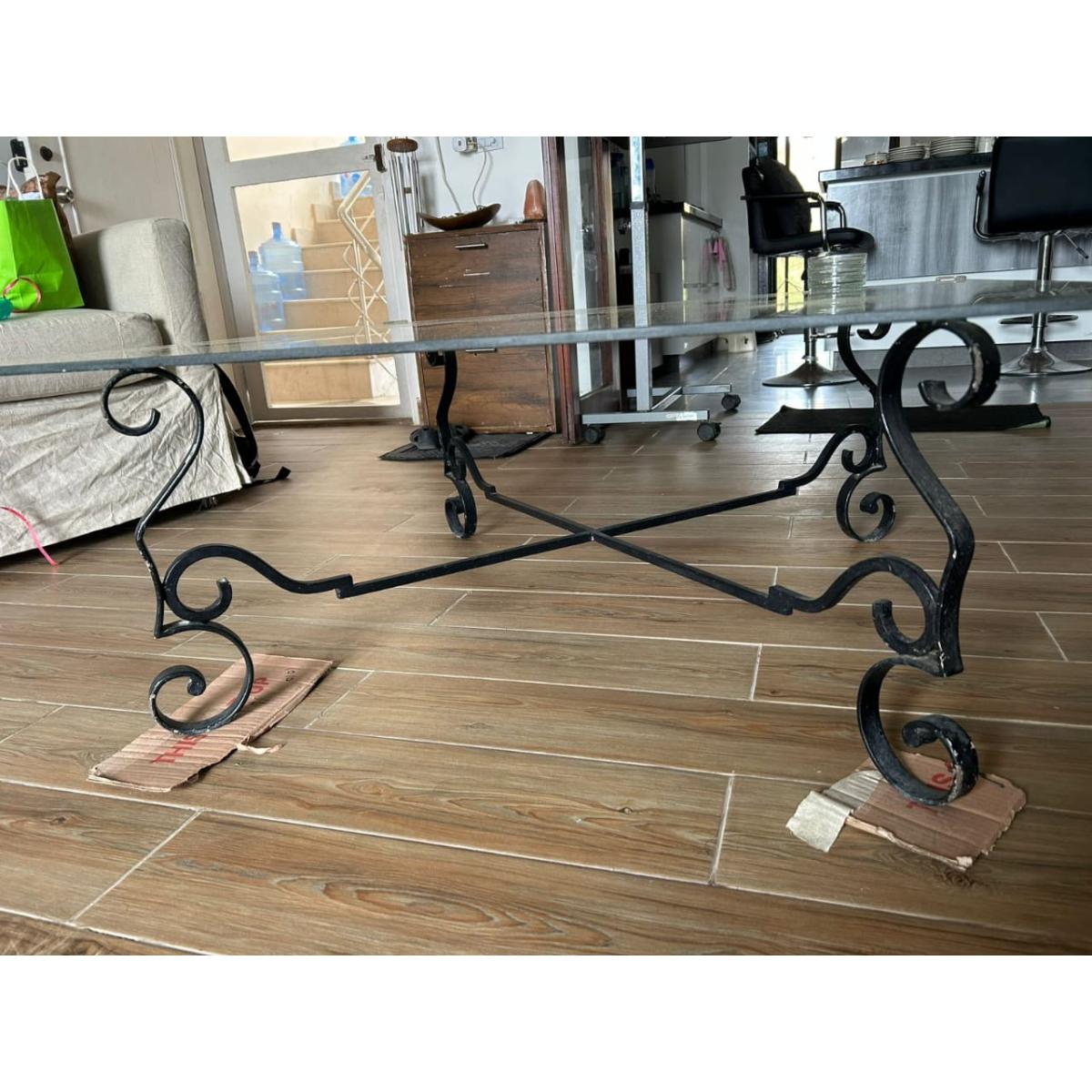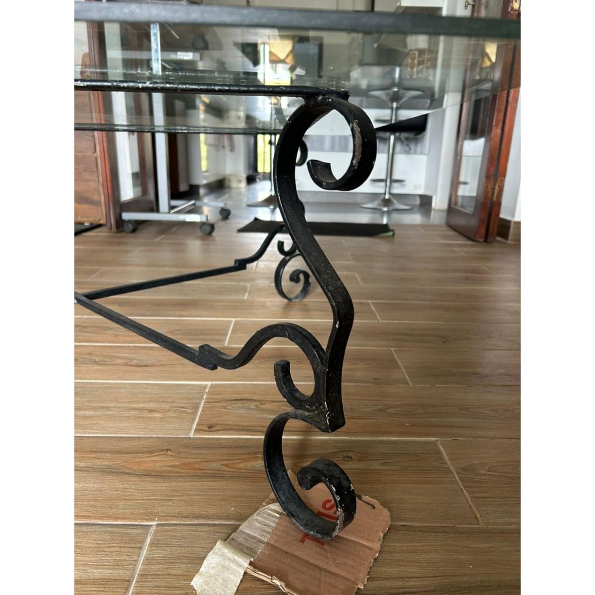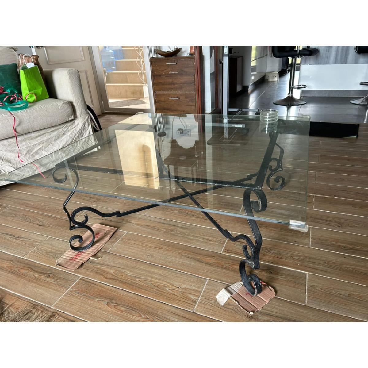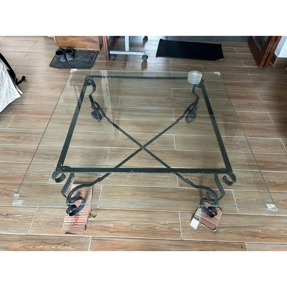 Stylish and sturdy coffee table featuring a thick glass top supported by an ornate black wrought iron base. Its square design and decorative metalwork make it a perfect center-piece for living rooms, combining elegance with durability.