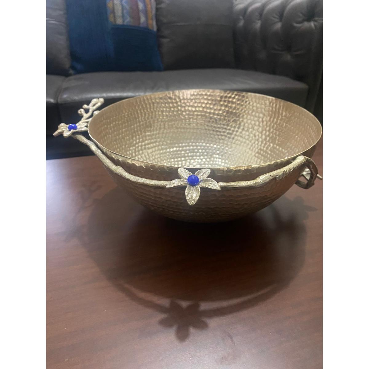 Handcrafted bowl from designer brand Taneez, featuring a hammered metal finish with intricate floral handles embellished with blue stone details. A perfect statement piece for dining tables, coffee tables, or as a centerpiece.