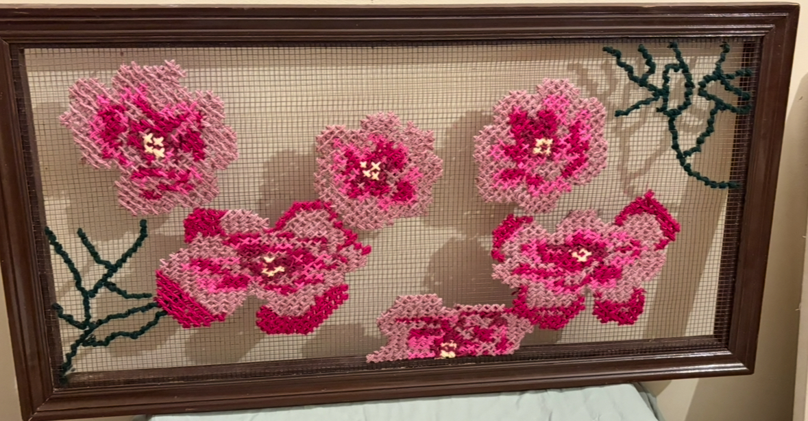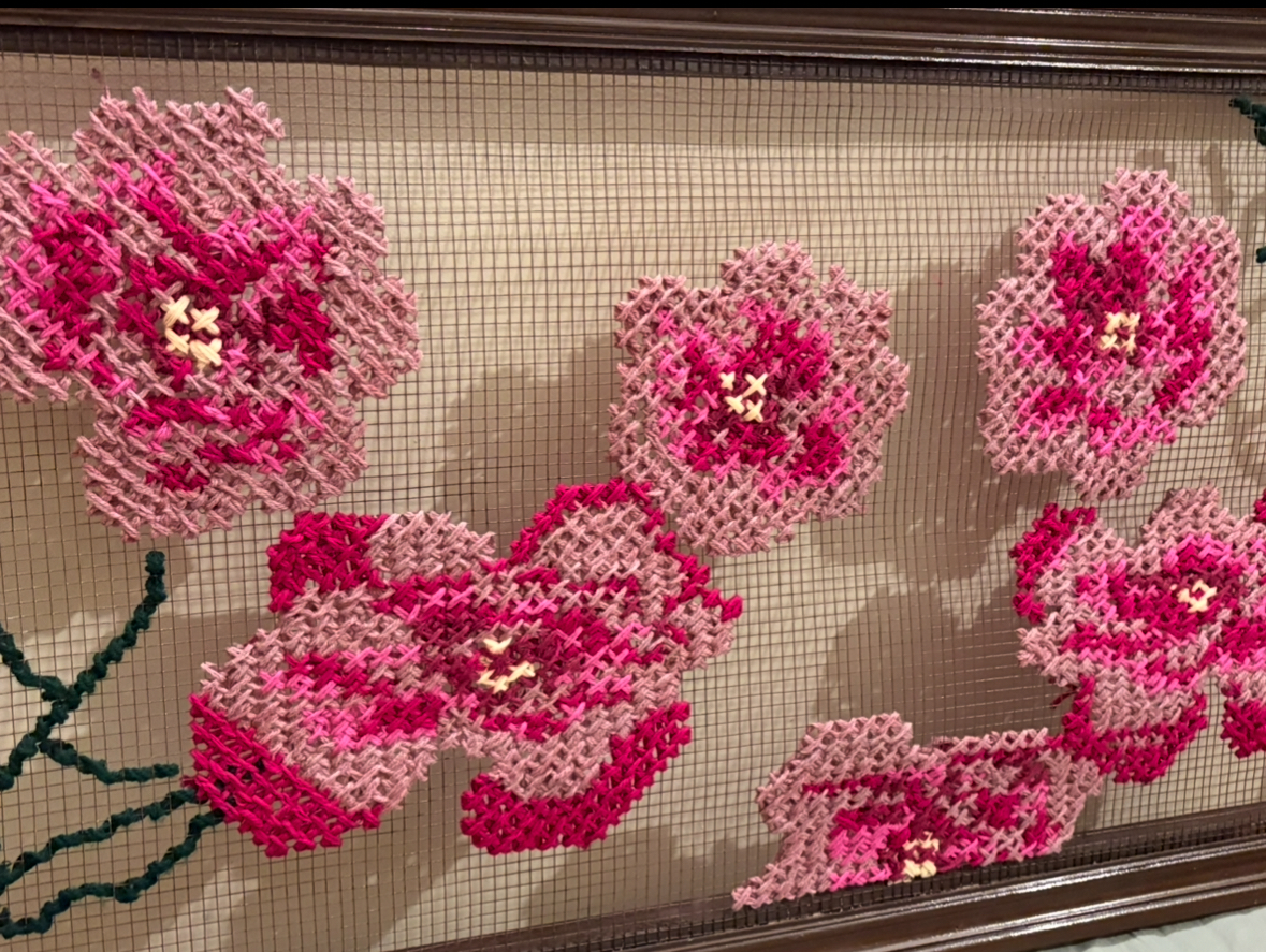 This decorative frame features vibrant pink flowers hand-embroidered in cross-stitch onto a fine mesh base. The piece blends traditional technique with a modern display style, framed in dark wood. A unique wall or accent piece, originally created as part of a textile thesis project.
