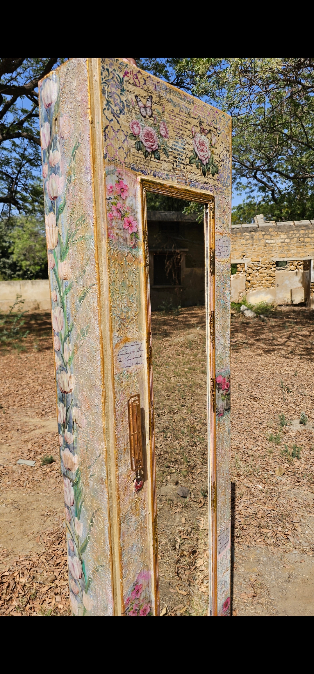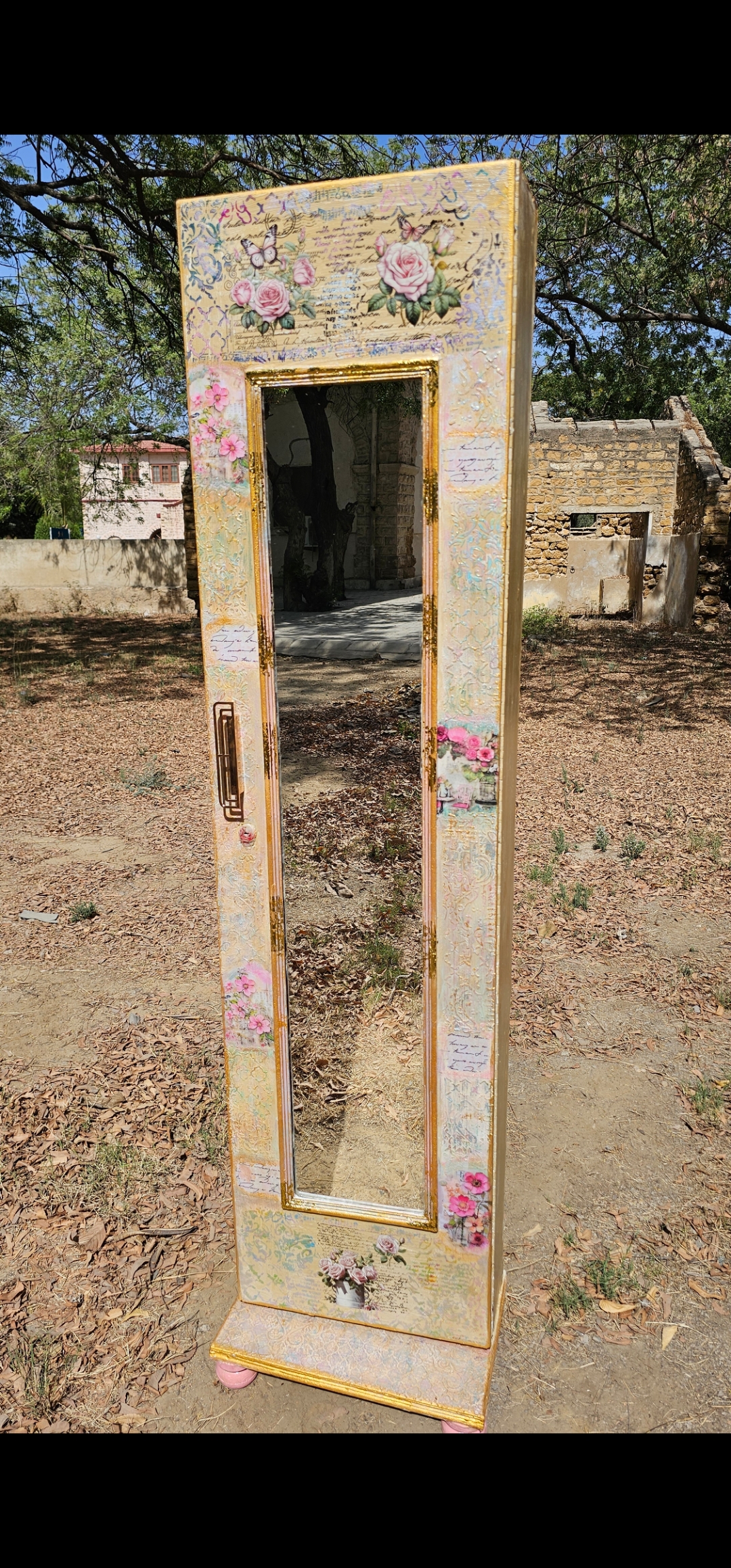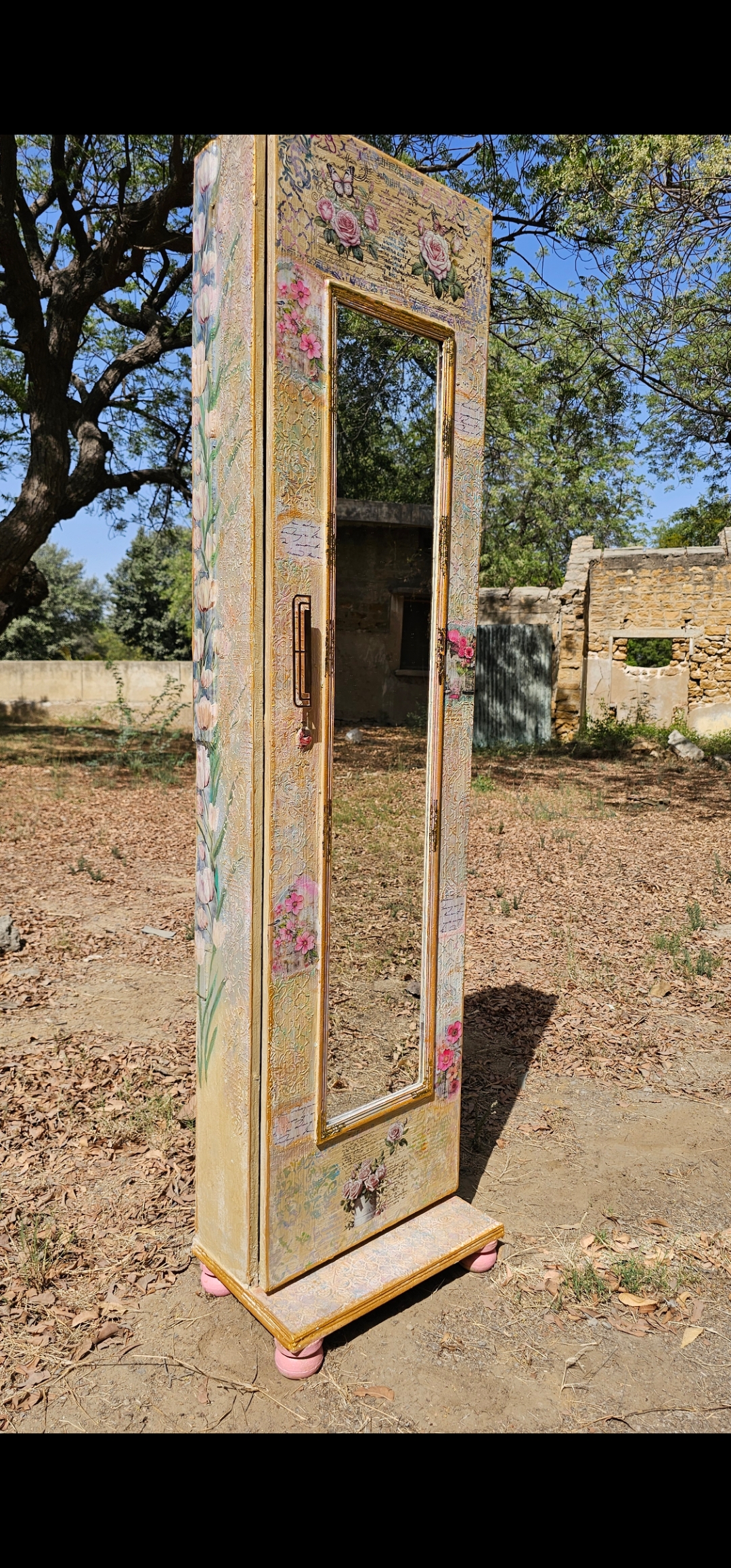 Storage mirrored cabinet painted in chalk paint using decoupage technique with texture paste and stenciling to achieve a dreamy art piece for a girl’s bedroom to store jewelry, perfumes, makeup accessories etc.