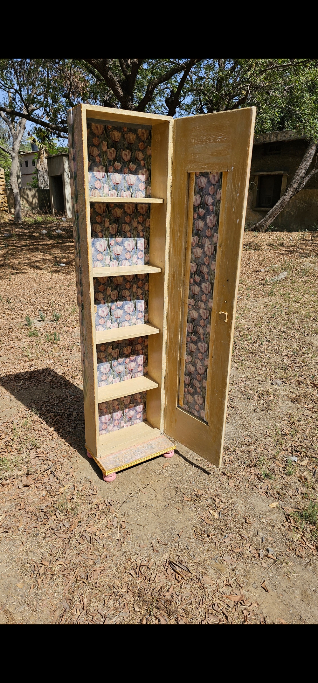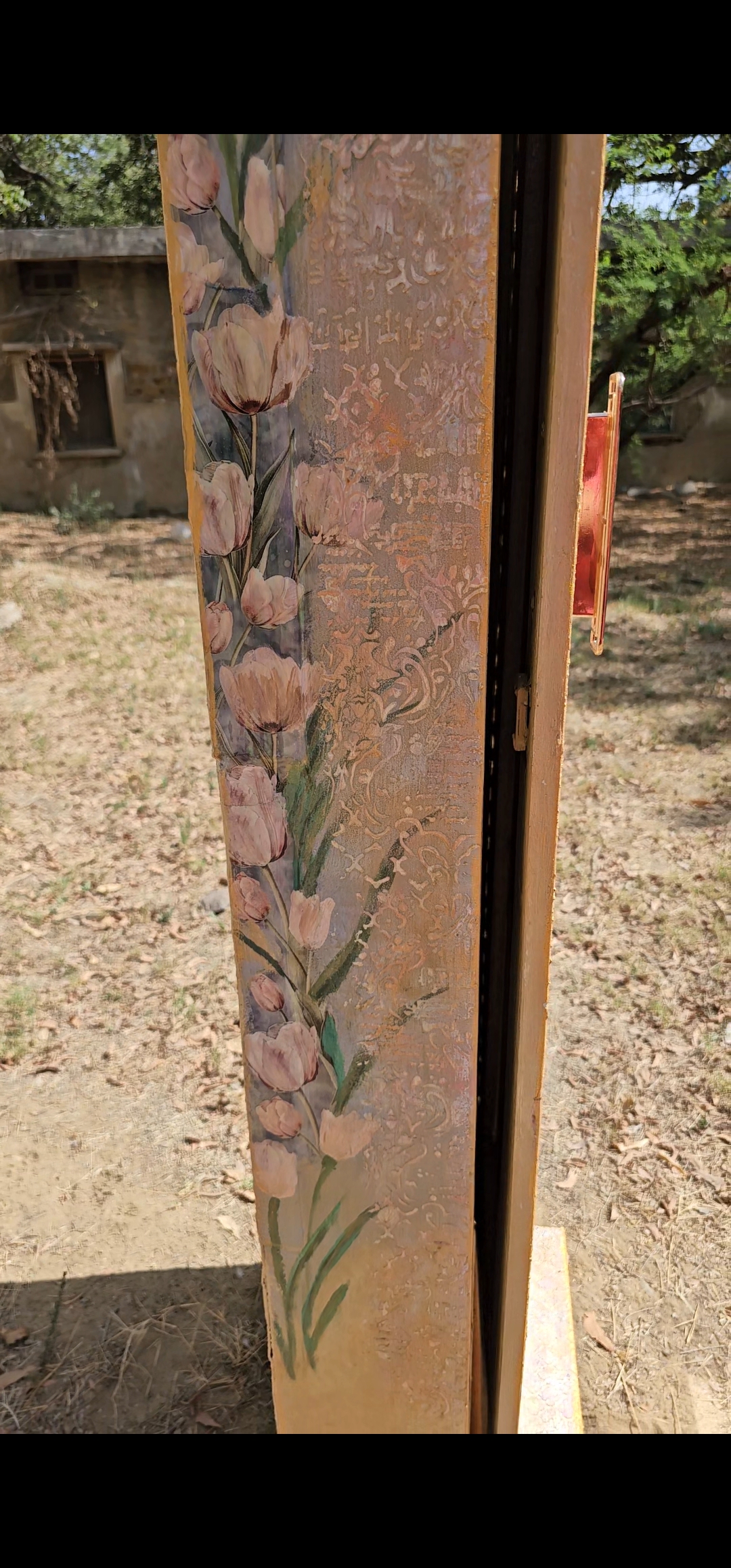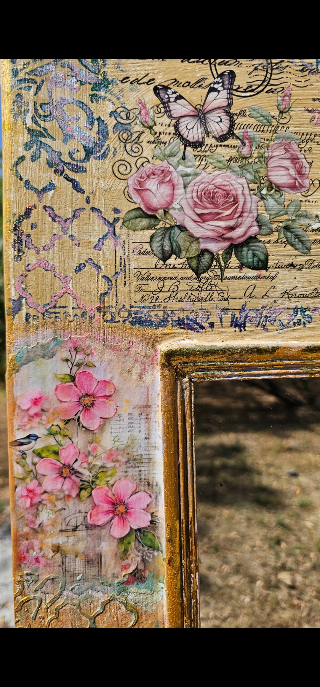 Storage mirrored cabinet painted in chalk paint using decoupage technique with texture paste and stenciling to achieve a dreamy art piece for a girl’s bedroom to store jewelry, perfumes, makeup accessories etc.