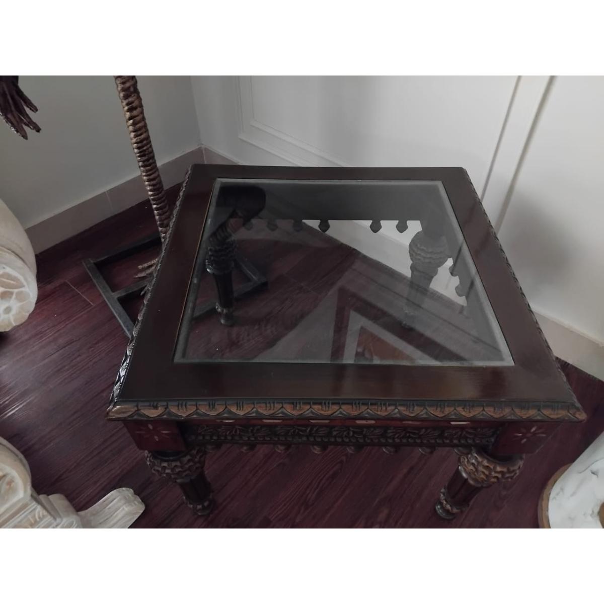 Add timeless elegance to your living space with this beautifully handcrafted center table set. Made from premium Sheesham wood, the set includes one large center table and two matching side tables, each topped with a durable glass surface. The intricate floral carvings, beadwork accents, and traditional turned legs reflect fine craftsmanship inspired by Mughal-era artistry.