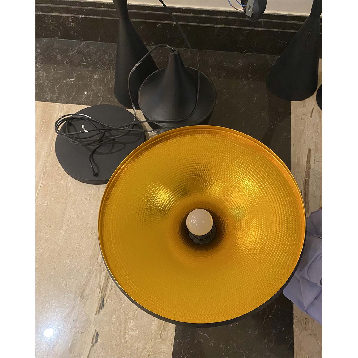 Modern 3 bulb hanging light in black outer metal in 3 different shapes and inner beaten gold finish.