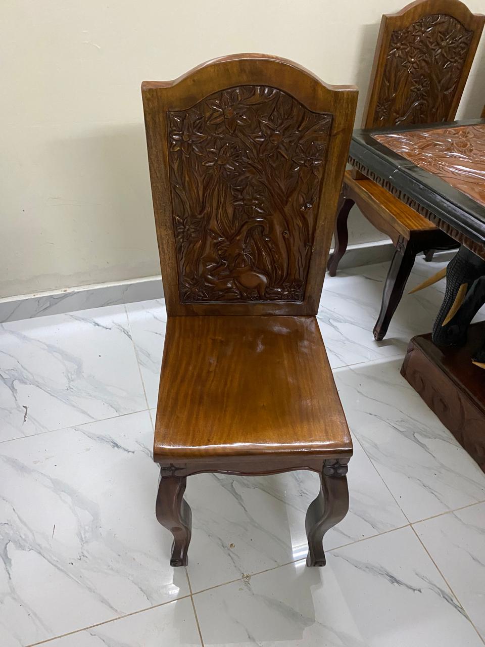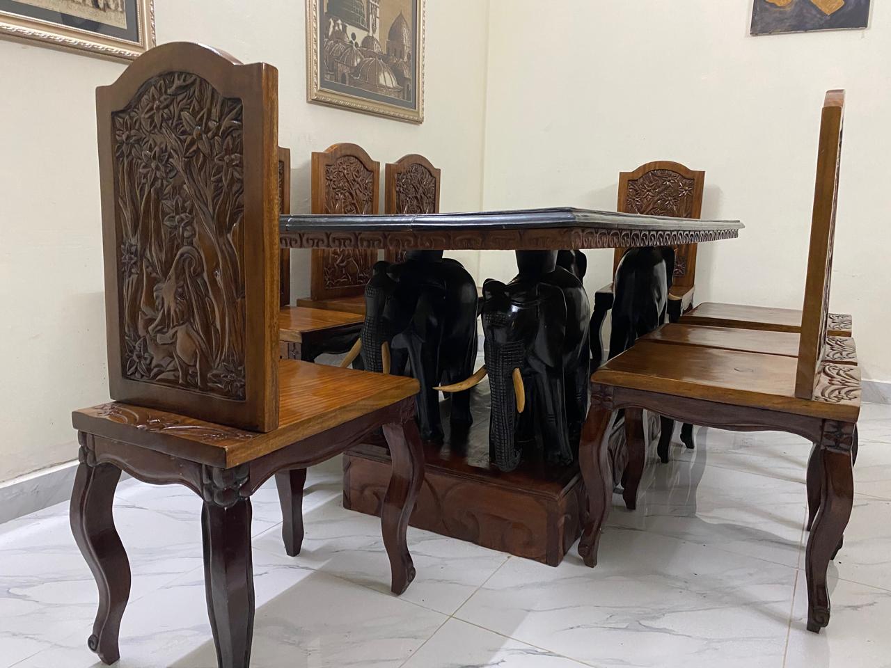 Hand carved dining table made from Cashew wood imported from Ivory Coast. The dinning table top is resting on four wooden elephants. Comes with 8 wooden dining chairs.