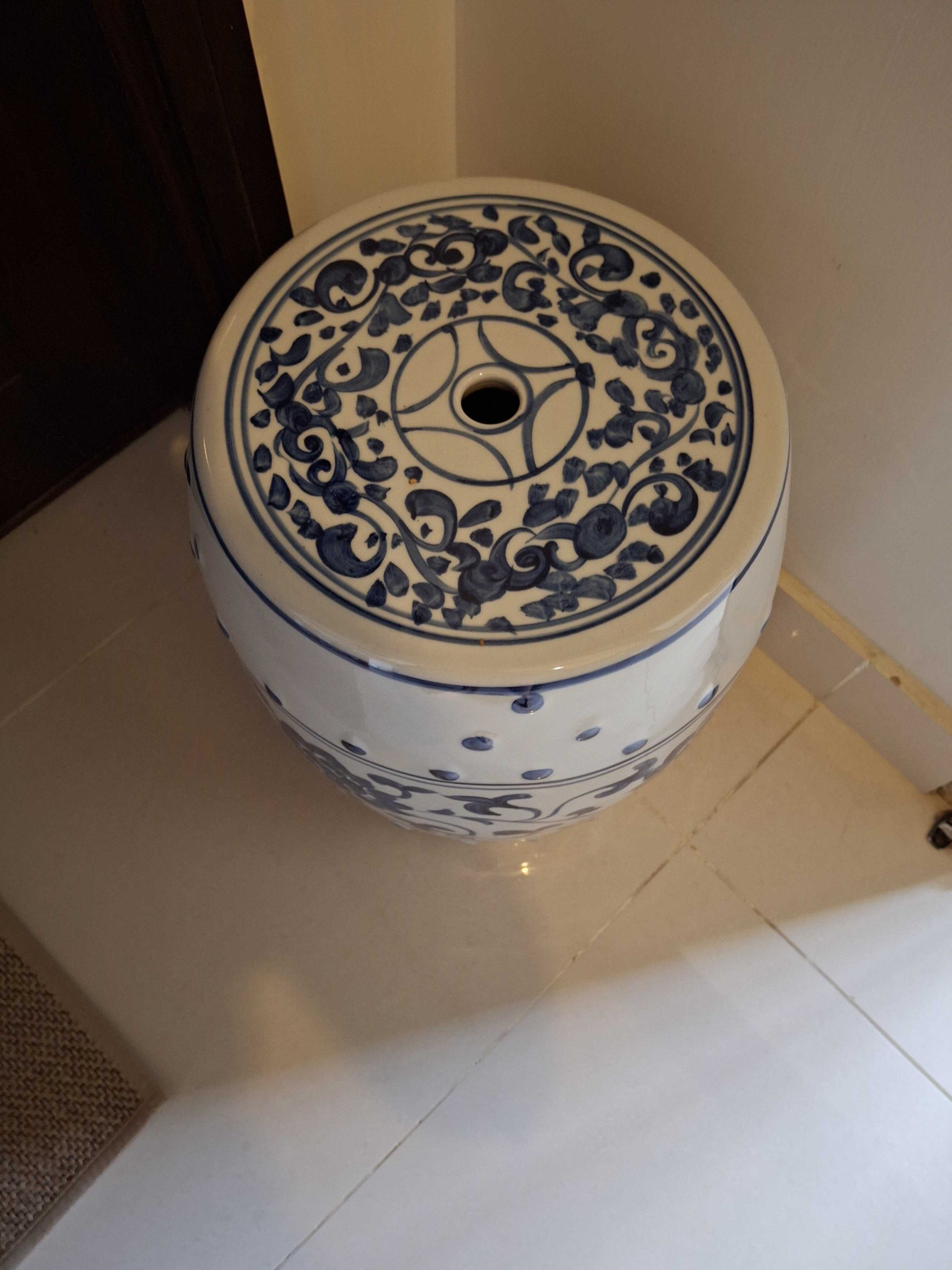 Imported ceramic stool in blue and white floral design, originally purchased from Malaysia. Can be used as a corner stand for a plant or as a side table.